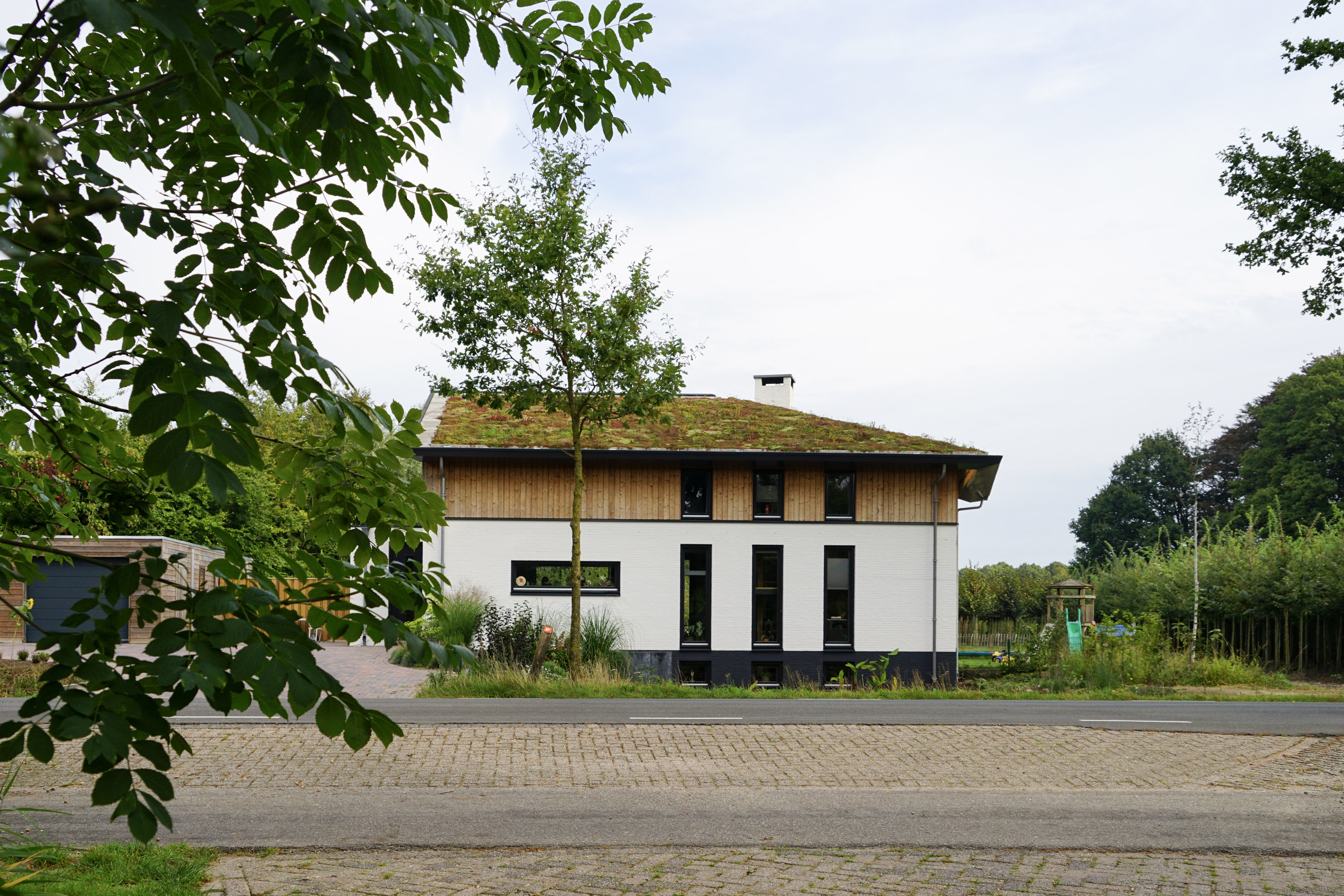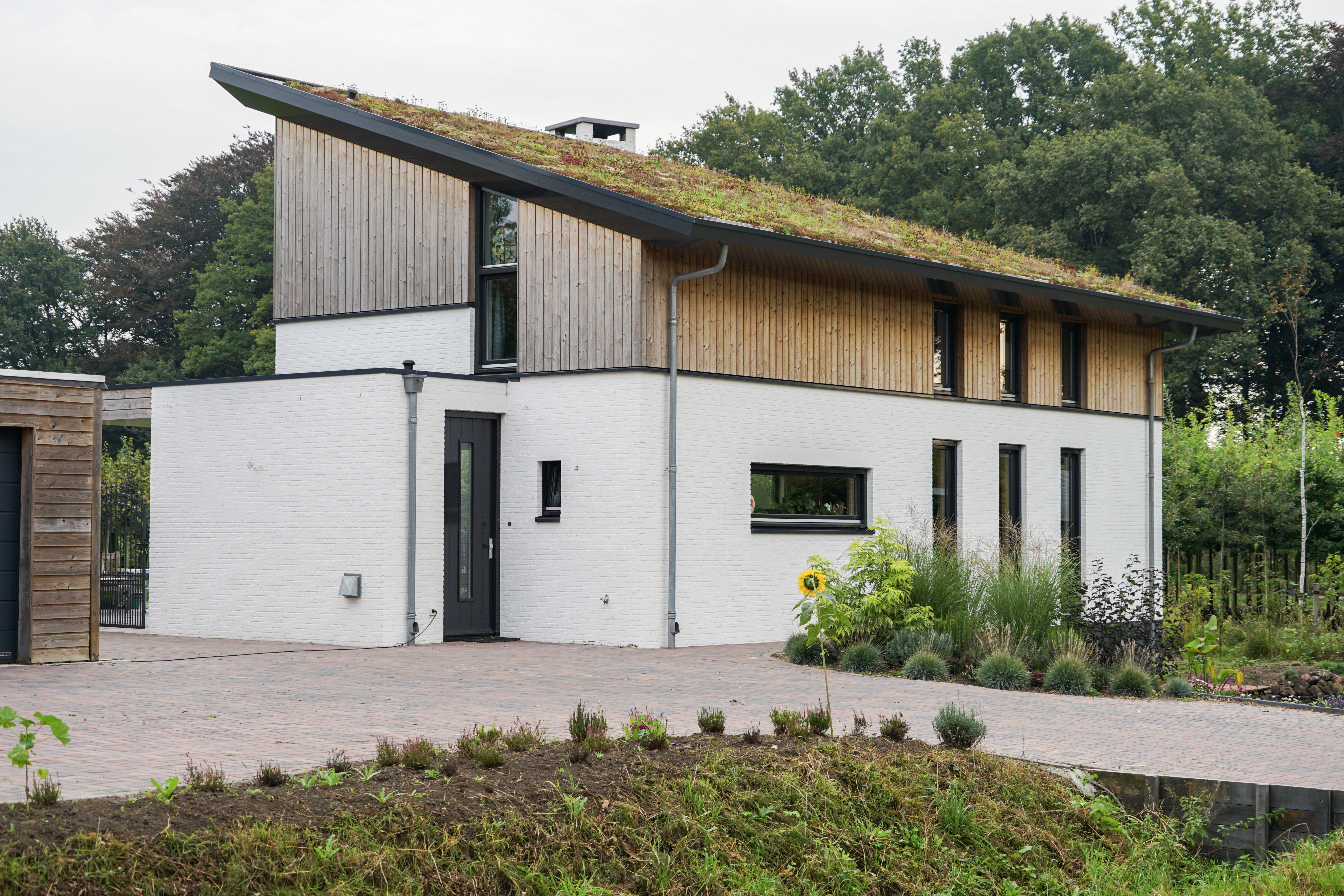 Duurzame woning met houten gevels, groendak en dakoverstek