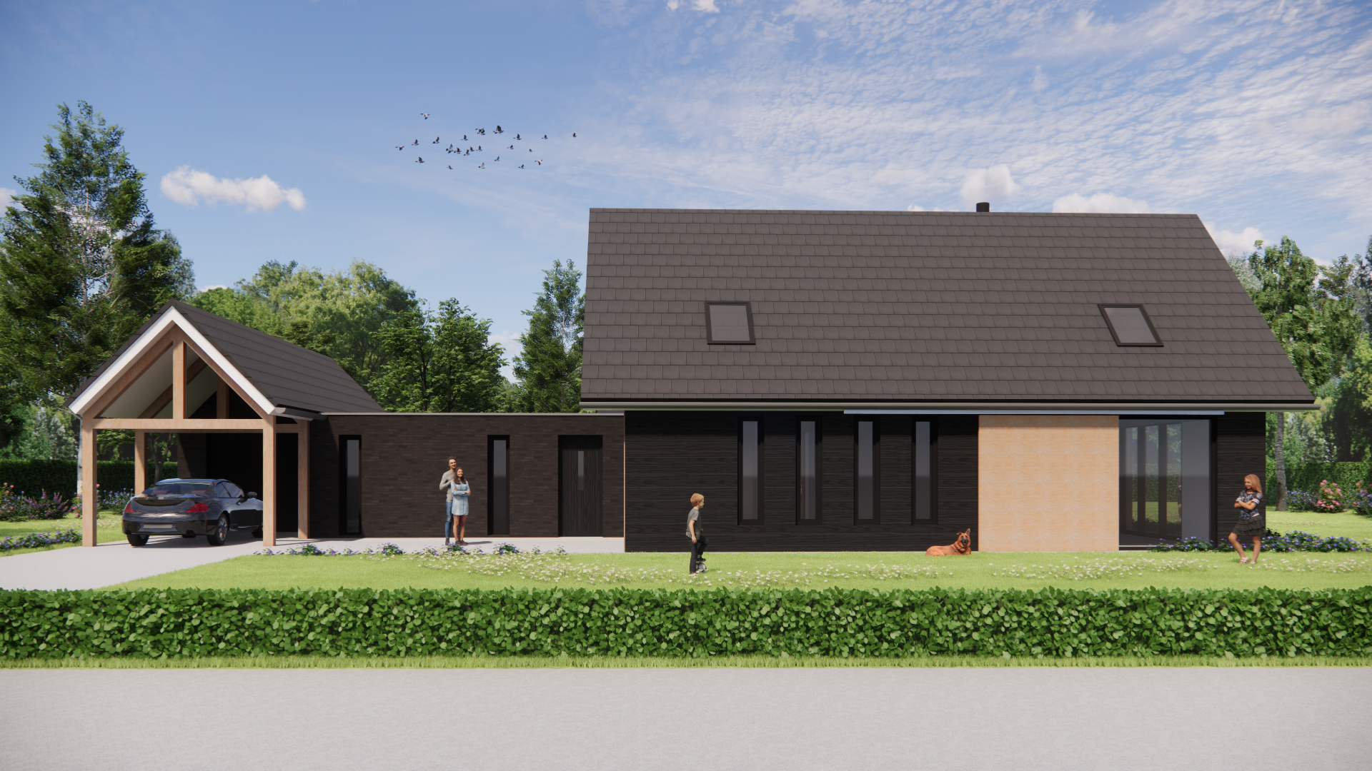 Dit ontwerp combineert moderne elementen met landelijke charme. De houten gevel, opvallende dakoverstek en luiken geven het geheel een warme, uitnodigende uitstraling. De vlakke dakpannen accentueren het traditionele zadeldak en zorgen voor een eigentijdse twist. De woning past harmonieus in het landelijke landschap en vormt een stijlvolle brug tussen oud en nieuw.