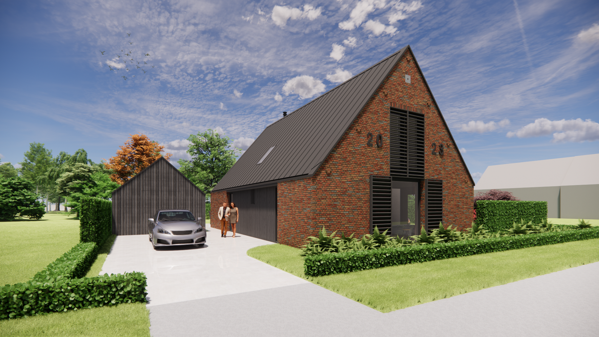 Deze vrijstaande schuurwoning combineert eigentijdse architectuur met de rust en ruimte van een landelijke omgeving. Het opvallende zadeldak, afgewerkt met felsplaat, geeft de woning een moderne en strakke uitstraling. Subtiele houten accenten en buiten shutters zorgen tegelijkertijd voor een warme en natuurlijke uitstraling.