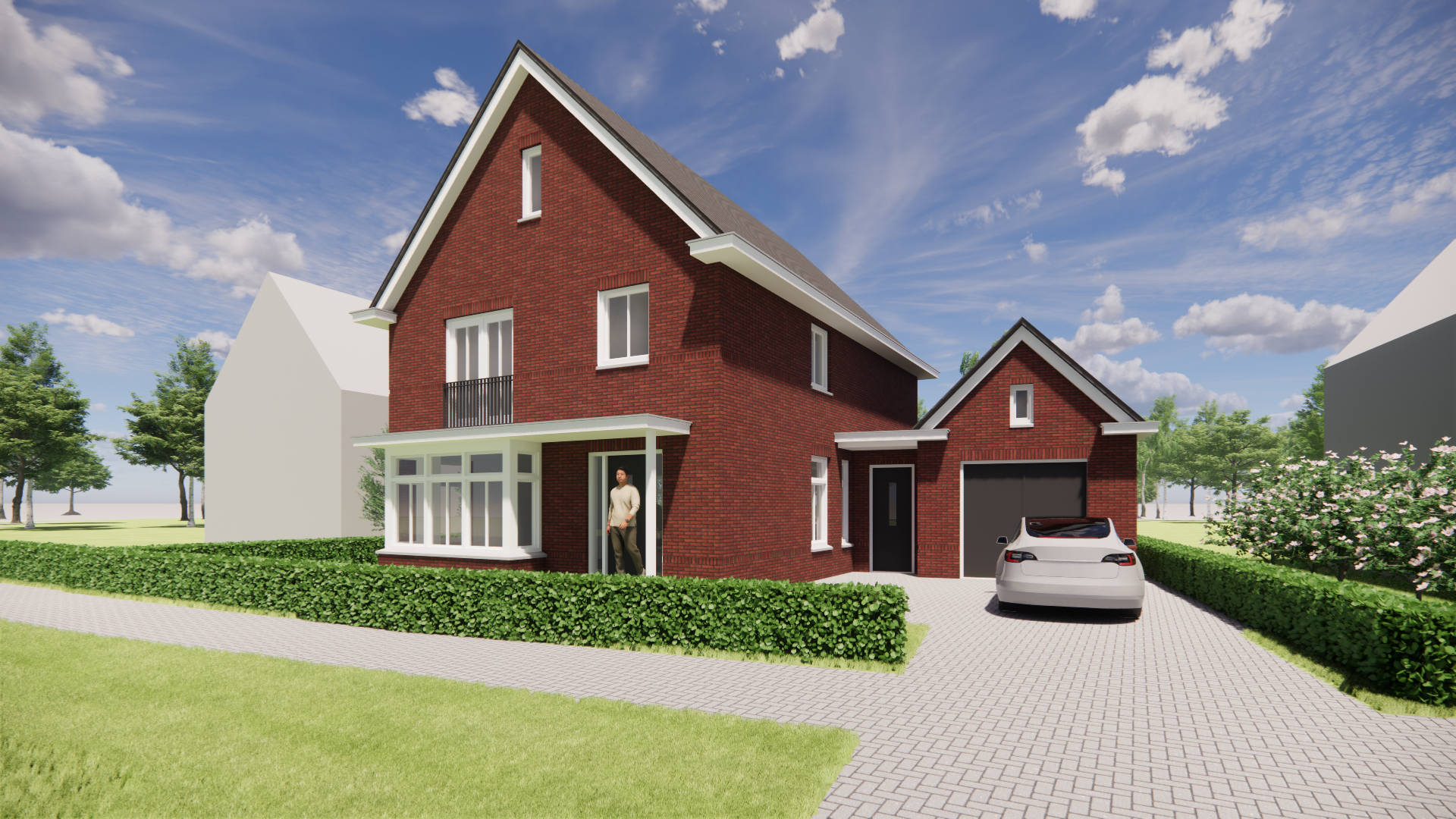 De overdekte entree verwelkomt je op een prettige en beschutte manier. Dit soort details maken het ontwerp niet alleen mooi, maar vooral ook praktisch en comfortabel. Precies die combinatie van traditionele architectuur en eigentijds wooncomfort maakt dit ontwerp zo bijzonder.