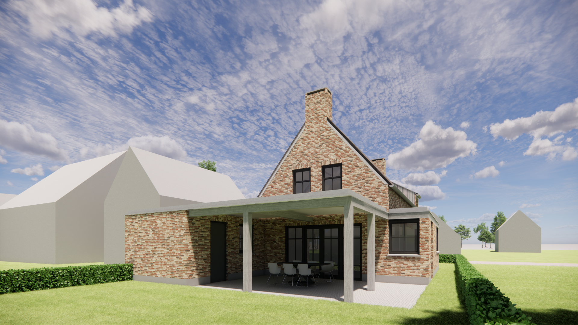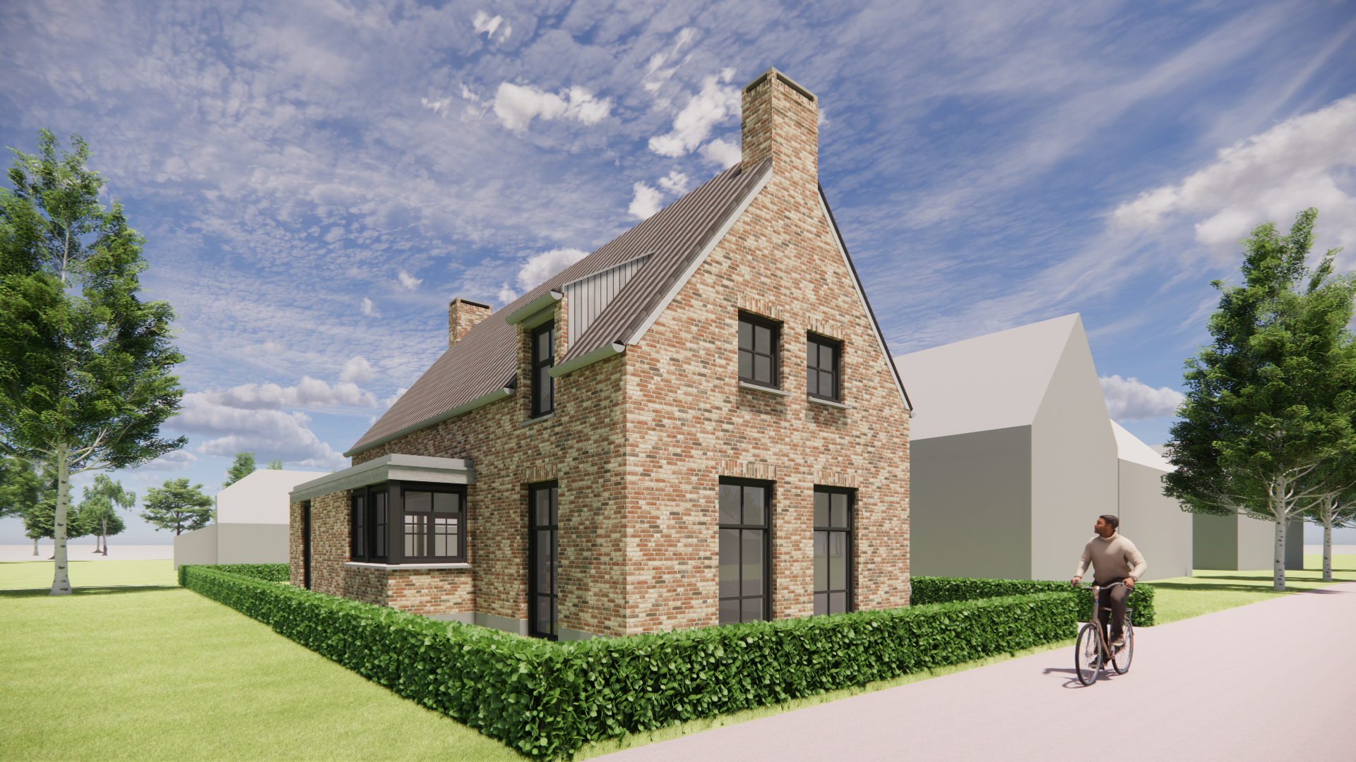 Deze karakteristieke woning ademt de sfeer van de Kempen. De gevels zijn opgetrokken uit metselwerk en worden subtiel afgewerkt met een cementplint. De gegolfde dakpannen en het traditionele zadeldak versterken het landelijke karakter. Opvallende details zoals de houten balken, een royale dakkapel en een uitnodigende erker zorgen voor een warme uitstraling en meer beleving rondom de woning.