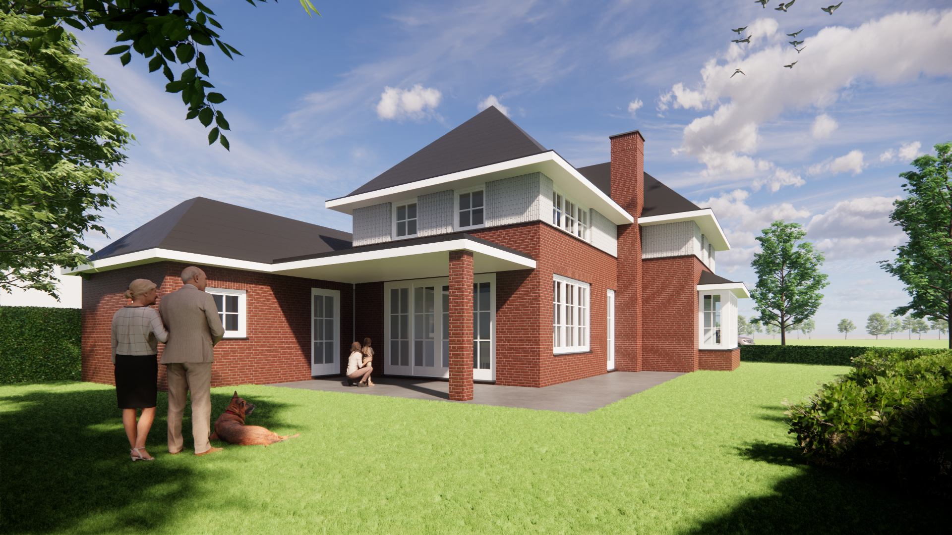 Deze woning combineert klassieke vormen met een eigentijdse uitstraling. Het schilddak met vlakke dakpannen, de metselwerk gevels en de karakteristieke erker geven het huis een statige, vertrouwde uitstraling. De betimmerde goot en het ruime dakoverstek zorgen voor verfijning in de details. Onder de overkapping aan de achterzijde ontstaat een beschutte plek waar je elk seizoen kunt genieten van het buitenleven.