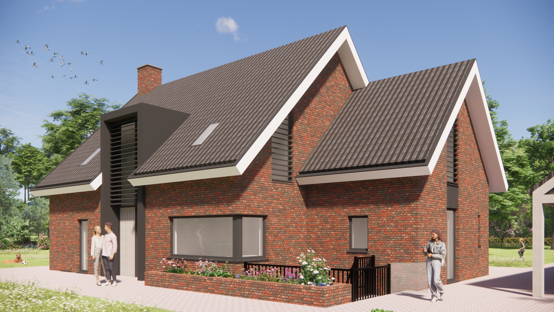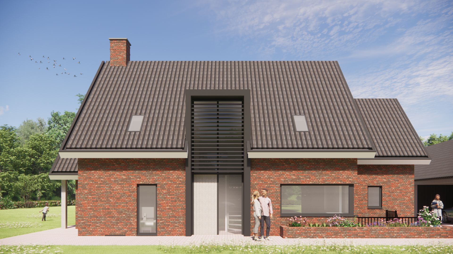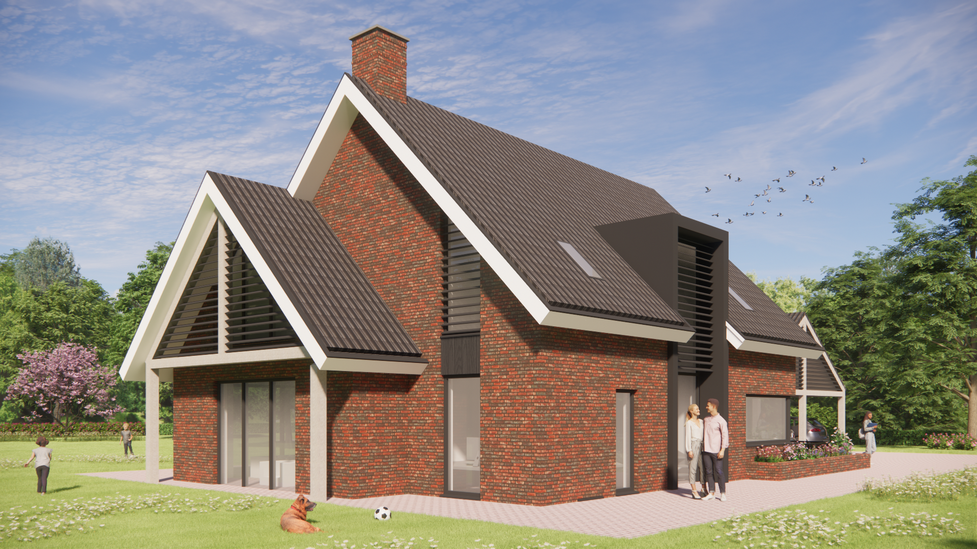 Dit ruime landhuis ademt rust en karakter. De gevels van metselwerk worden verzacht door houten accenten, robuuste balken en subtiele details zoals buiten shutters en een fraai hoekkozijn. Het hoge zadeldak met gegolfde pannen en brede overstekken maakt het silhouet krachtig en vertrouwd. De combinatie van een risaliet, dakkapel en schoorsteen zorgt voor een huis dat direct opvalt én past in zijn landelijke omgeving.