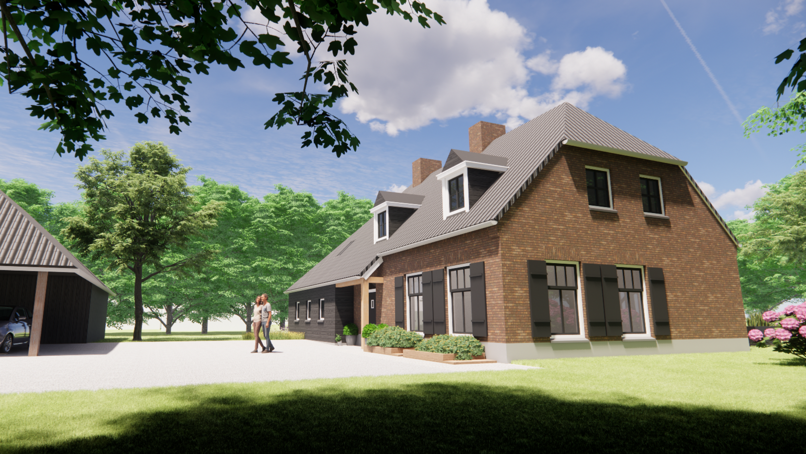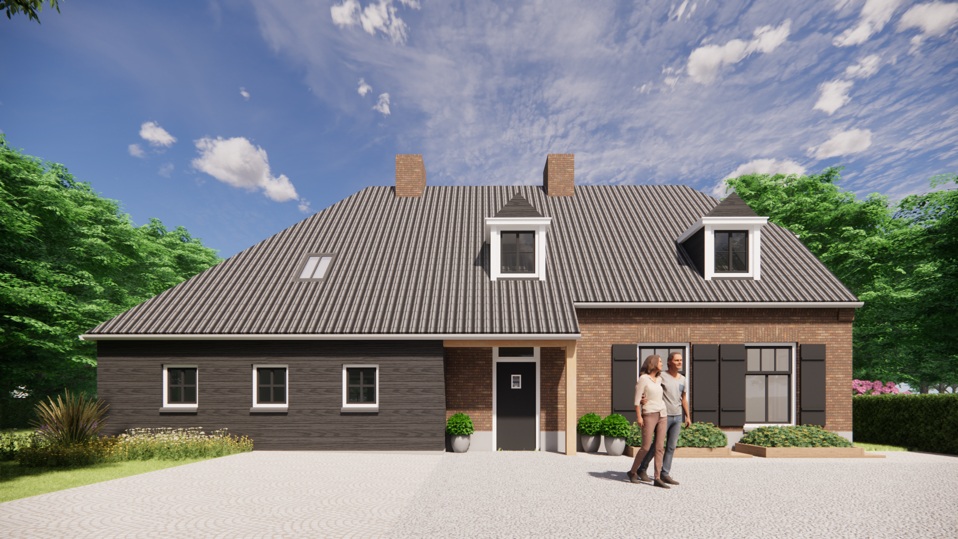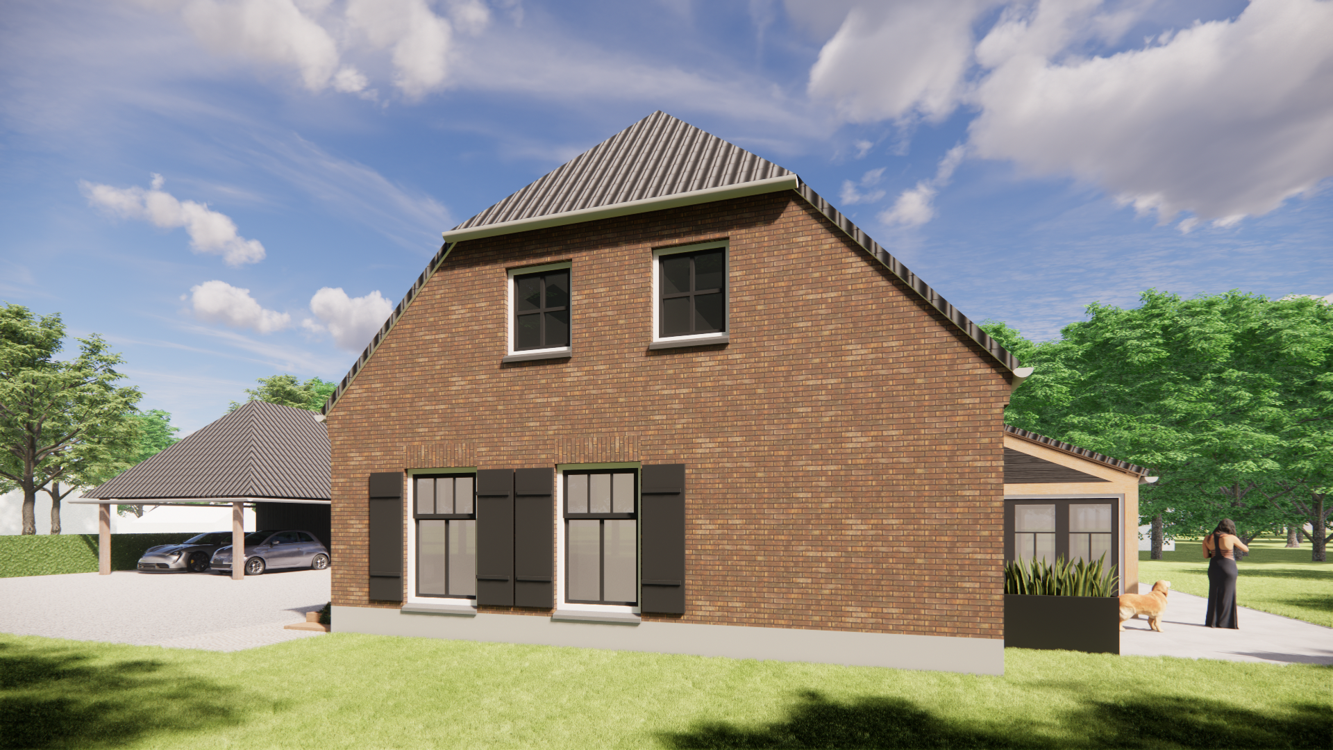 Dit vrijstaande nieuwbouw woonhuis ademt het landelijke karakter van een boerderij. Traditioneel gebouwd in metselwerk op een cementplint, met houten accenten, luiken en een schoorsteen. Het wolfsdak met gegolfde dakpannen en de dakkapel geven het silhouet rust en herkenning. De overdekte entree en het overdekte terras zorgen voor een prettige overgang tussen binnen en buiten. Het ontwerp is levensloopbestendig, met aandacht voor comfort op de lange termijn.