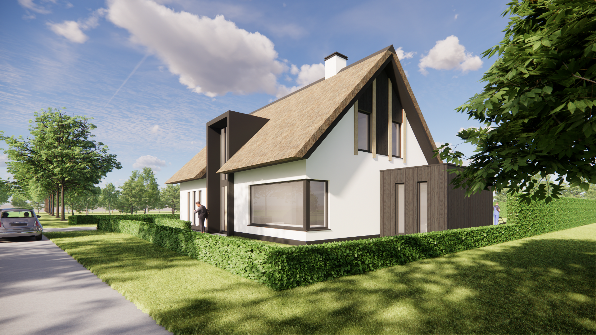 Deze woning combineert een heldere vormtaal met natuurlijke materialen. Het traditionele zadeldak is bekleed met riet, wat warmte en karakter toevoegt. Daaronder zorgen strakke witte gevels en houten details voor een eigentijdse uitstraling. De woning staat vrij op een ruim perceel, met volop ruimte rondom voor uitzicht, rust en privacy.