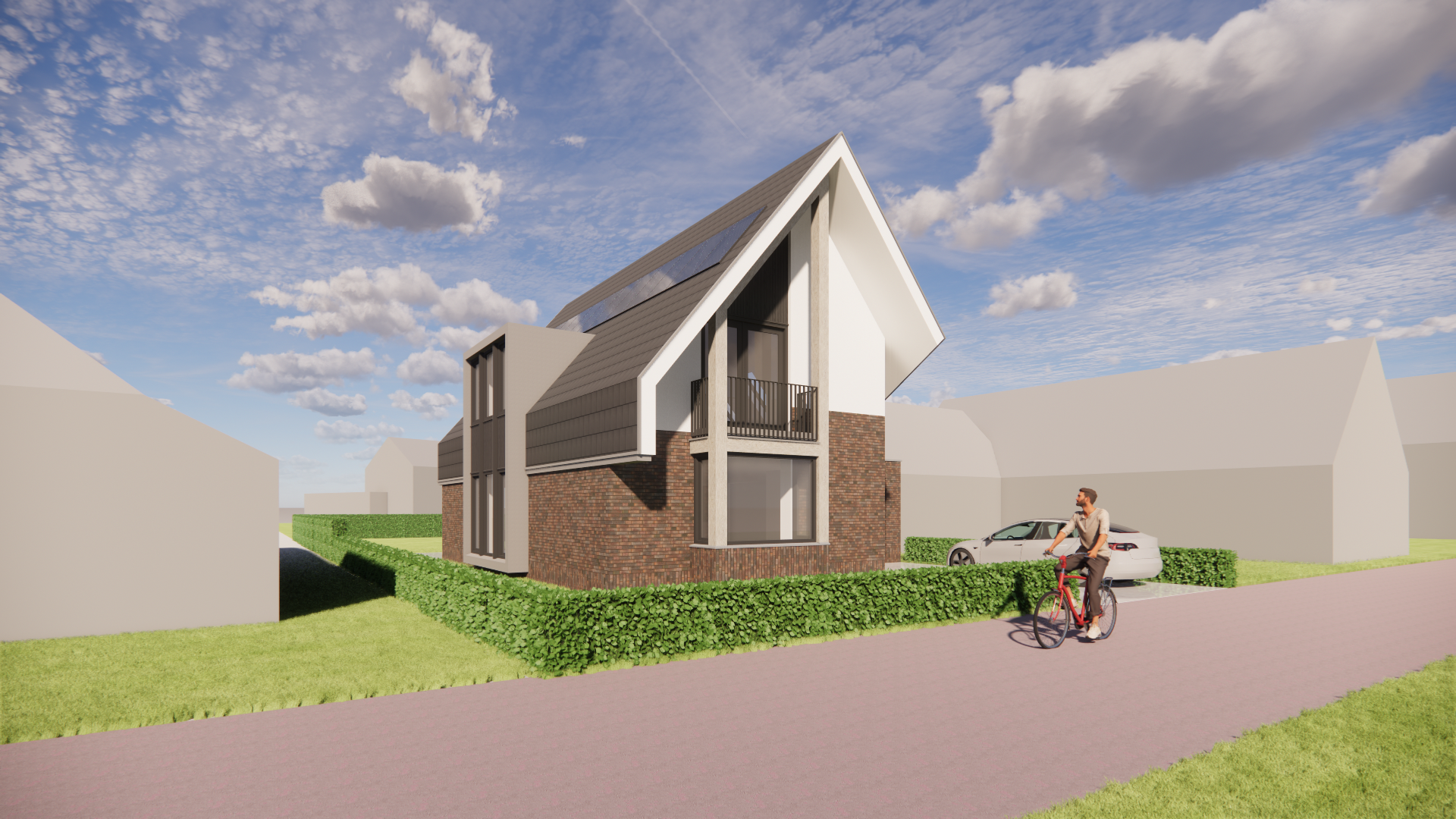Deze eigentijdse woning valt direct op door het heldere lijnenspel en het traditionele zadeldak, afgewerkt met vlakke dakpannen. De gevels van metselwerk krijgen extra karakter door de toepassing van risalieten en pleisterwerk accenten. Houten balken aan de buitenzijde verzachten het geheel en geven de woning een warme uitstraling.
