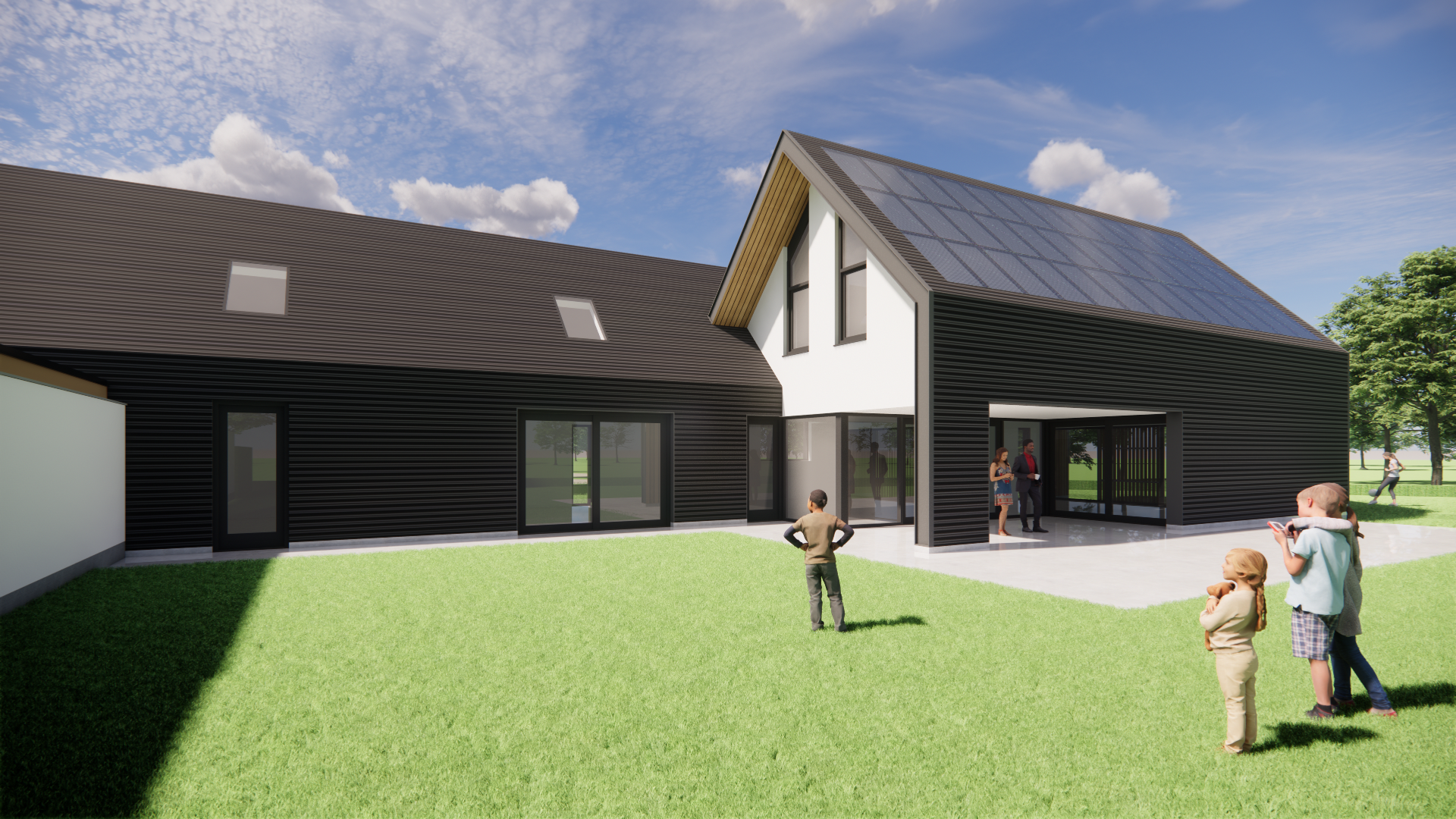 Deze eigentijdse schuurwoning combineert een krachtige vormentaal met een ingetogen materiaalgebruik. De combinatie van pleisterwerk en donkere golfplaten geeft het huis een stoer, maar ingetogen karakter dat past bij de landelijke omgeving. Het diepe zadeldak met royale overstekken, subtiele koekoek en zichtbare schoorsteen zorgen voor een vertrouwd silhouet, maar dan in een moderne jas.