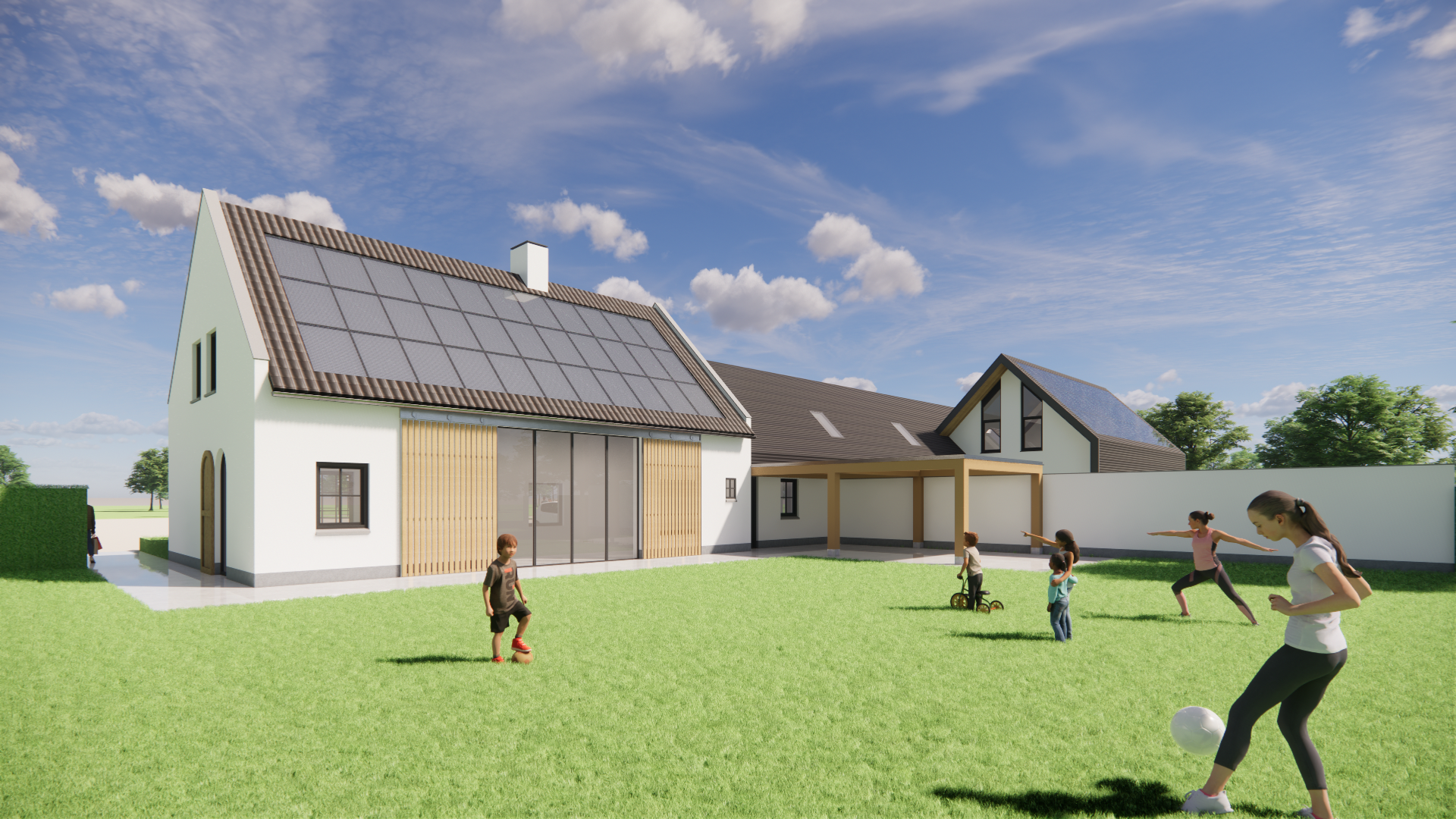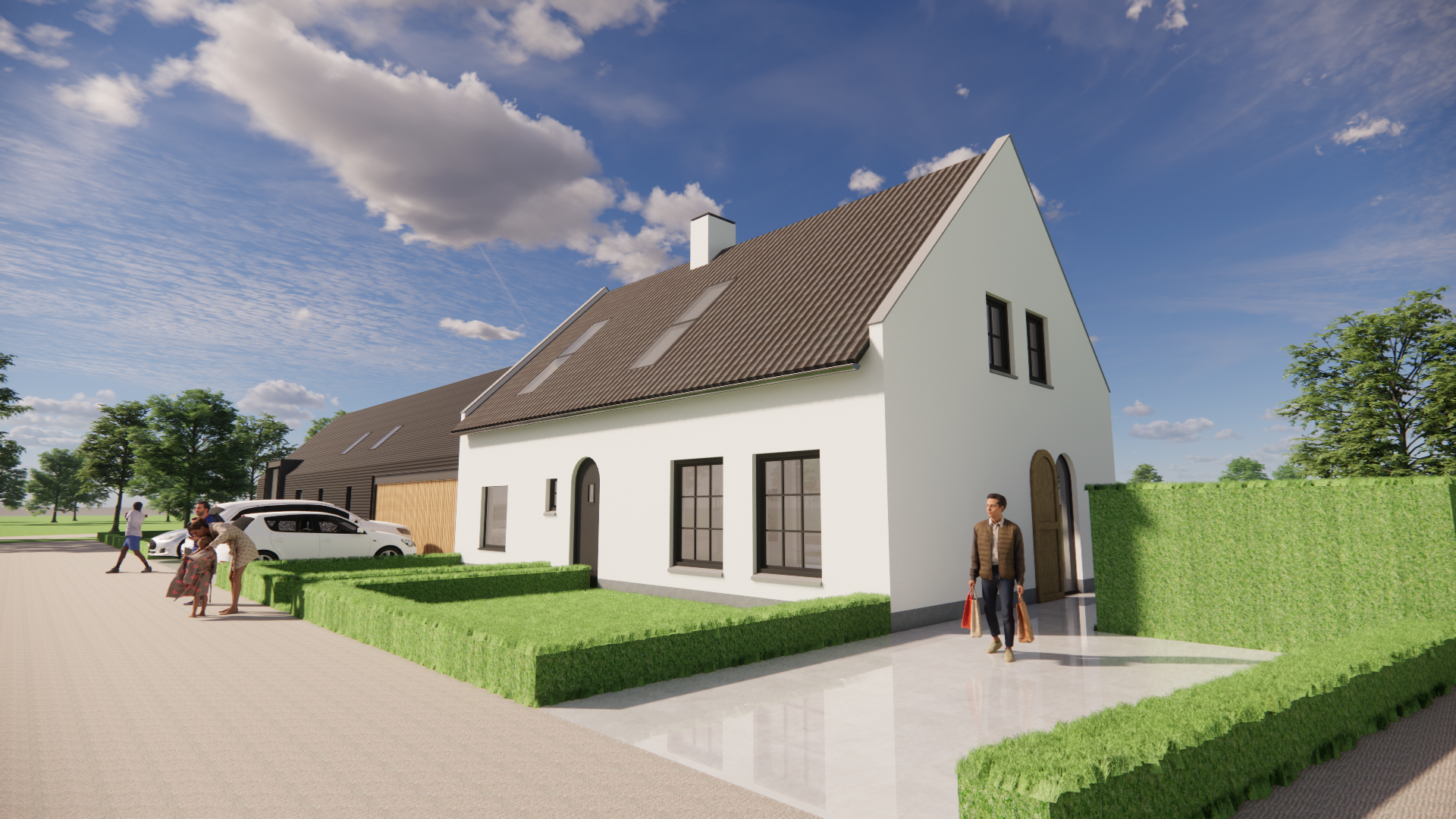 Elk detail is doordacht: van het kookeiland in de ruime keuken tot de luiken aan de gevels. De cementplint rond het volume voegt een subtiele belijning toe die het geheel visueel verankert. De woning biedt niet alleen comfort, maar ook flexibiliteit voor de toekomst. Het overdekte terras nodigt uit tot lange avonden buiten.