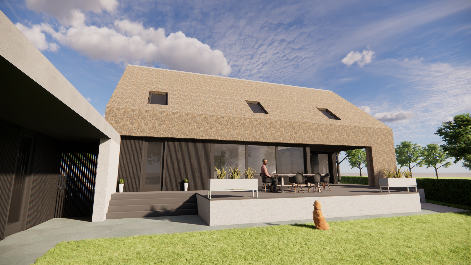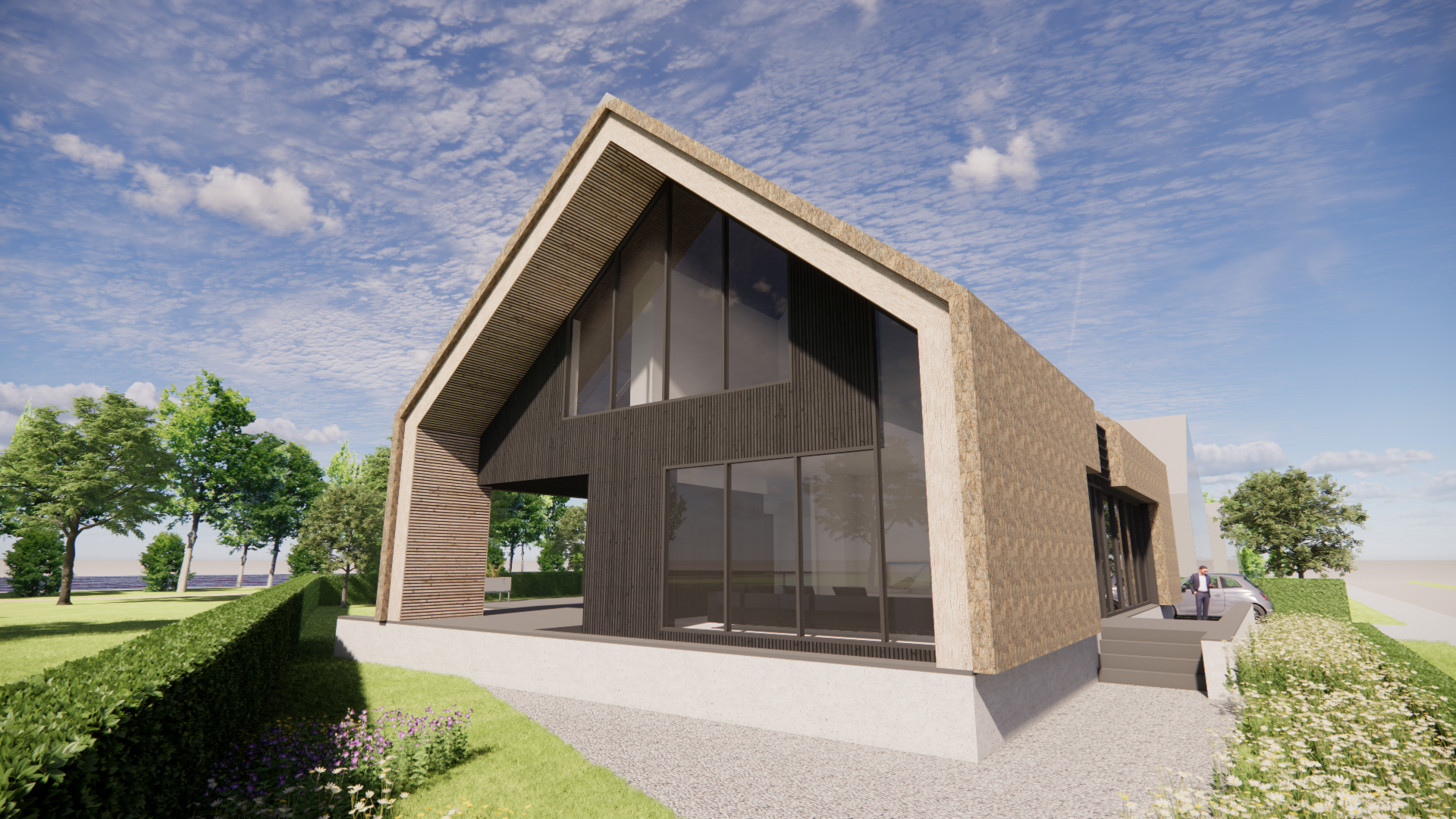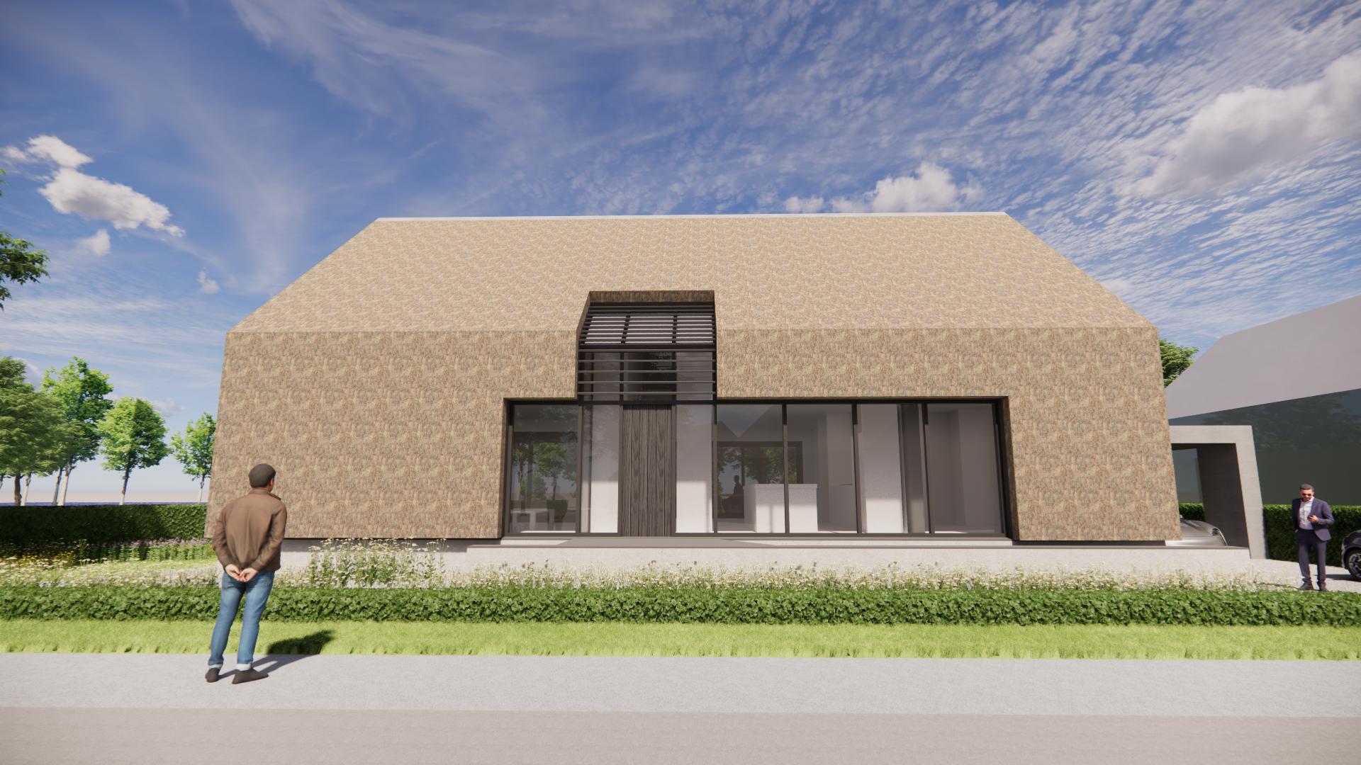 Op een royaal perceel van 792 m² staat deze vrijstaande woning met een uitgesproken eigentijdse uitstraling. Het ontwerp combineert een modern volume met een traditioneel zadeldak, uitgevoerd in riet. In combinatie met de houten gevels en verfijnde details zoals het doorlopende kozijn in het dak, ontstaat een krachtig geheel dat direct in het oog springt.