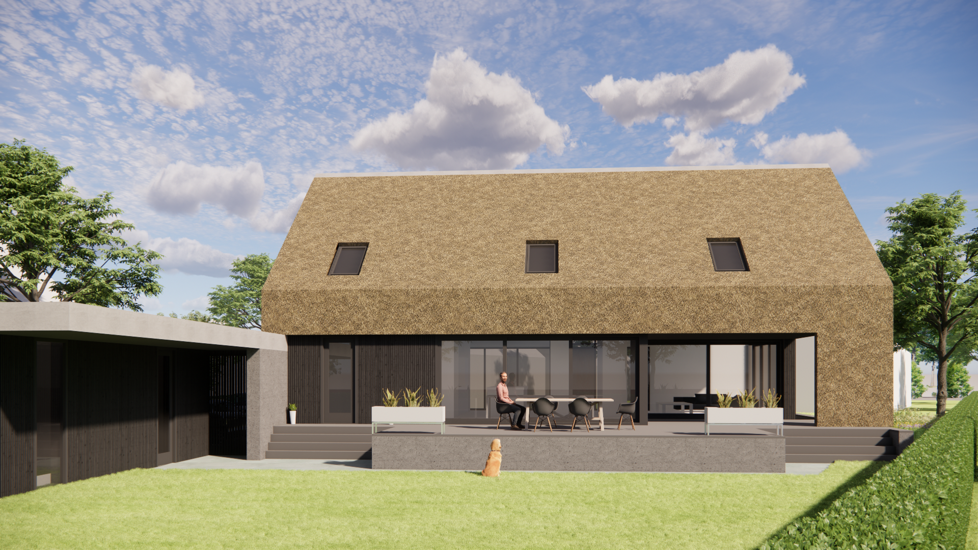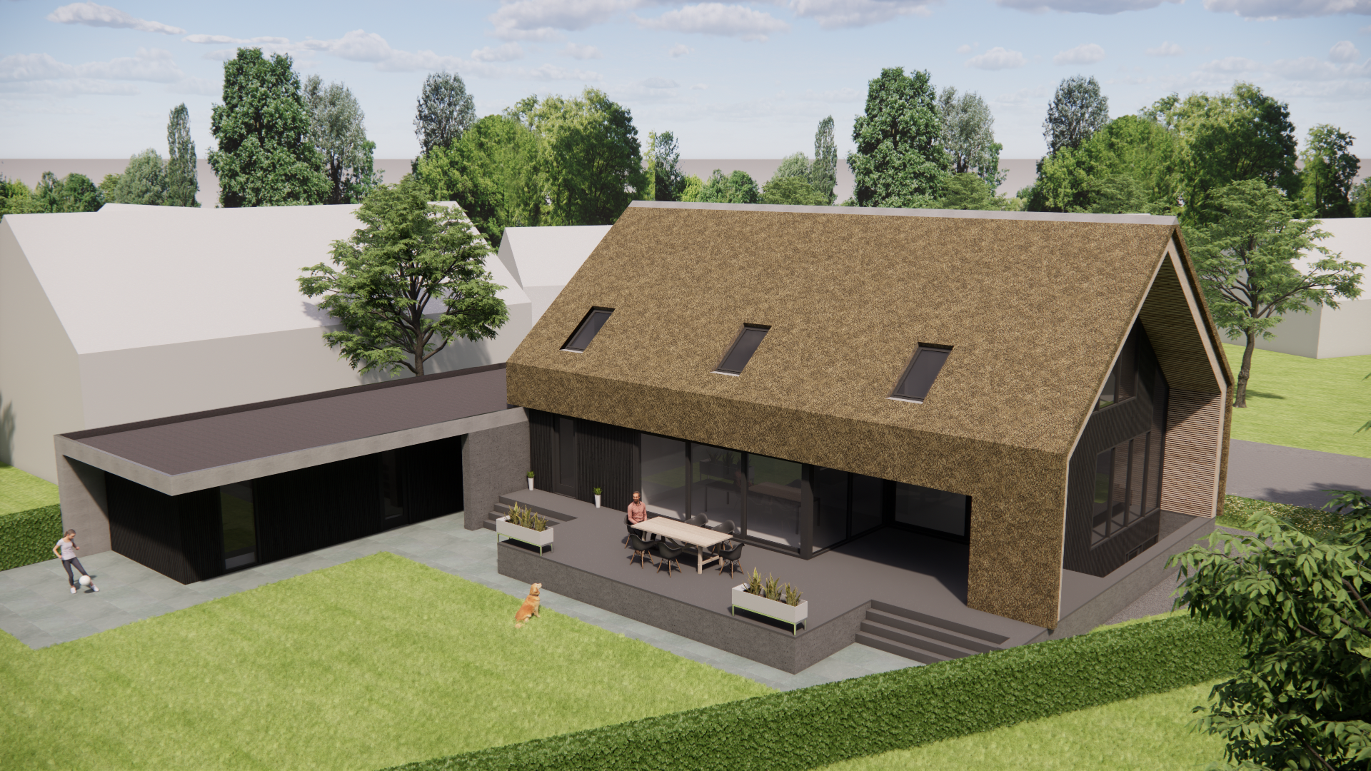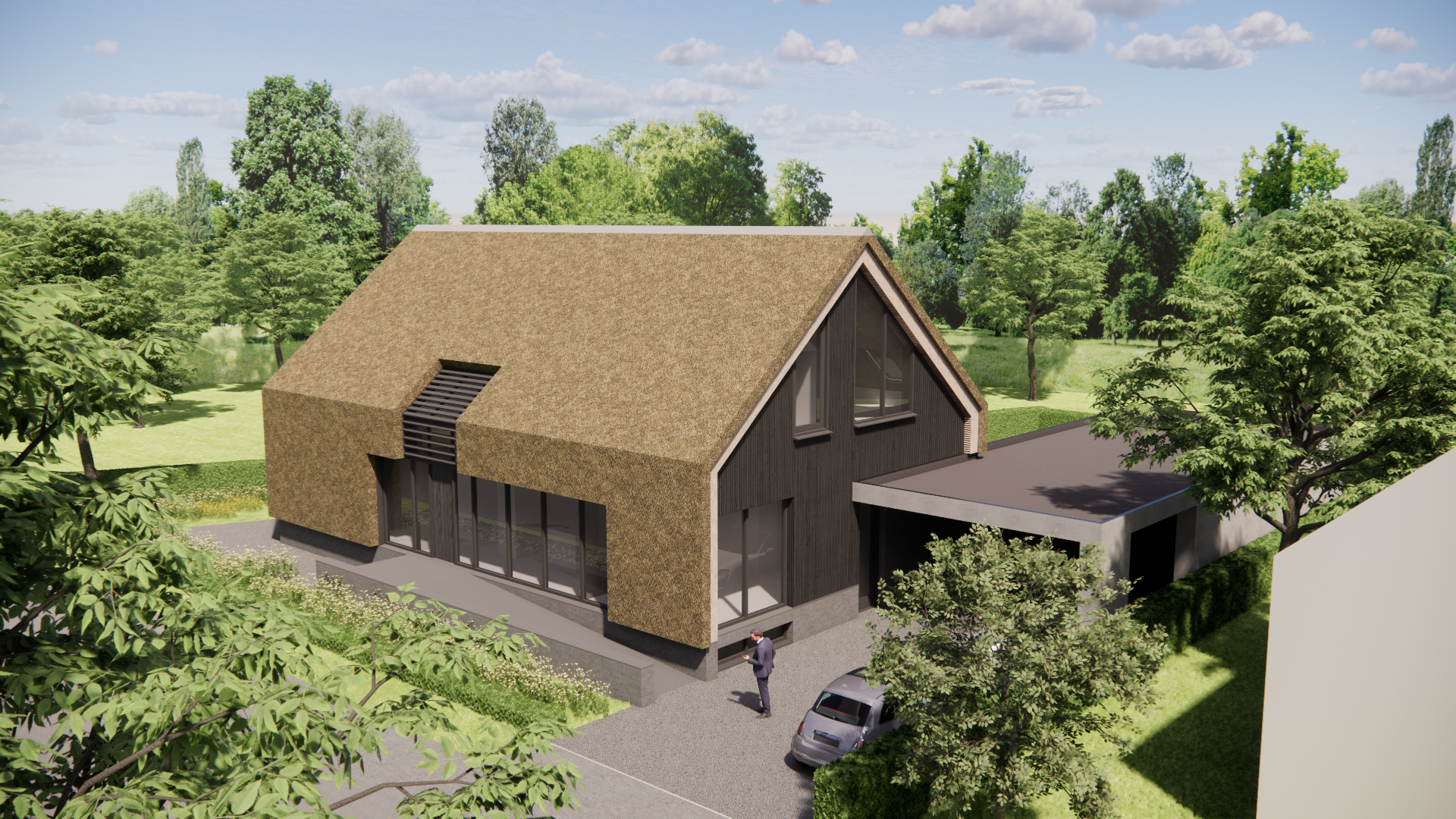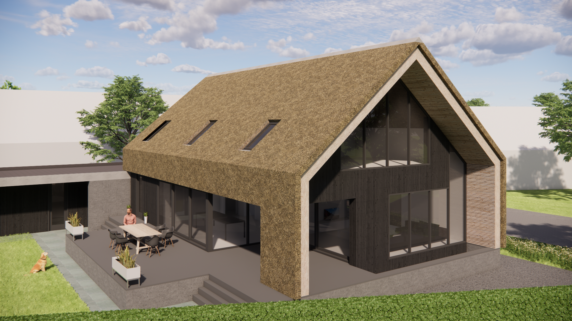 Op een royaal perceel van 792 m² staat deze vrijstaande woning met een uitgesproken eigentijdse uitstraling. Het ontwerp combineert een modern volume met een traditioneel zadeldak, uitgevoerd in riet. In combinatie met de houten gevels en verfijnde details zoals het doorlopende kozijn in het dak, ontstaat een krachtig geheel dat direct in het oog springt.