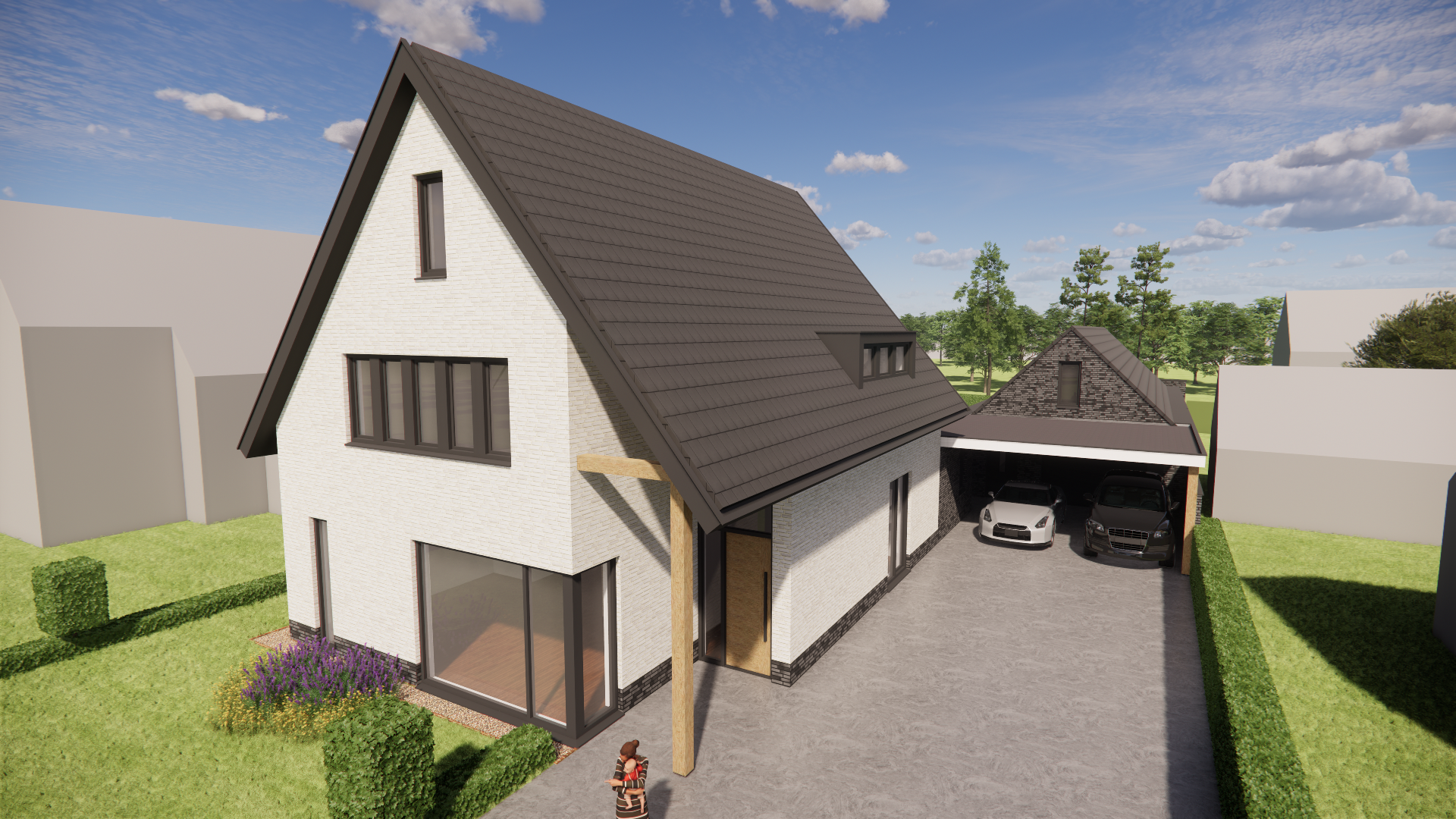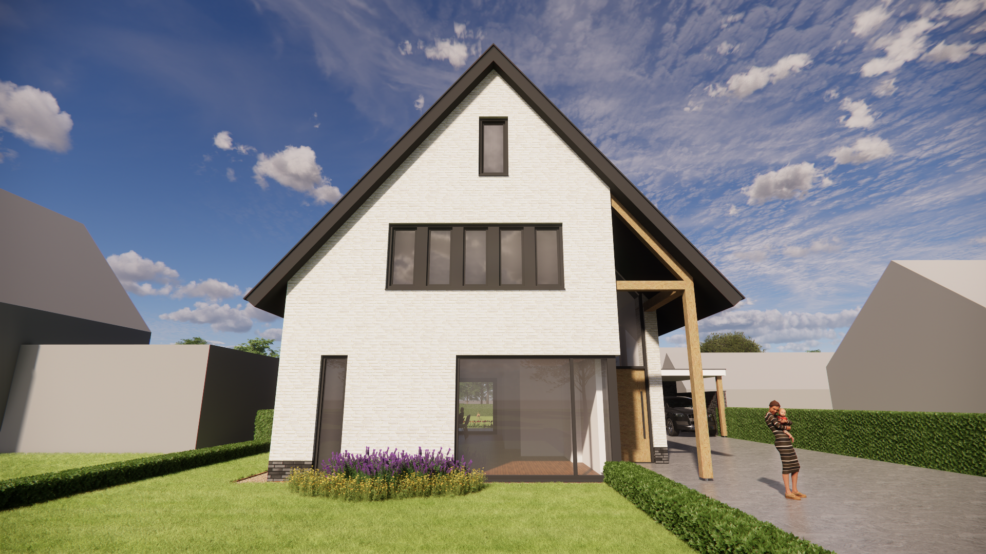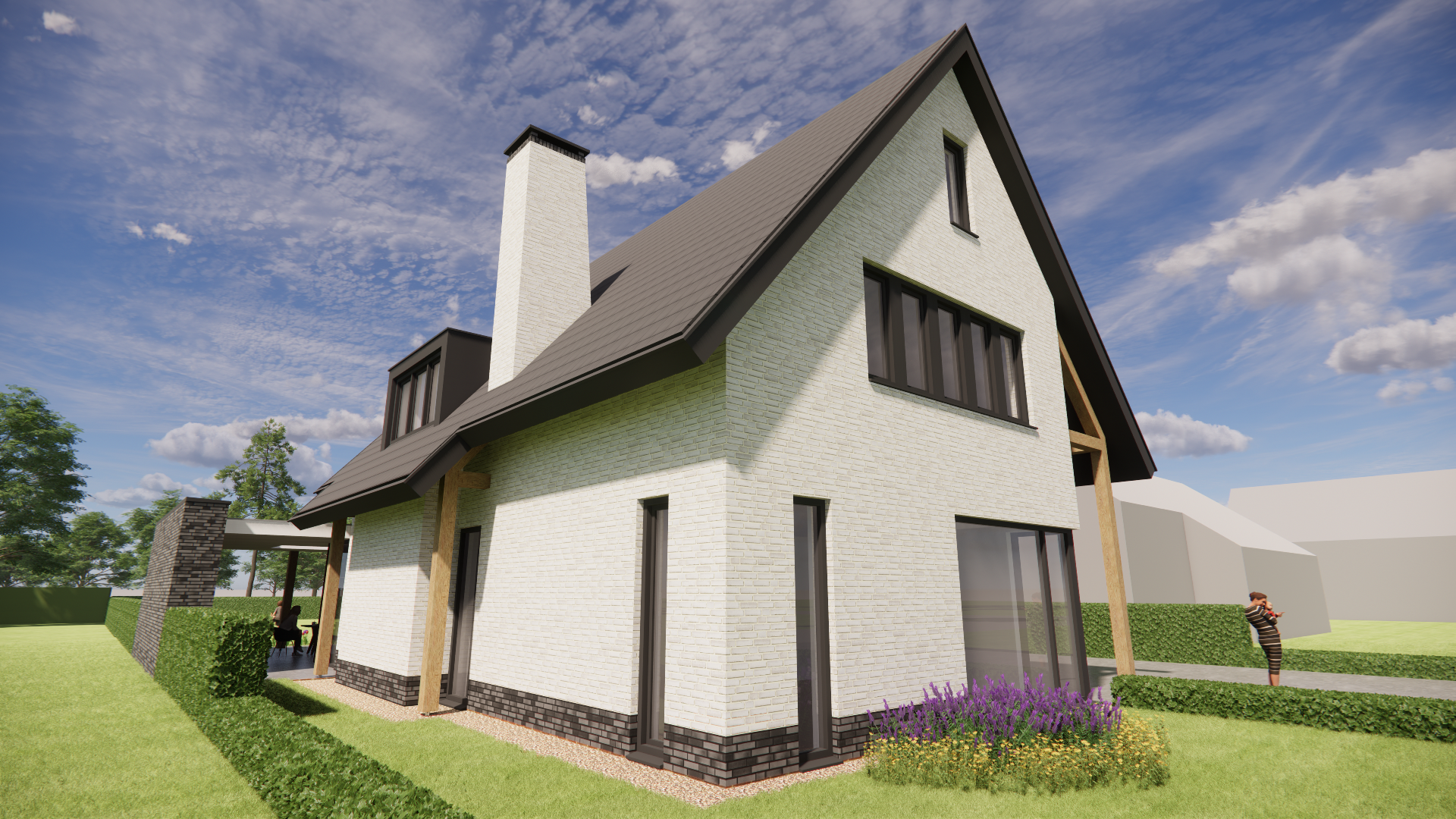Dit nieuwbouwontwerp toont een modern en eigentijds karakter met traditioneel vakmanschap. Het gekeimde metselwerk zorgt voor een rustige uitstraling, terwijl het zadeldak met vlakke dakpan en verholen dakgoot de lijnen strak houdt. Details zoals de dakkapel, schoorsteen, houten balken aan de buitenzijde, het dakoverstek en het hoekkozijn geven het geheel een vriendelijke, herkenbare signatuur. De overdekte entree verwelkomt je op een comfortabele, droge binnenkomst.