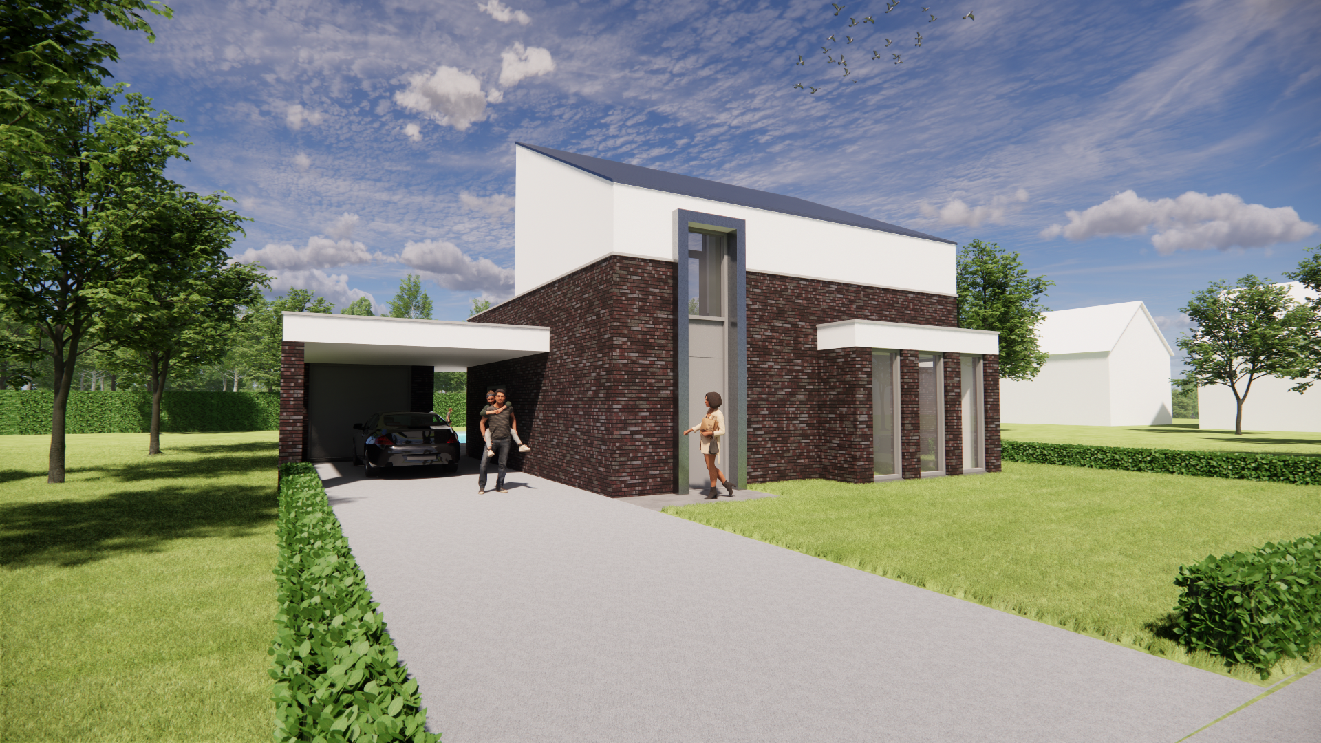 Deze moderne woning valt op door de combinatie van donkerrode bakstenen en wit pleisterwerk. Het contrast tussen deze materialen geeft de gevel een gelaagde uitstraling, met een warme en eigentijdse sfeer. Het lessenaarsdak versterkt de moderne vormgeving en zorgt tegelijkertijd voor een verrassende lichtinval aan de binnenzijde.
