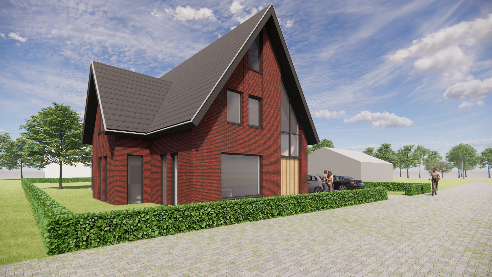 Moderne woning met hoog zadeldak, houten accenten en royale overkapping