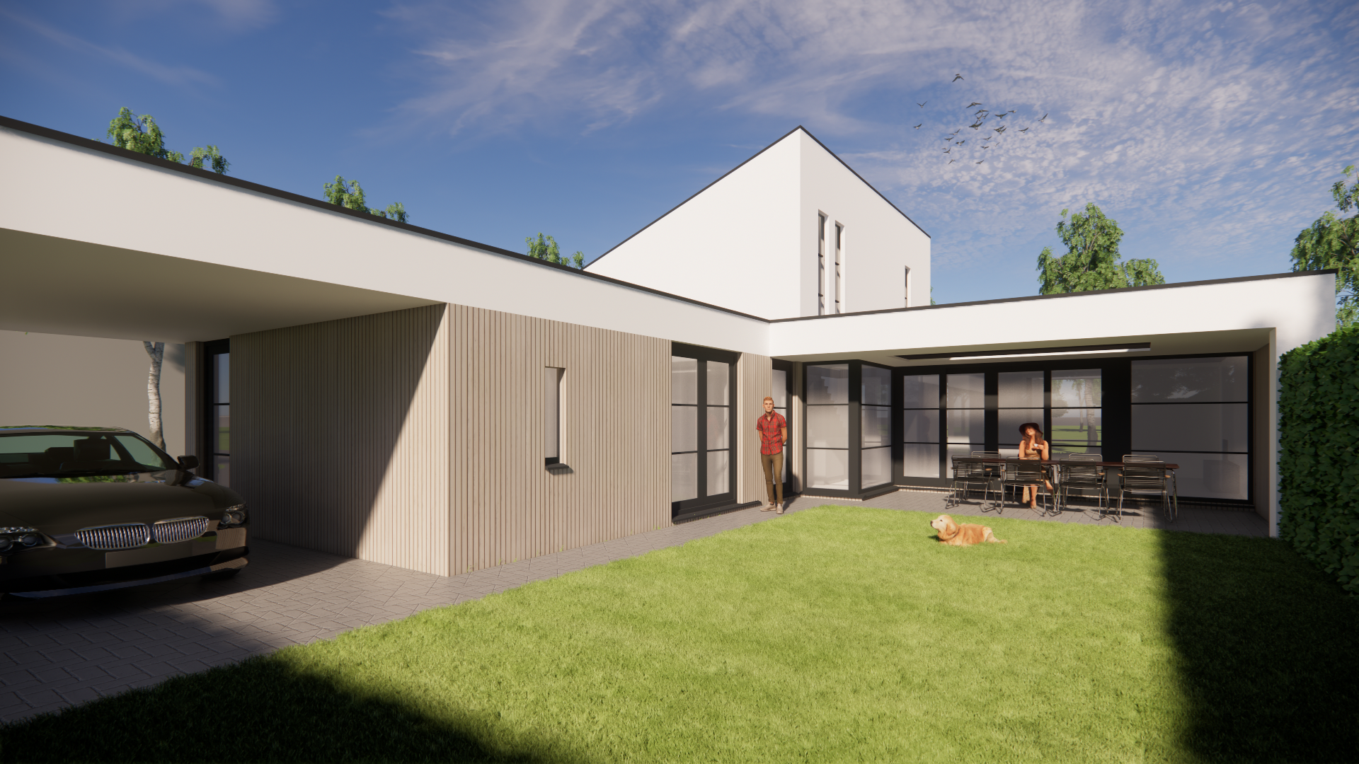 Aan de achterzijde biedt een overdekt terras volop ruimte om buiten te zitten, beschut en verbonden met de tuin. Ook de carport en de overdekte entree dragen bij aan het praktische gemak van dit ontwerp. De open keuken met kookeiland vormt het hart van het huis, een plek om samen te koken, eten en leven.