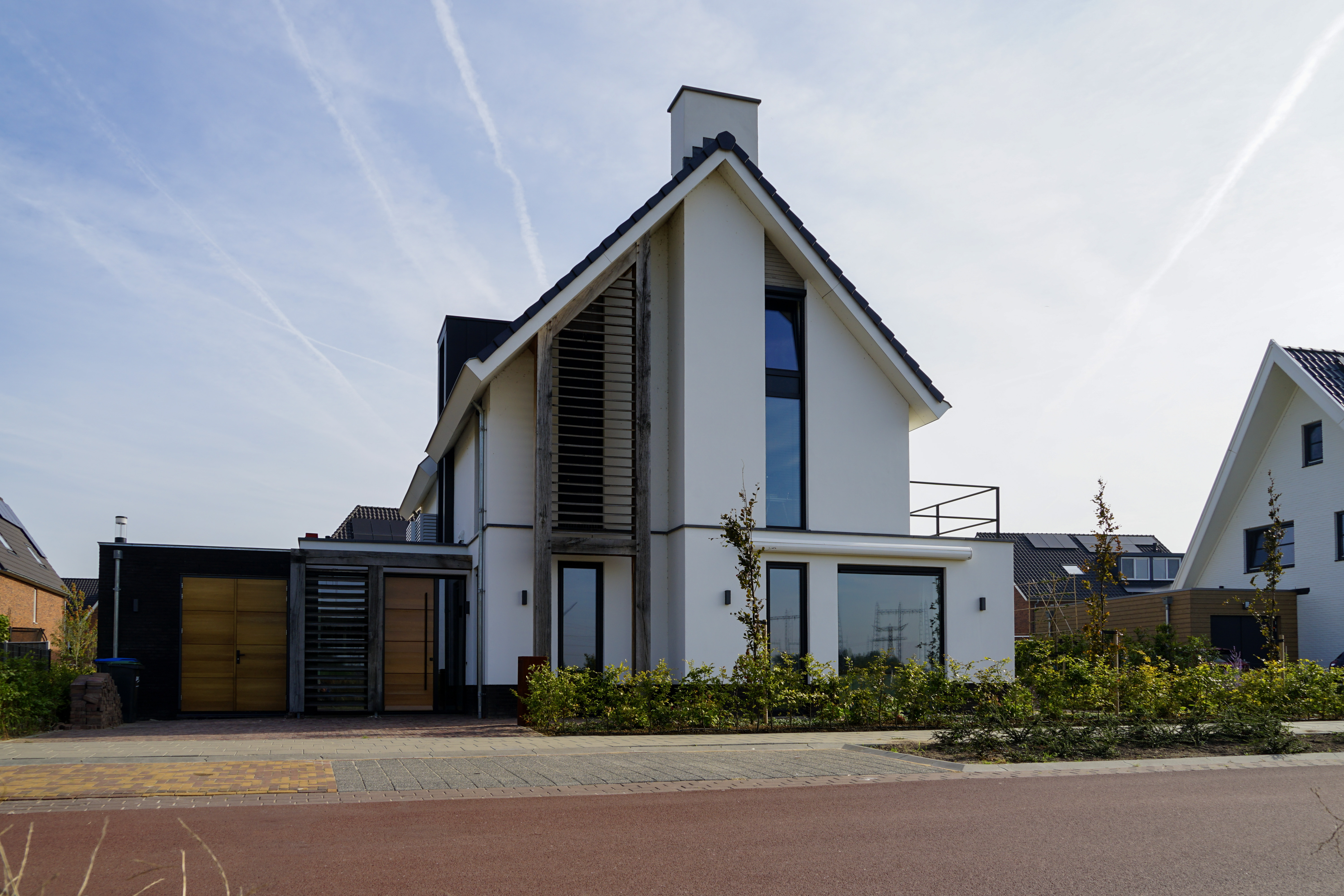 Deze eigentijdse woning straalt rust en helderheid uit. De combinatie van wit pleisterwerk, vlakke dakpannen en warme houten details zorgt voor een krachtig en evenwichtig beeld. Royale overstekken, een markante schoorsteen en houten buitenluiken geven de woning karakter en diepte. Dankzij de grote overkapping en de overdekte entree ontstaat er een natuurlijke overgang tussen binnen en buiten – comfortabel én uitnodigend.