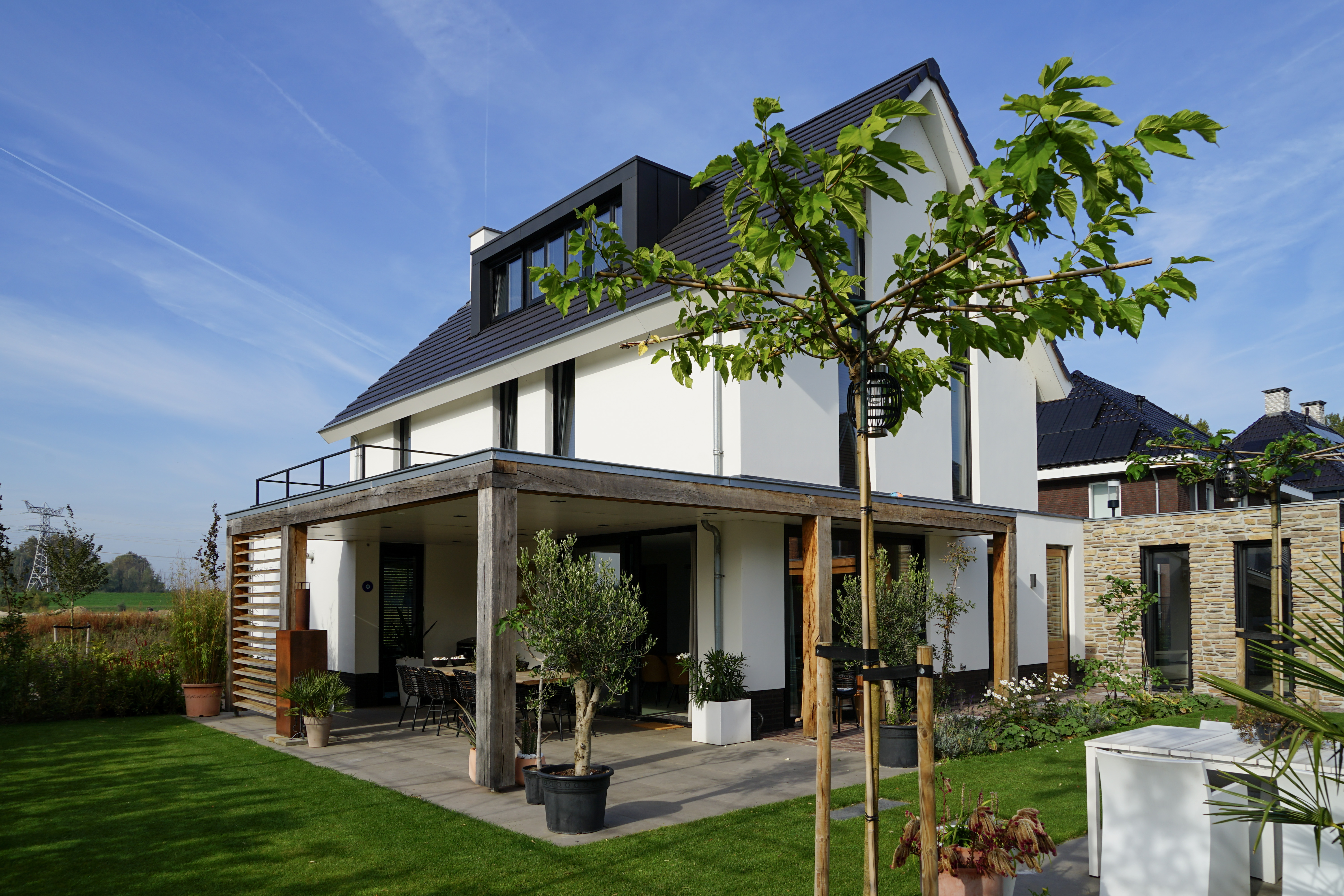 Moderne woning met strak pleisterwerk, houten accenten en royale overstekken