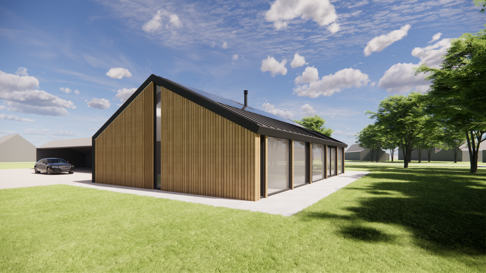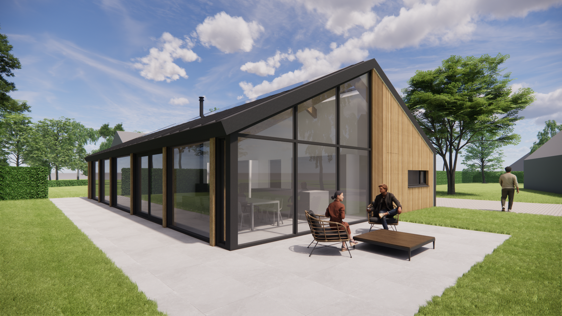 Schuurwoning met houten gevel en donker felsplaten zadeldak