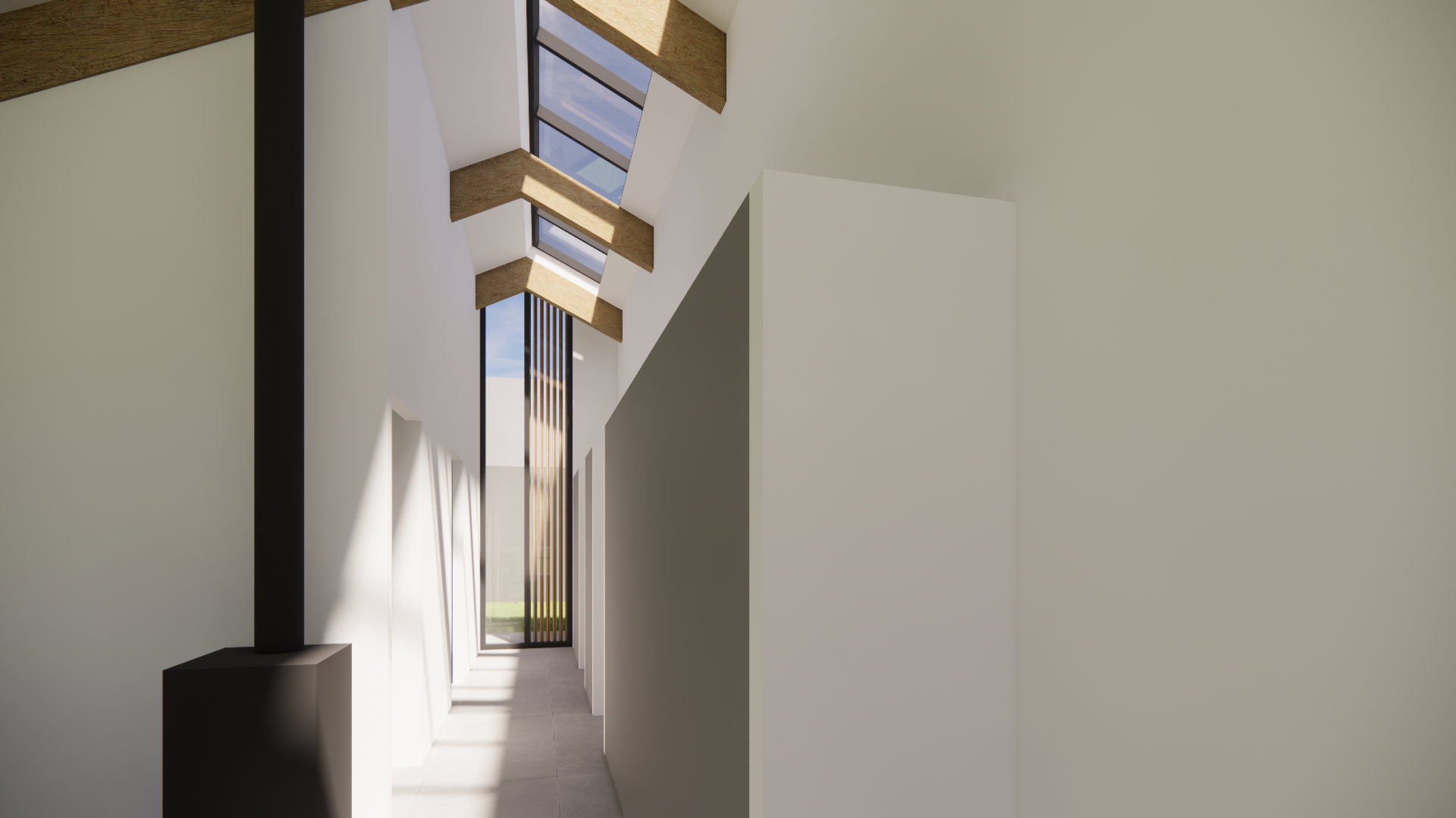 Deze levensloopbestendige schuurwoning straalt rust en eenvoud uit. De houten gevelbekleding in combinatie met het donkere felsplaten zadeldak zorgt voor een krachtige, maar warme uitstraling. De verholen dakgoot houdt het geheel strak en minimalistisch. Binnen zorgen de zichtbare houten balken voor karakter en sfeer, terwijl het kookeiland en de haard bijdragen aan een gevoel van geborgenheid.