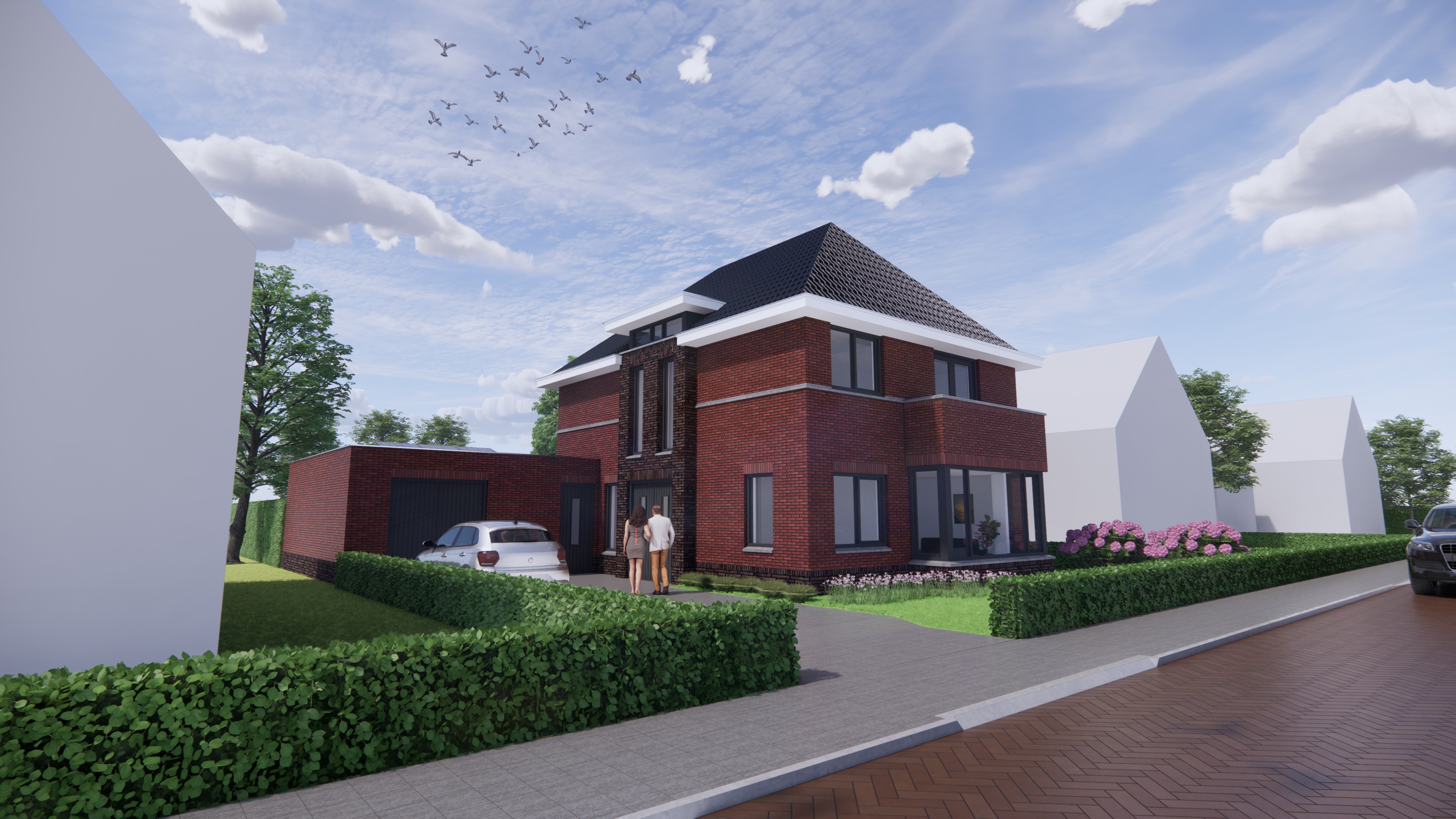 Deze woning combineert de charme van een traditionele notariswoning met een eigentijdse invulling. Het klassieke schilddak met gegolfde dakpannen, de karakteristieke risalieten en een stijlvolle erker zorgen voor een vertrouwd silhouet. Tegelijkertijd geven subtiele accenten zoals een betimmerde goot en het ruime dakoverstek het geheel een frisse, moderne uitstraling.