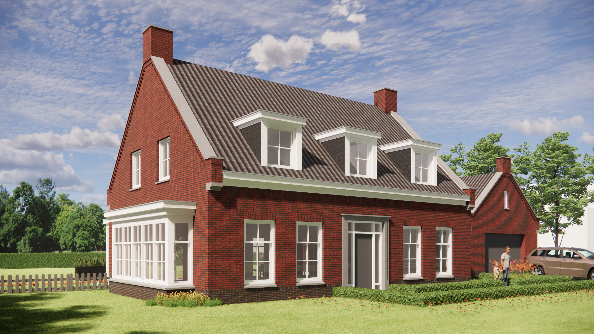 Op een royaal perceel in het buitengebied staat deze vrijstaande notariswoning: statig en warm tegelijk. De klassieke jaren 30-stijl komt tot leven in het zorgvuldig gedetailleerde metselwerk, de markante dakkapel en het karakteristieke zadeldak met gegolfde dakpannen. De erker aan de voorzijde versterkt de symmetrie en geeft het ontwerp een herkenbare uitstraling.
