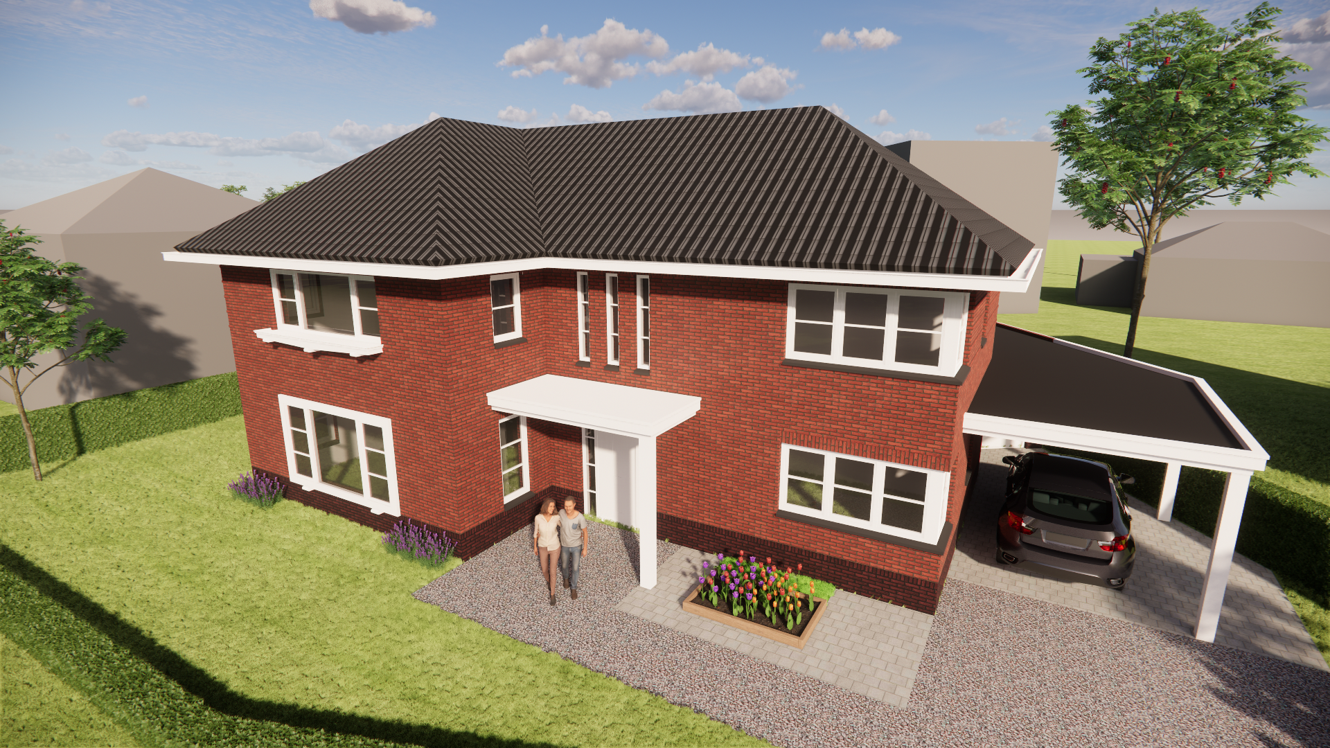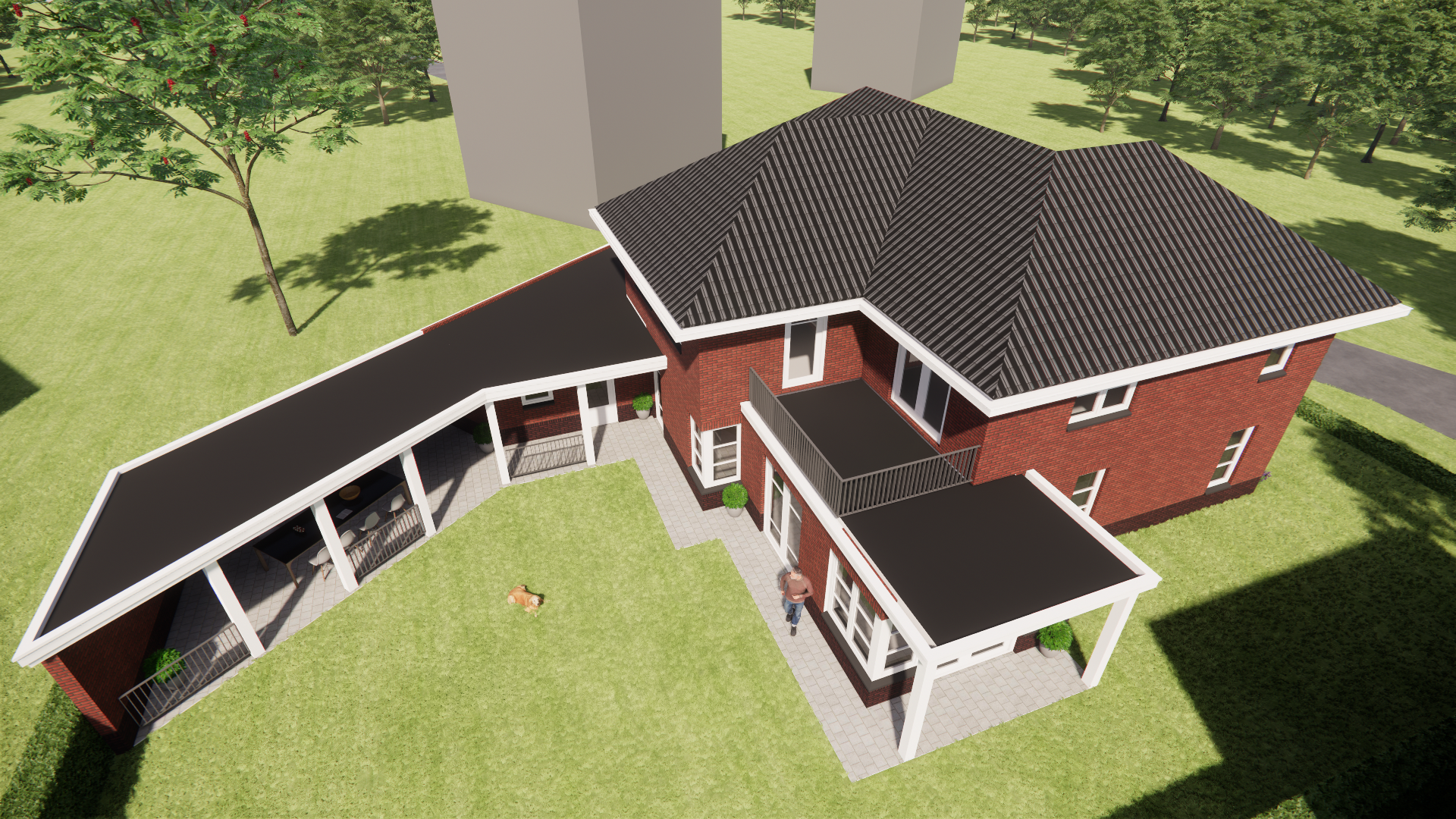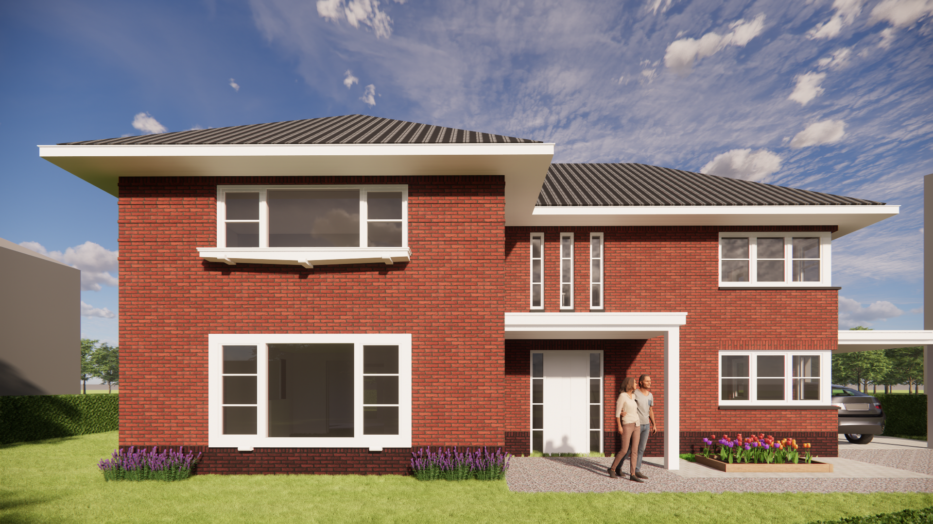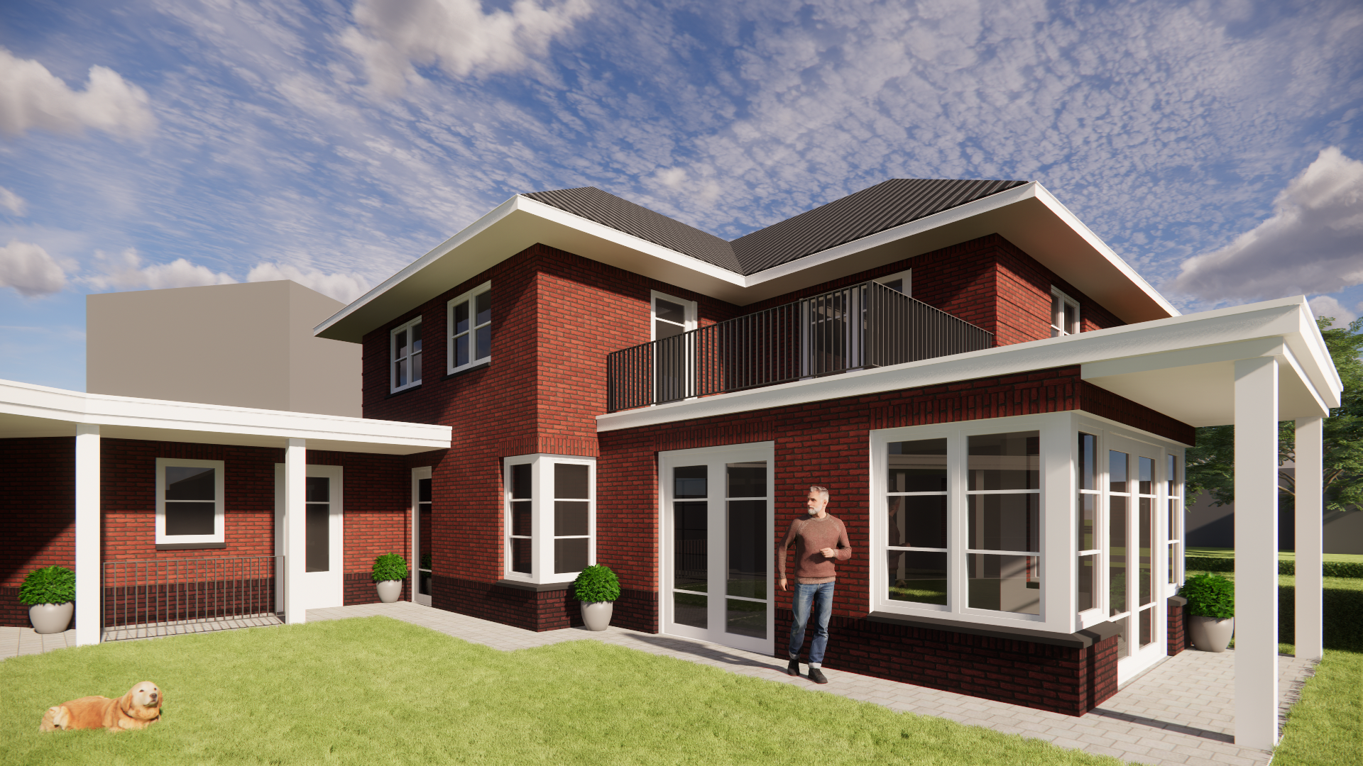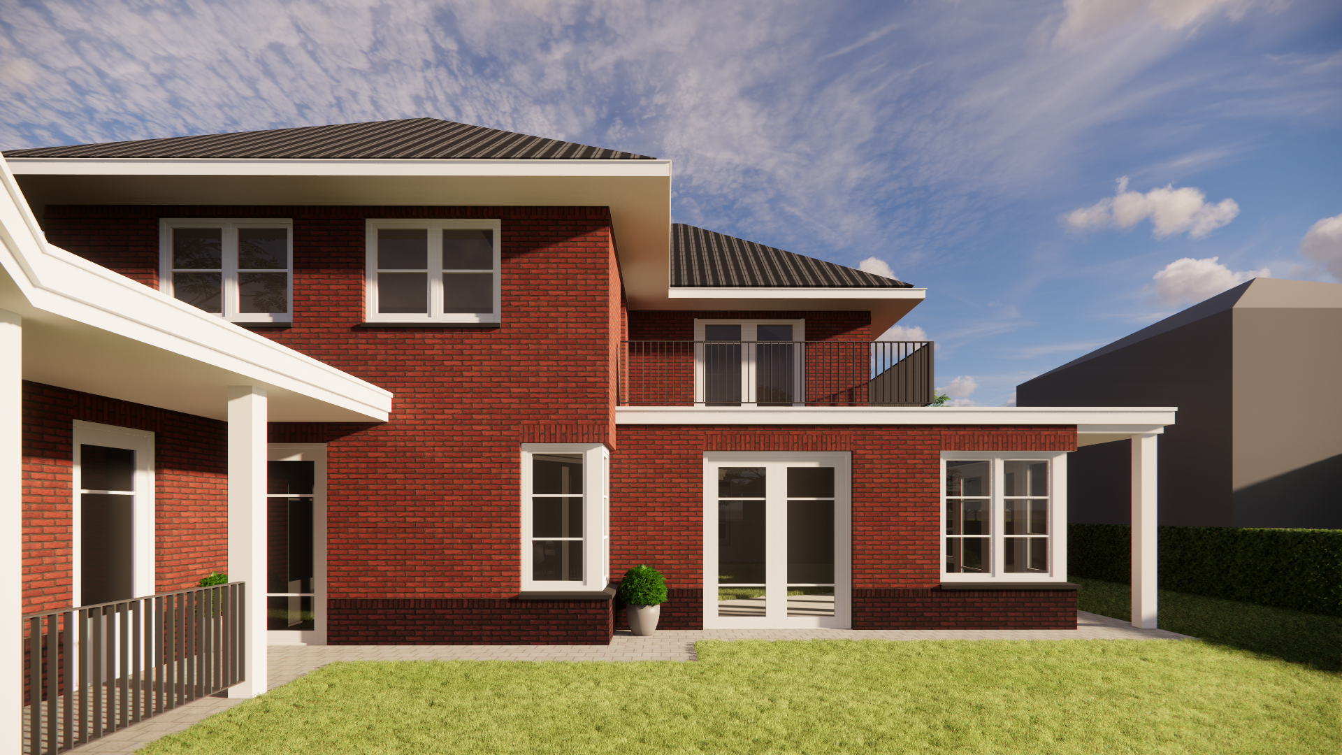 Een overkapping voor een overdekt terras en een balkon creëren extra verblijfskwaliteit rondom het huis.