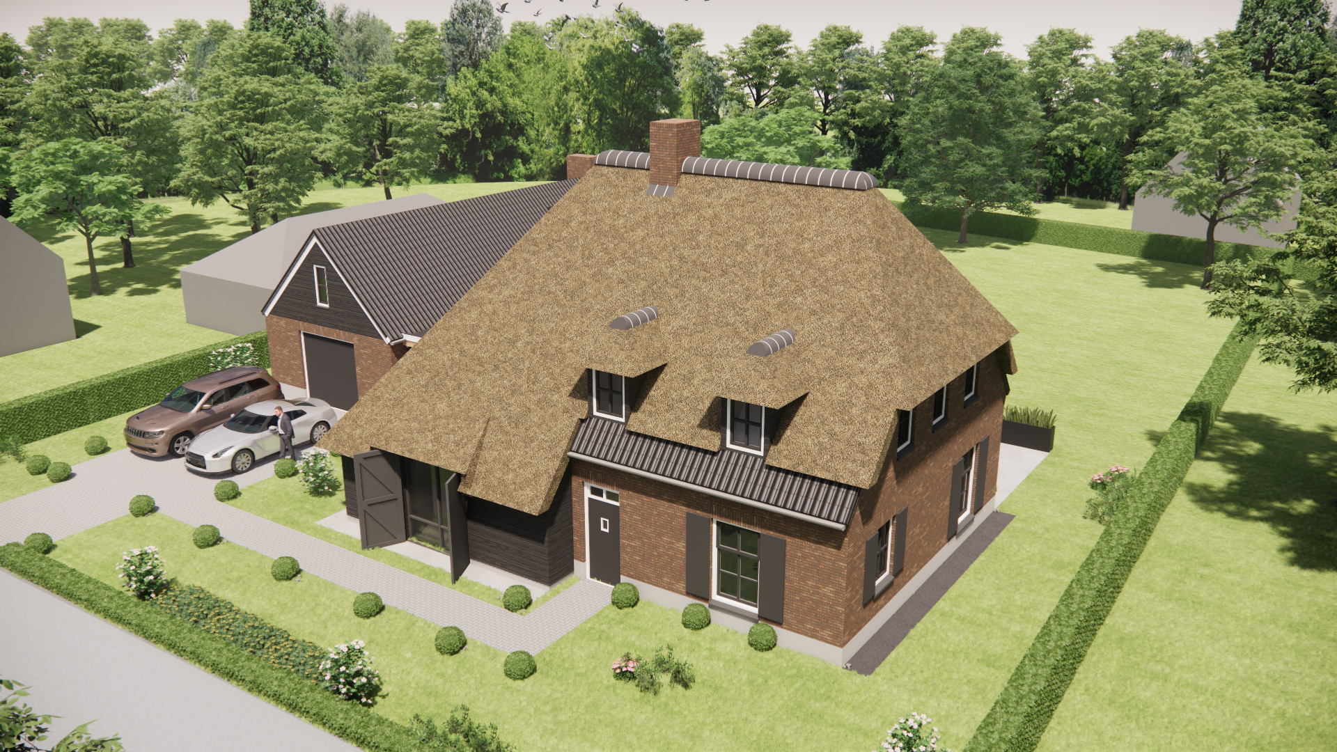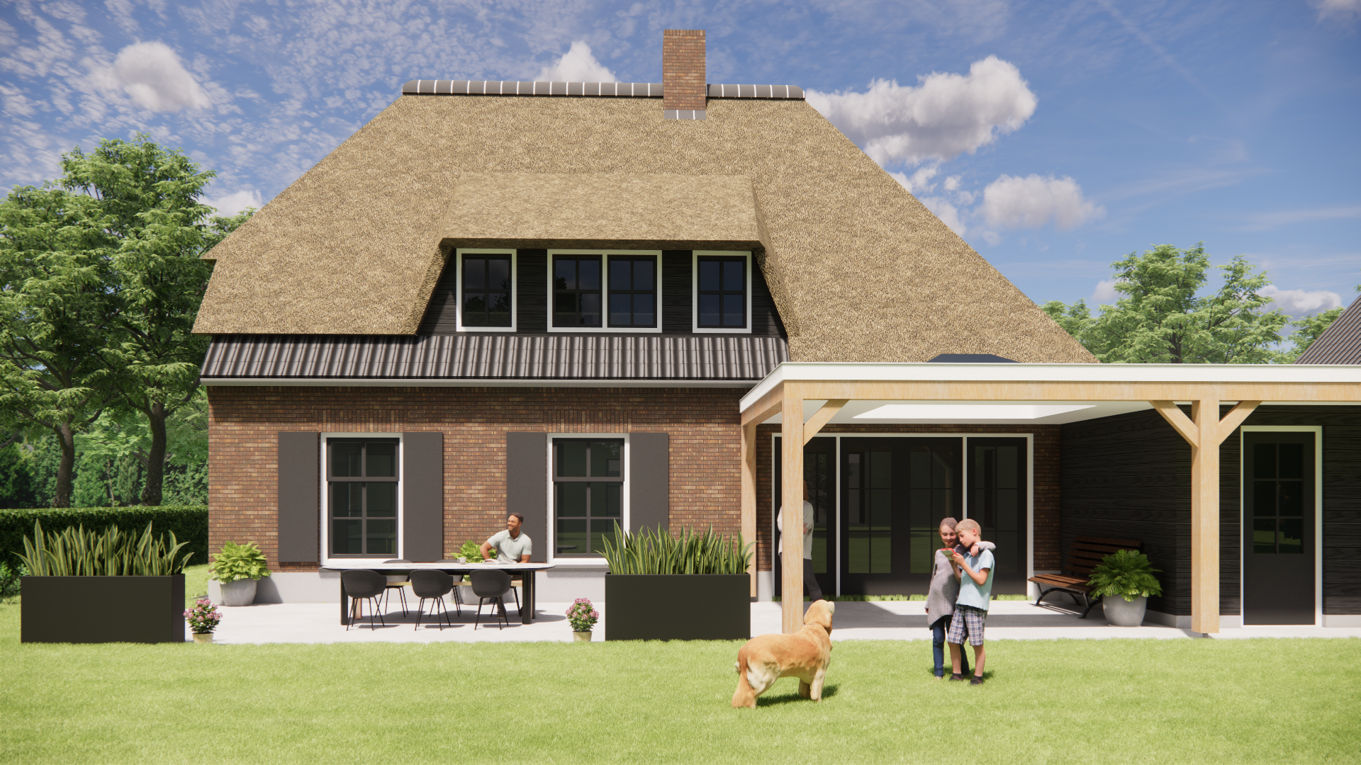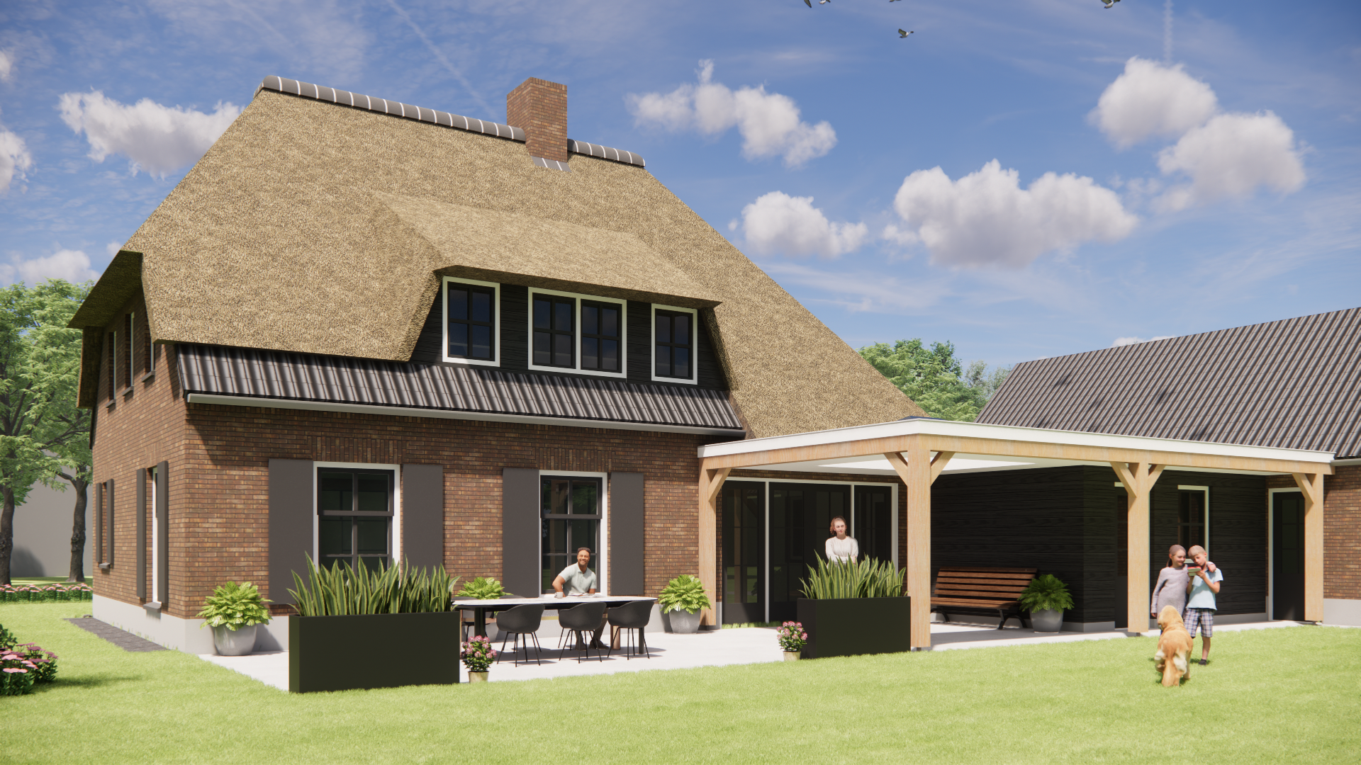 Je ziet een vrijstaand nieuwbouwproject in landelijke boerderijstijl, traditioneel gebouwd. Het wolfsdak combineert riet en gegolfde pannen. De metselwerk gevels staan op een rustige cementplint. Houten balken aan de buitenzijde, luiken, een dakkapel en een schoorsteen geven het huis een eigen gezicht. Met een goothoogte van 3 meter en een nok op 9 meter blijft het silhouet ingetogen en krachtig. Met 202 m² gebruiksoppervlakte verdeeld over vier bouwlagen wordt elke meter slim benut.