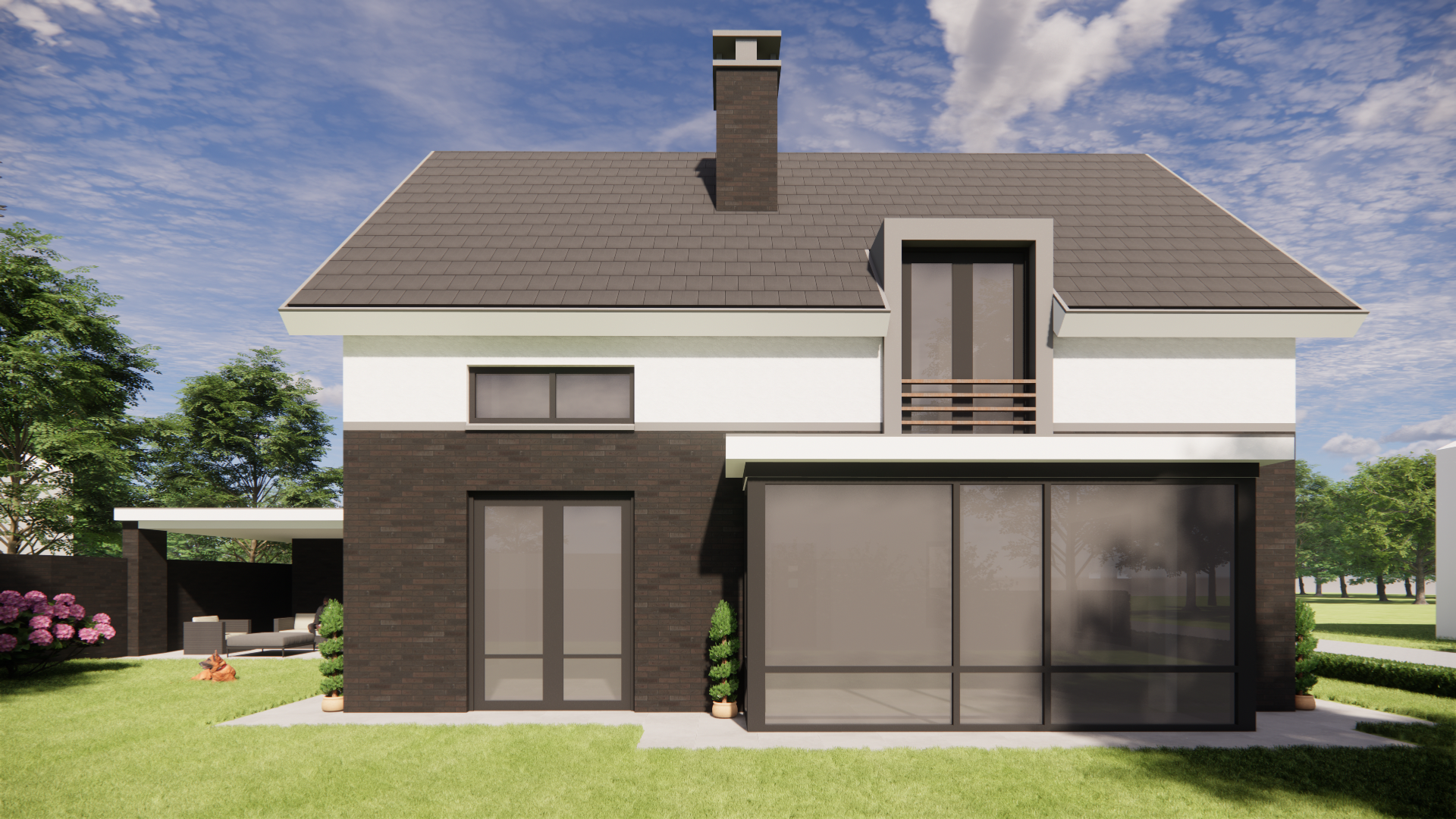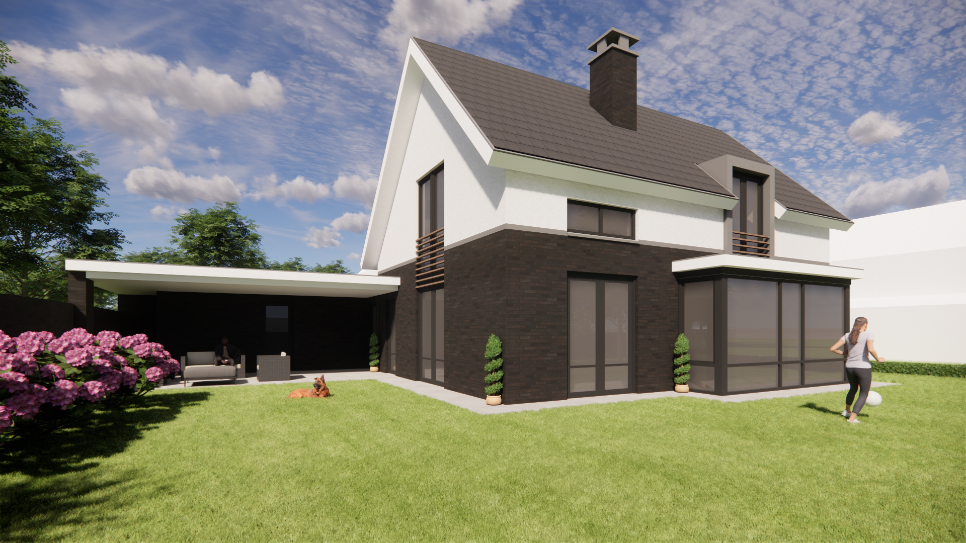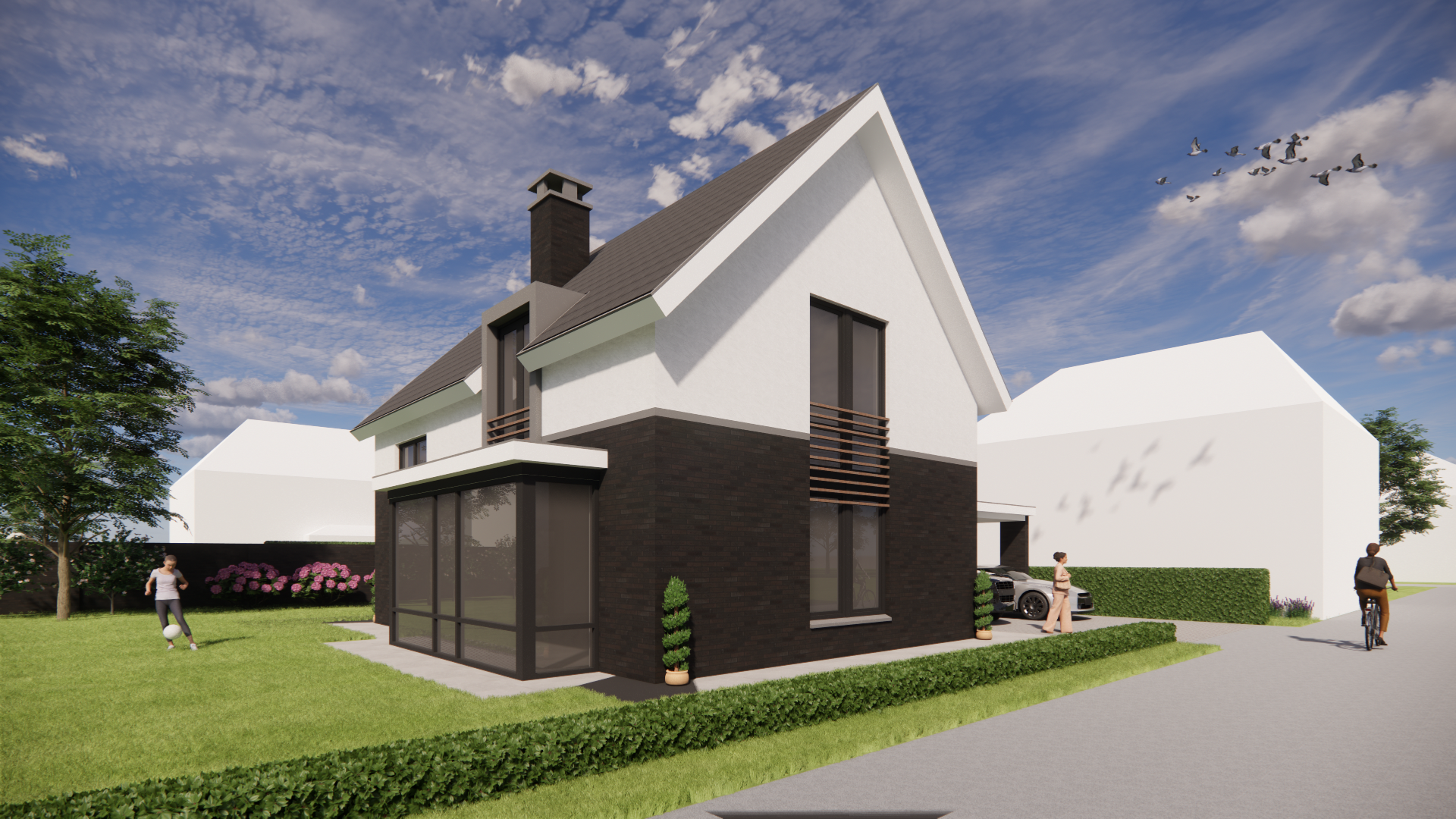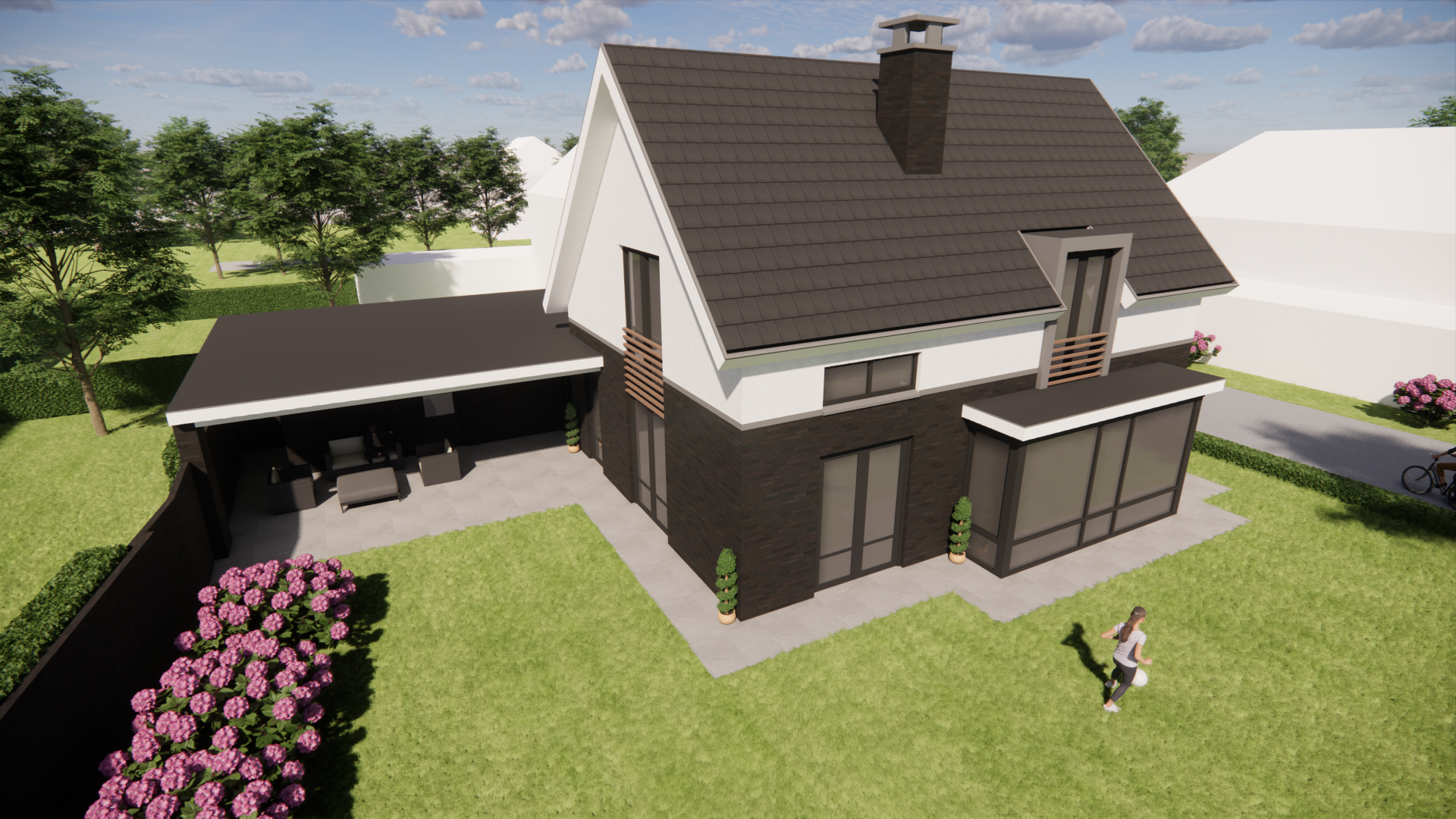 De kwaliteit zit in de details. Een dakkapel en erker voegen extra ruimtebeleving toe. De betimmerde goot en het dakoverstek geven het volume finesse. Met een pleisterwerk accent en buiten shutters ontstaat een subtiel spel van textuur en ritme. De schoorsteen maakt het geheel af met een herkenbaar, huiselijk element.