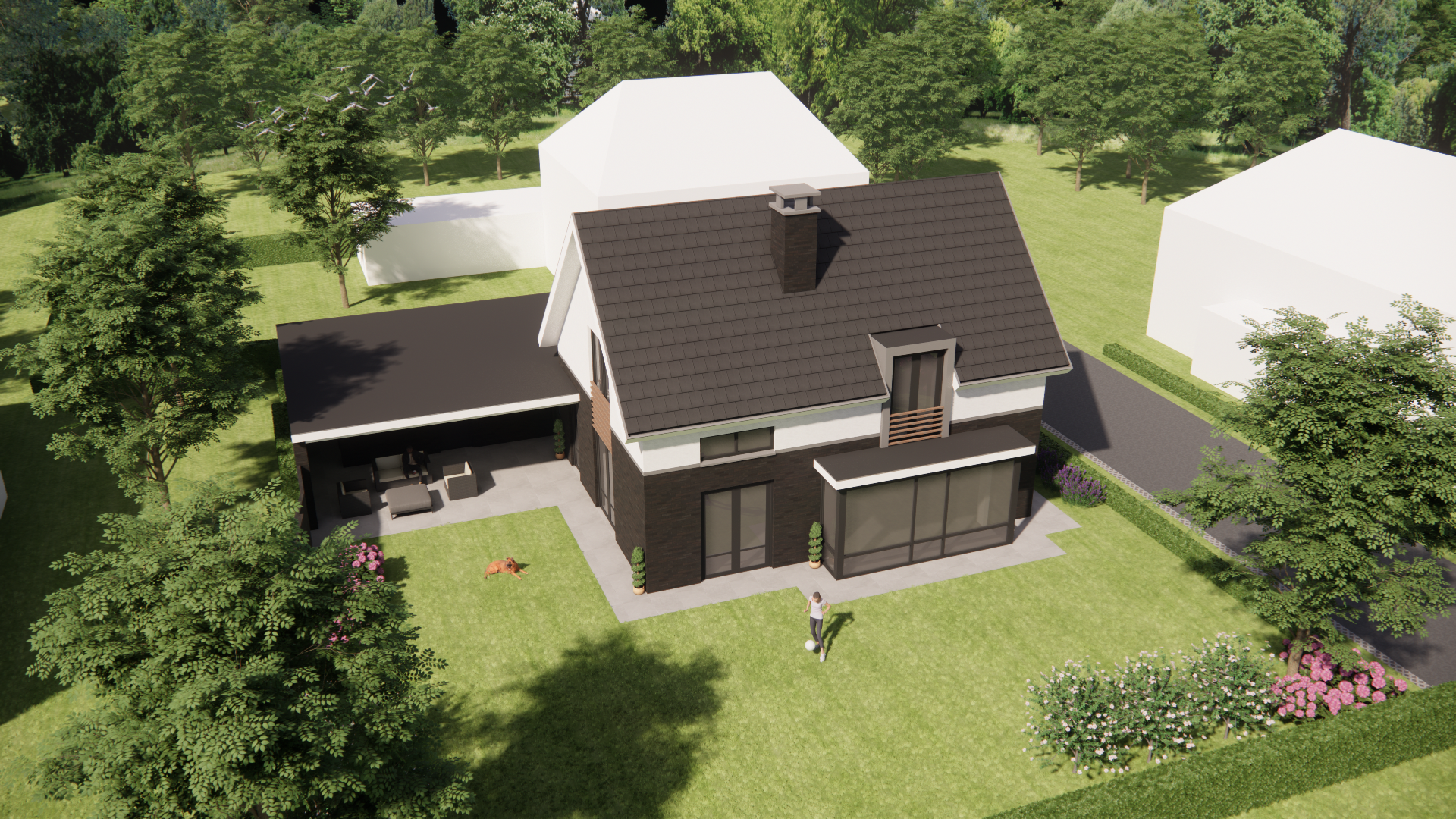 Vrijstaande eigentijdse woning met metselwerkgevel en zadeldak met vlakke dakpannen