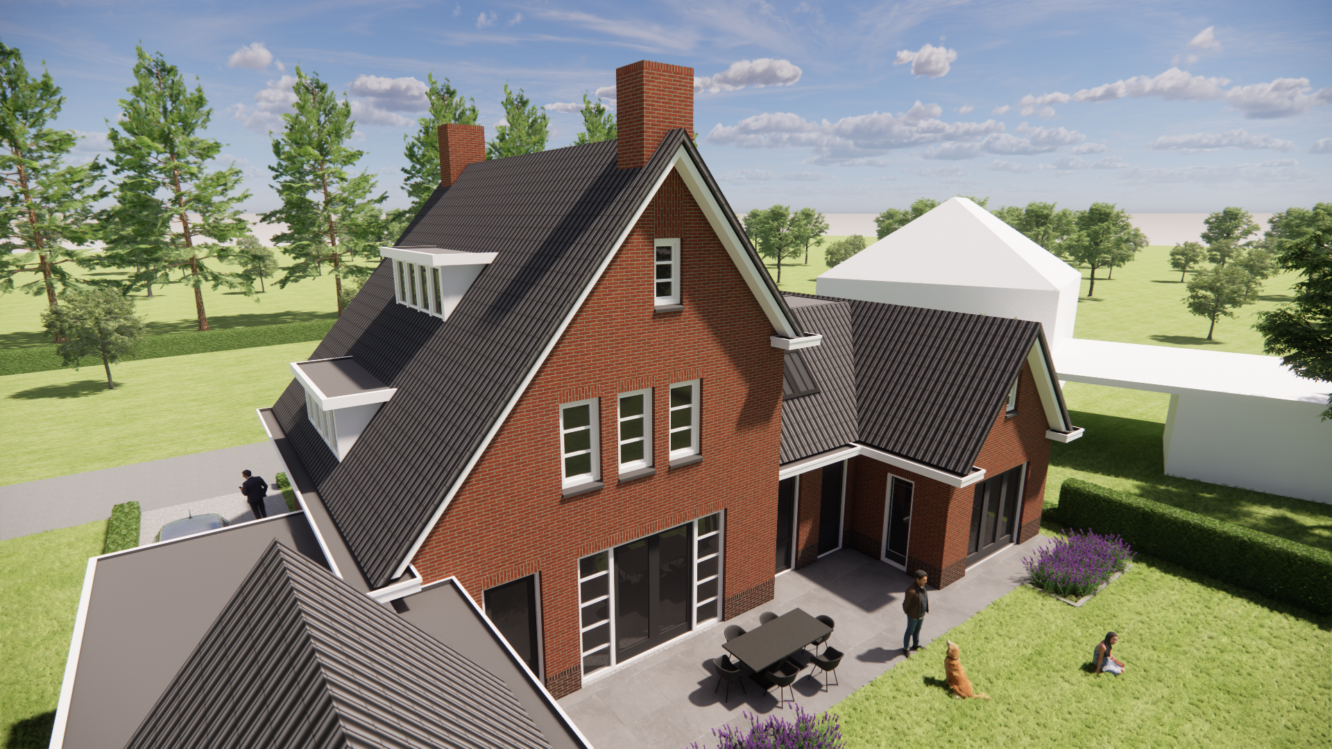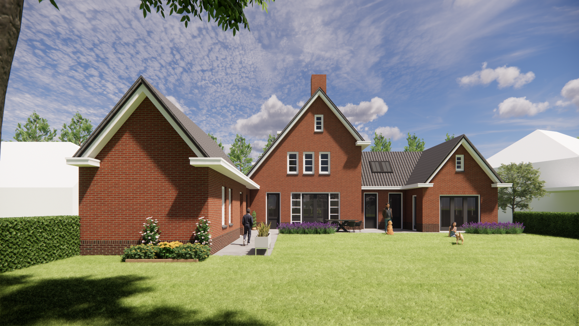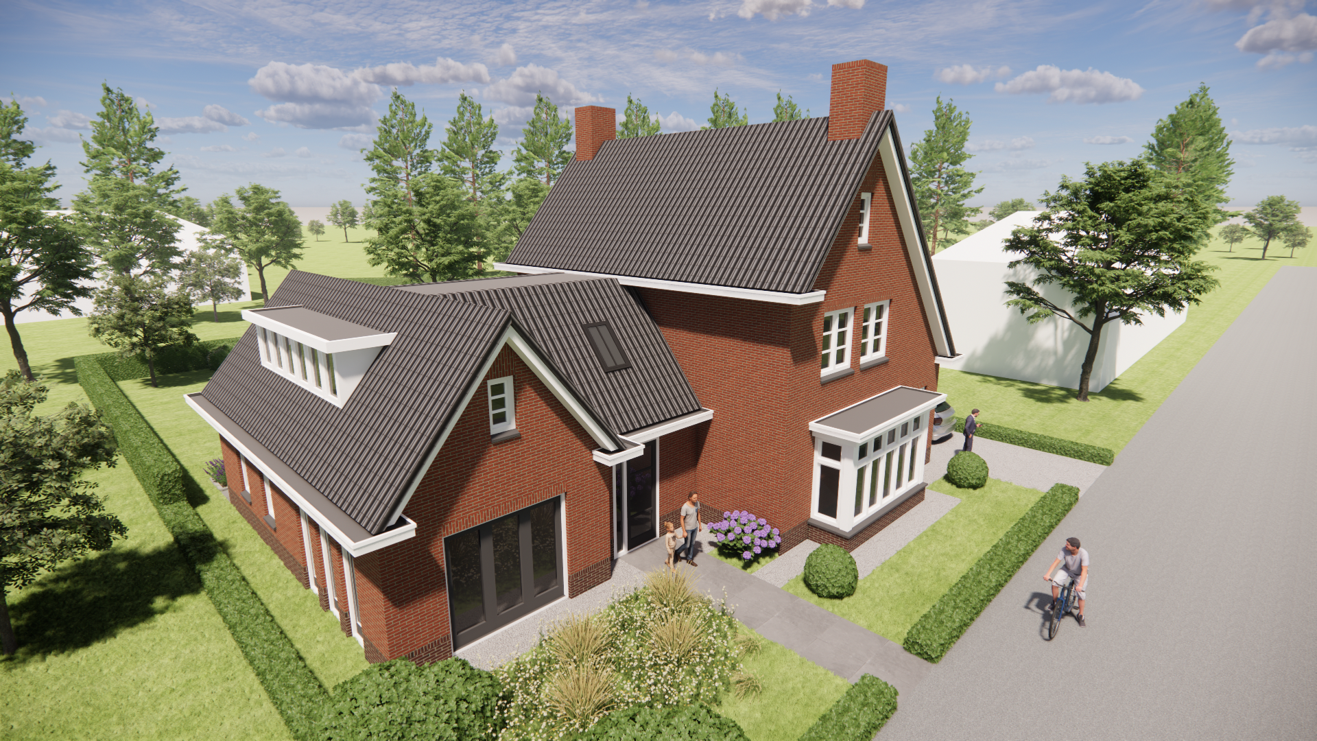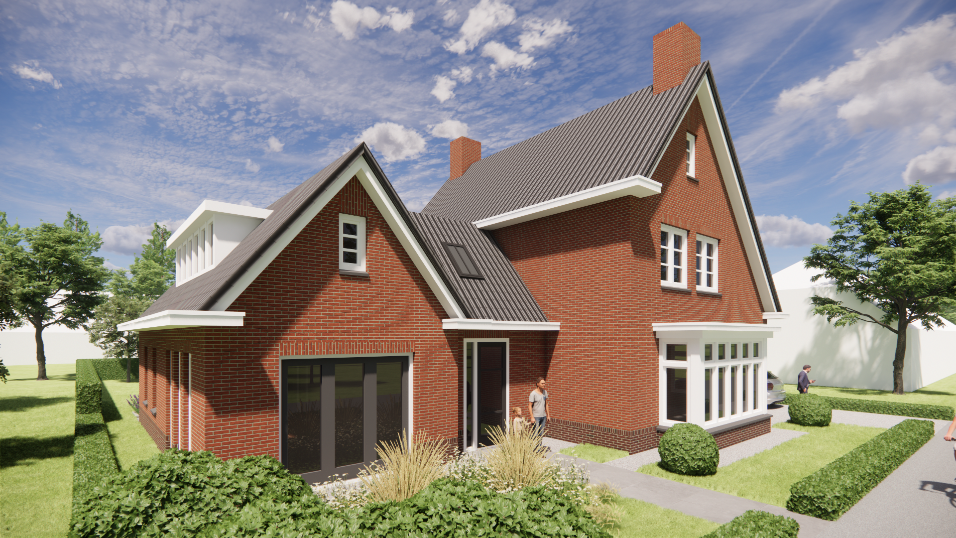 Een vrijstaand nieuwbouw woonhuis in jaren 30 stijl. Traditioneel gebouwd met metselwerk gevels en een zadeldak met gegolfde dakpannen. Houten accenten brengen warmte in het aanzicht. De verholen dakgoot en betimmerde goot houden de lijn rustig en verzorgd.