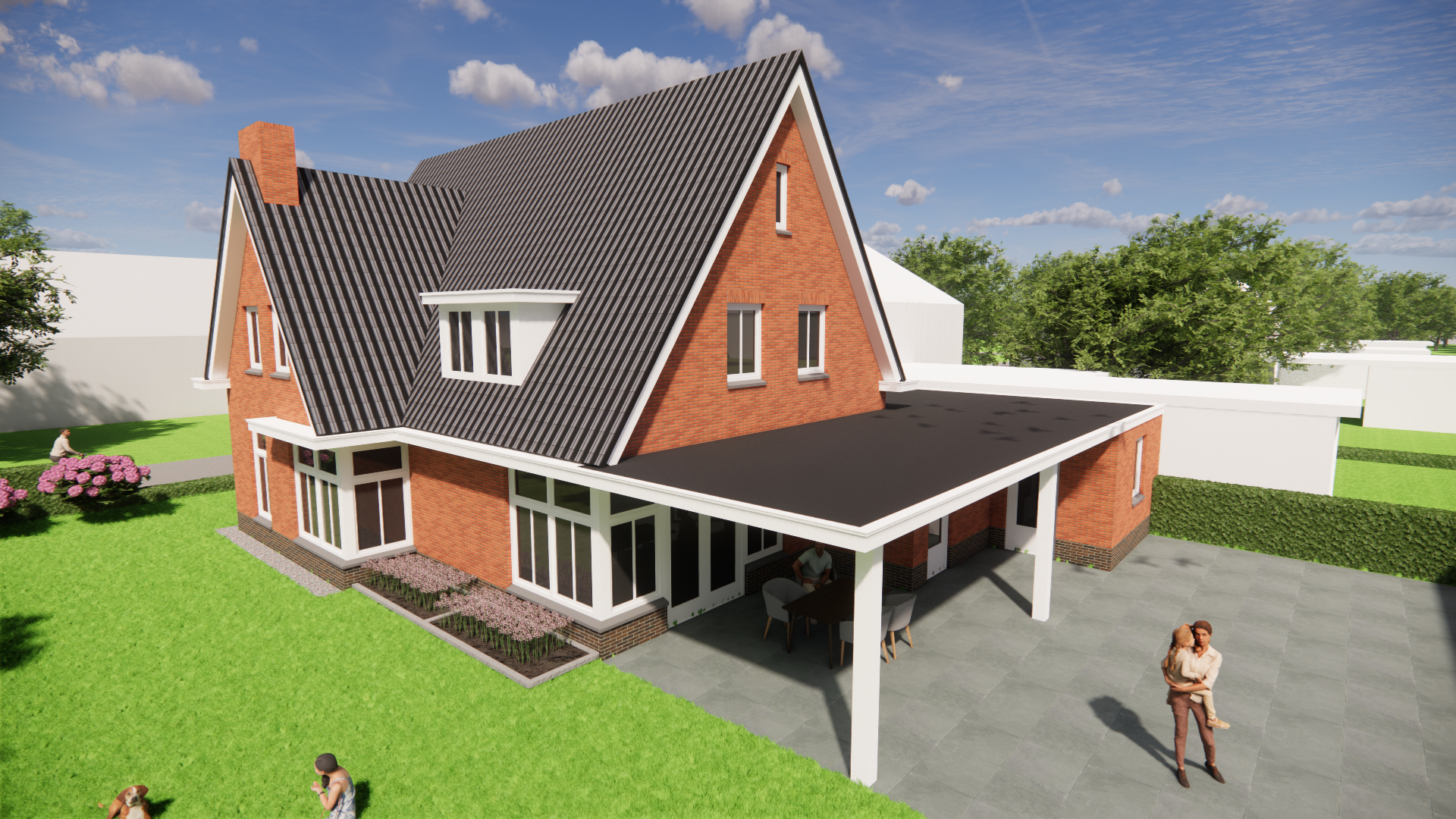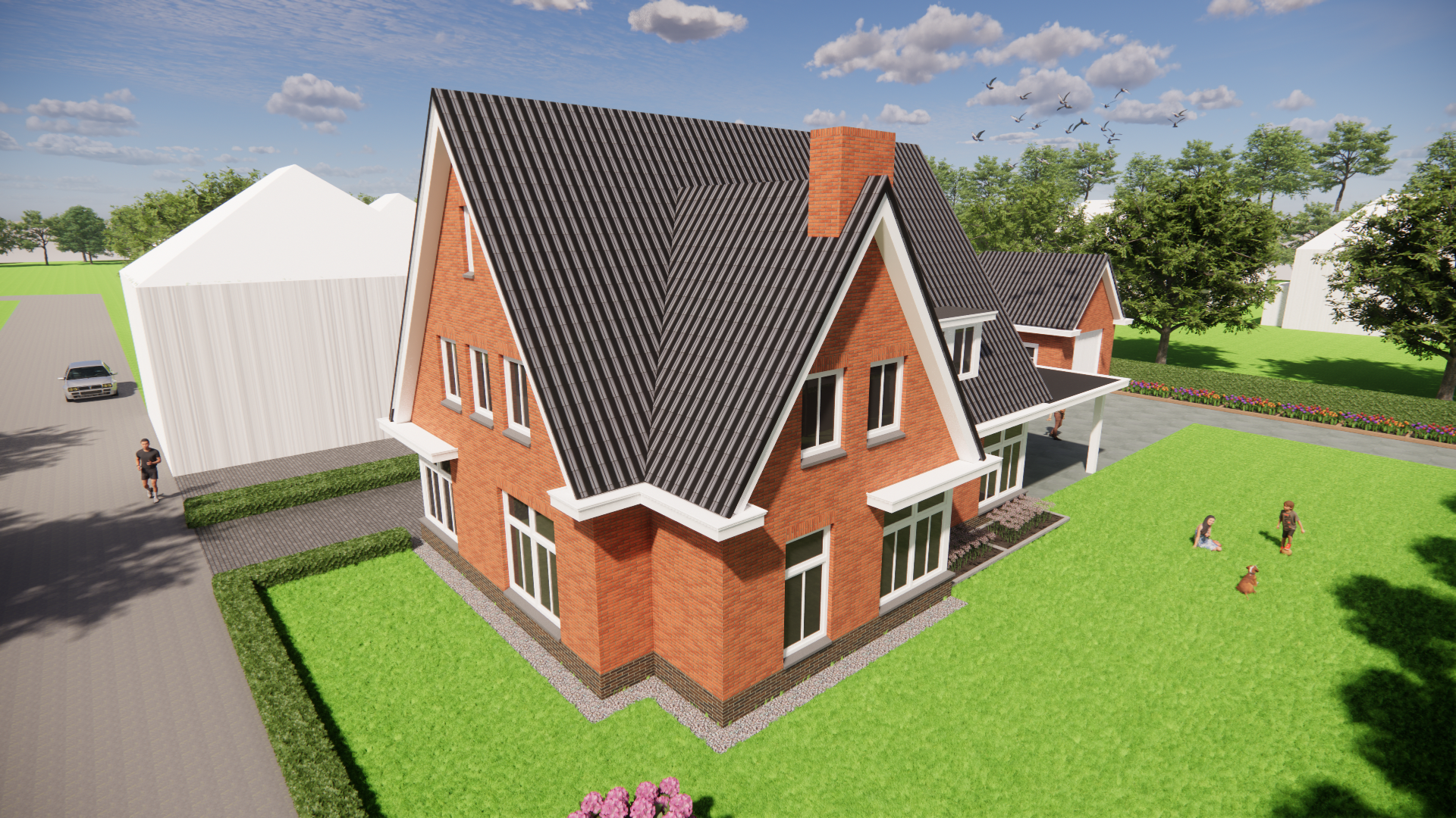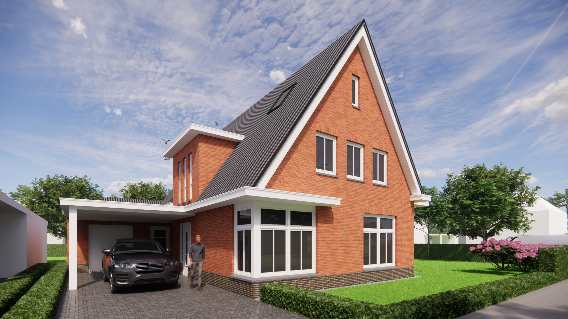 Je ziet een vrijstaand nieuwbouwhuis in jaren 30 stijl. Traditioneel gebouwd in rood metselwerk, met een karakteristiek zadeldak met gegolfde dakpannen. Details maken het geheel af: een betimmerde goot, een dakoverstek, een dakkapel en een hoekkozijn dat extra licht en zicht geeft.