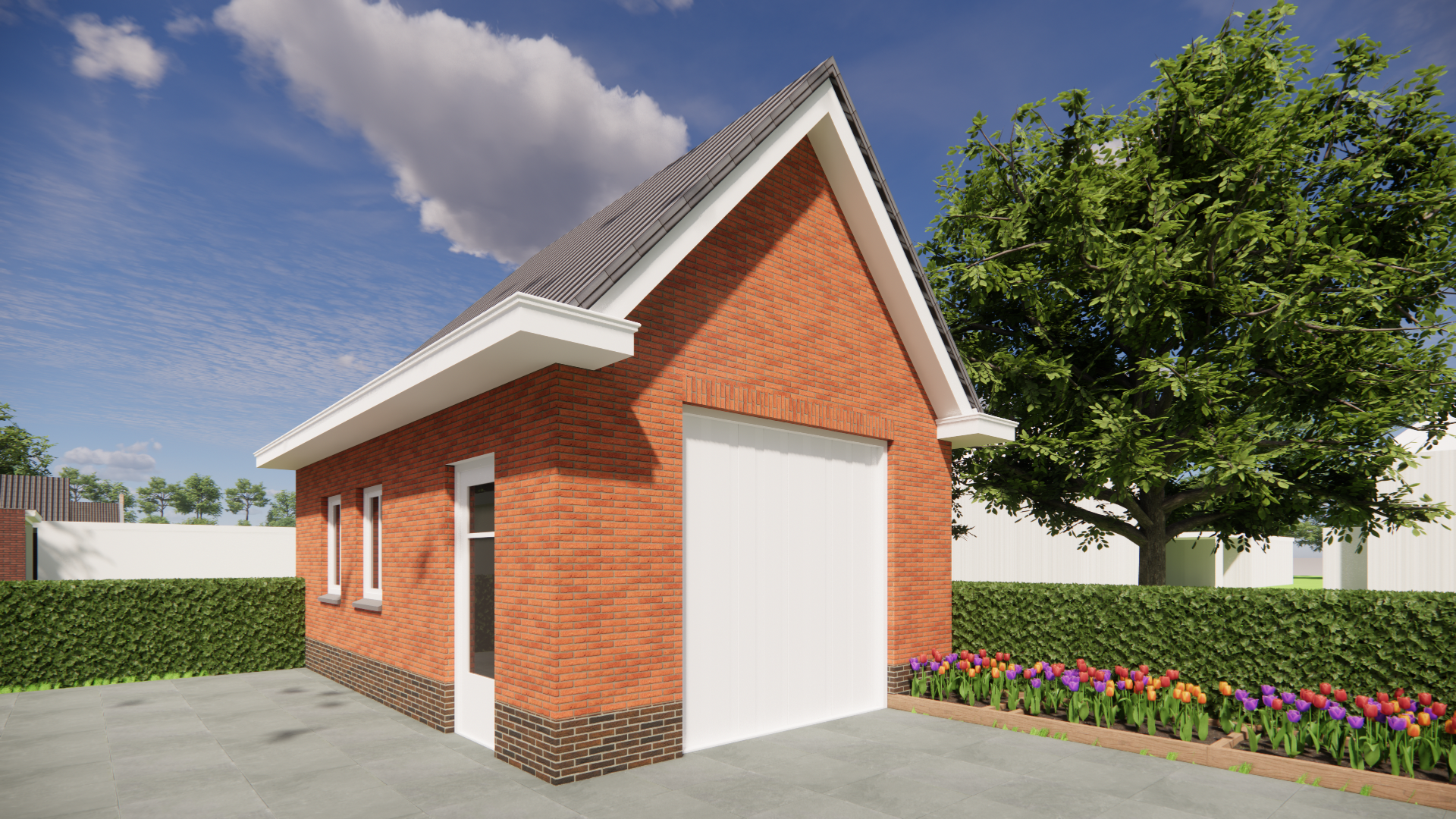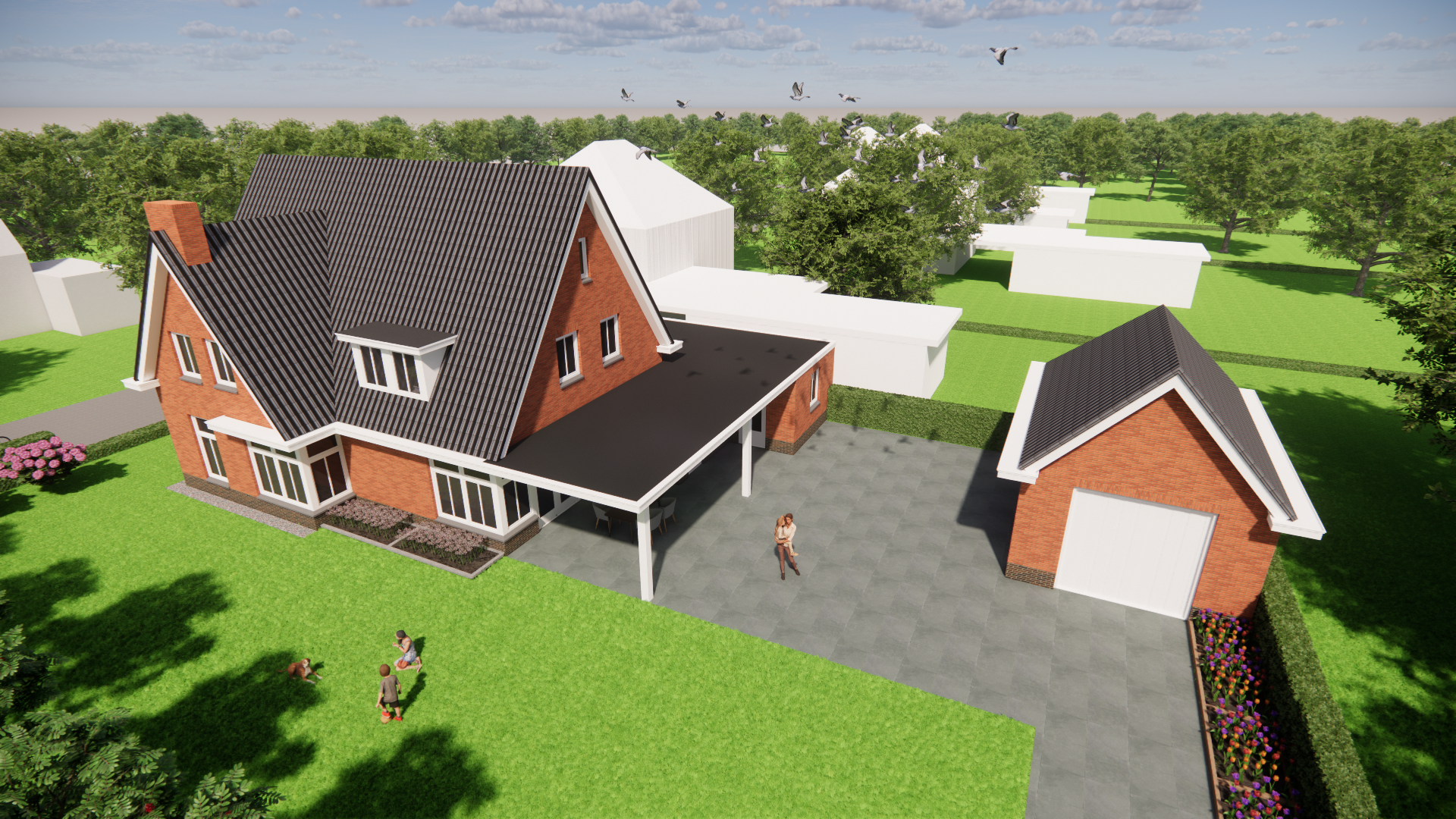 Een werkkamer biedt rust voor concentratie. Buiten maken de overkapping en het overdekte terras het eenvoudig om het hele jaar door buiten te zitten, terwijl de carport praktische beschutting geeft. Het bijgebouw voegt extra functionaliteit toe wanneer dat nodig is.