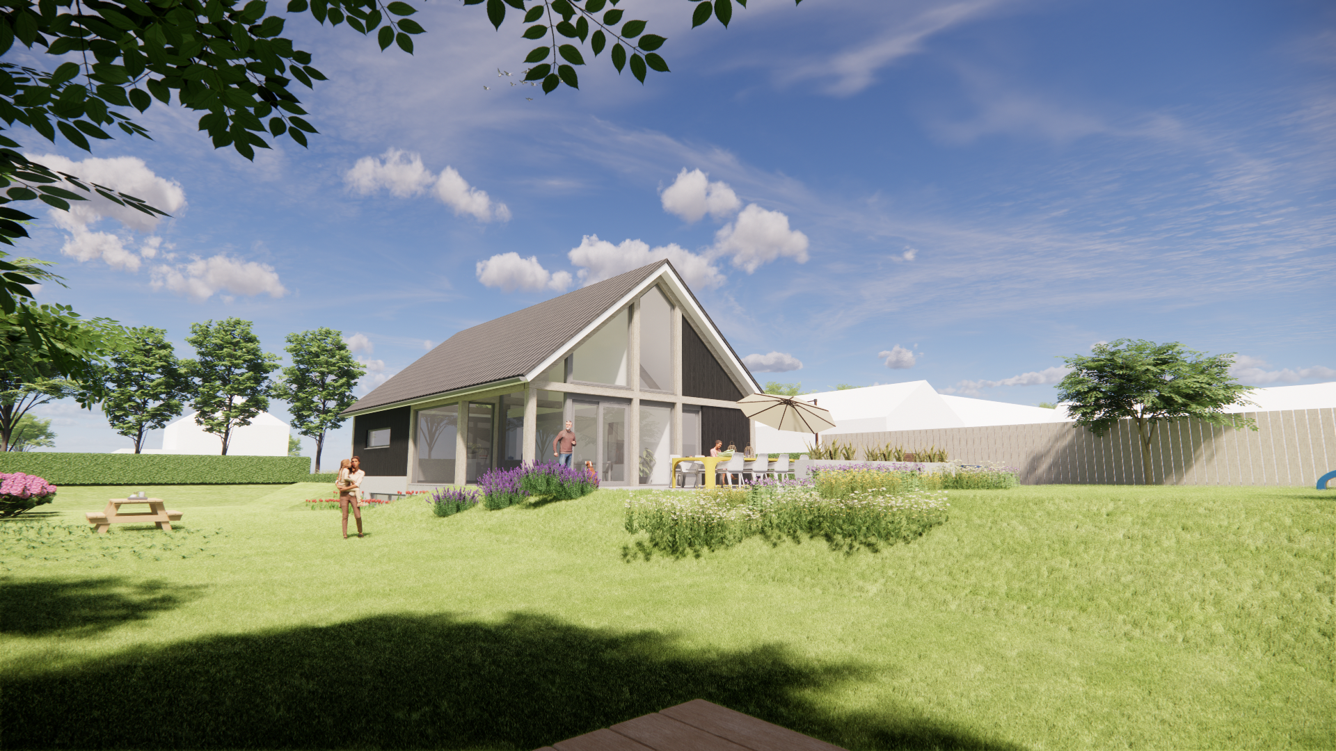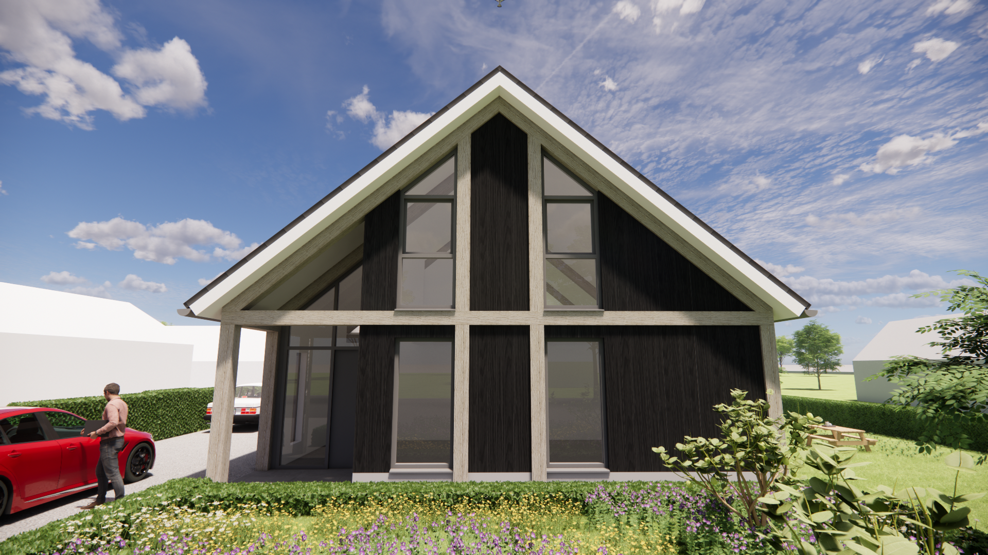 Deze vrijstaande woning combineert moderne vormgeving met een landelijke uitstraling. De houten gevelbekleding, cementplint en robuuste houten balken geven het huis een warme en natuurlijke uitstraling. Grote hoekkozijnen en een overkapt terras zorgen voor een sterke verbinding tussen binnen en buiten. De overdekte entree vormt een uitnodigende toegang tot het huis.