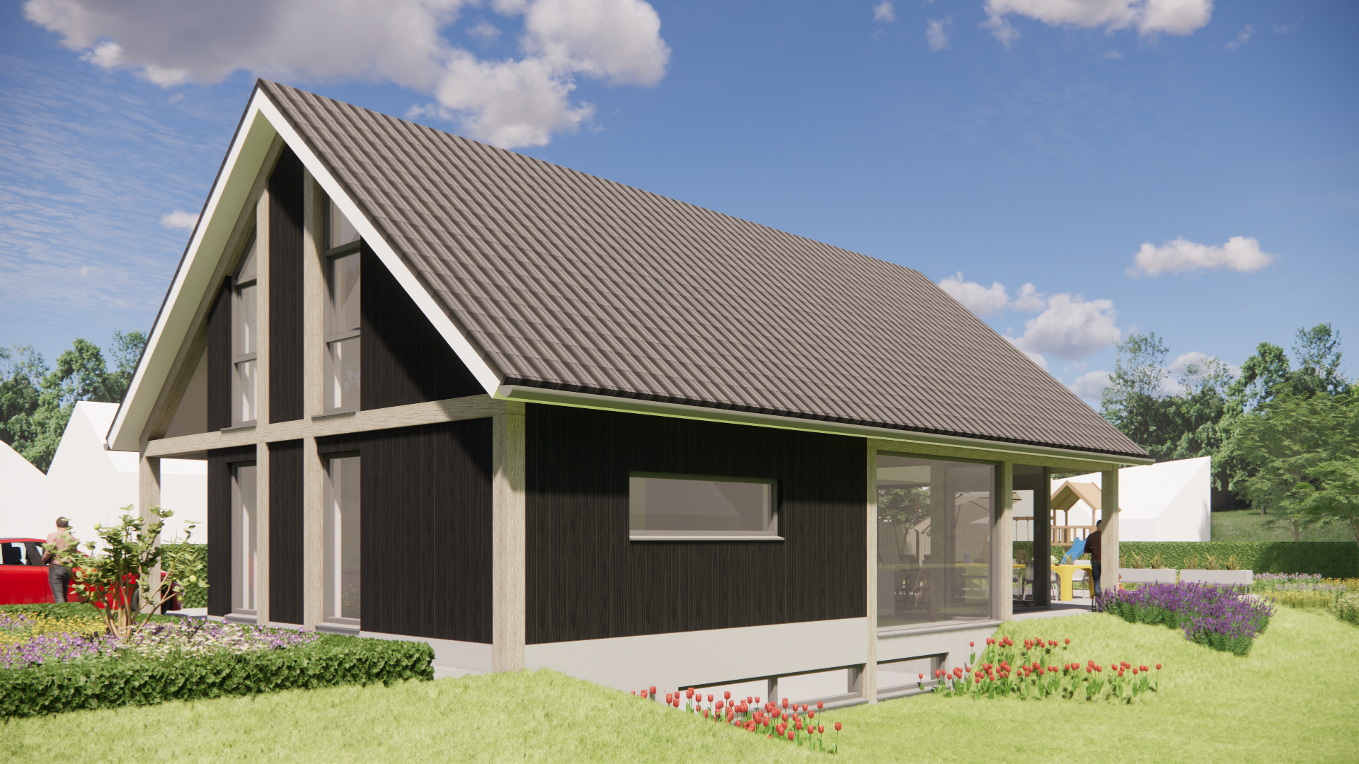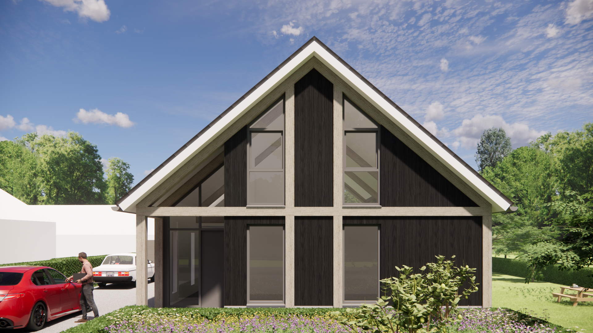 Deze vrijstaande woning combineert moderne vormgeving met een landelijke uitstraling. De houten gevelbekleding, cementplint en robuuste houten balken geven het huis een warme en natuurlijke uitstraling. Grote hoekkozijnen en een overkapt terras zorgen voor een sterke verbinding tussen binnen en buiten. De overdekte entree vormt een uitnodigende toegang tot het huis.