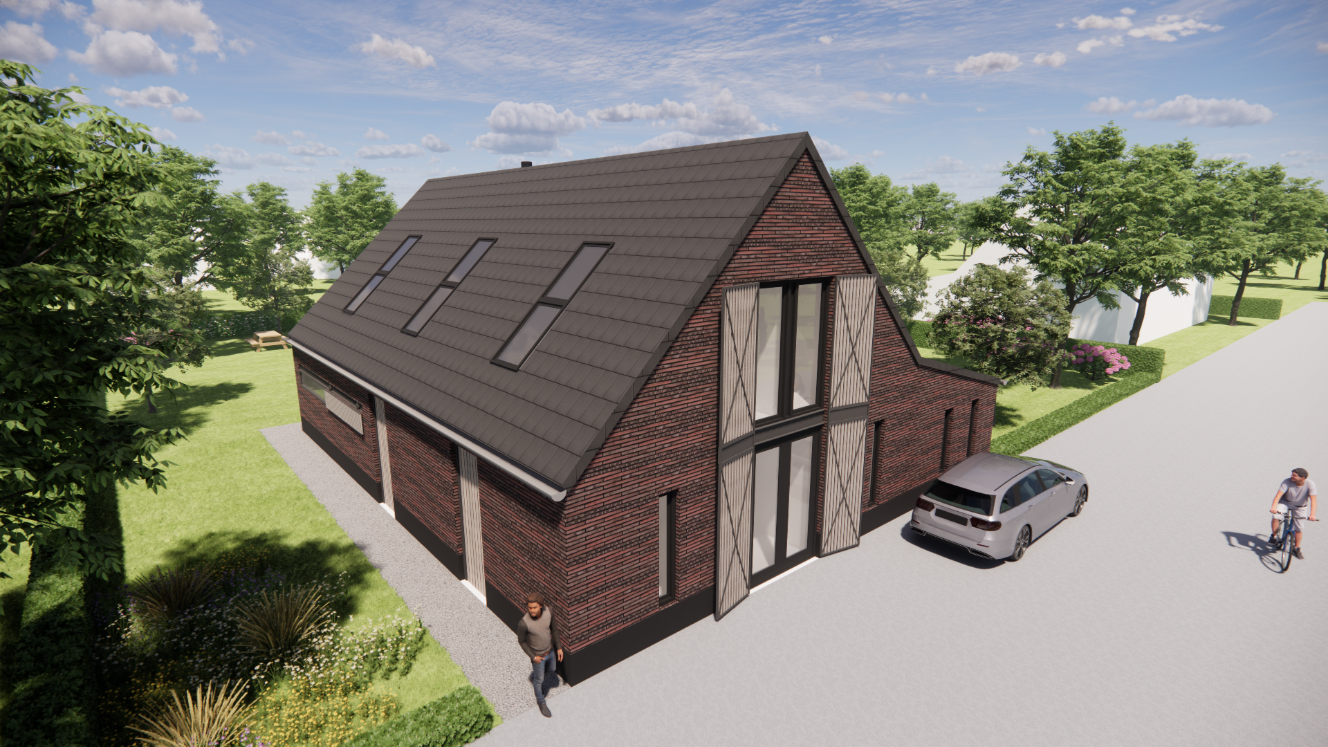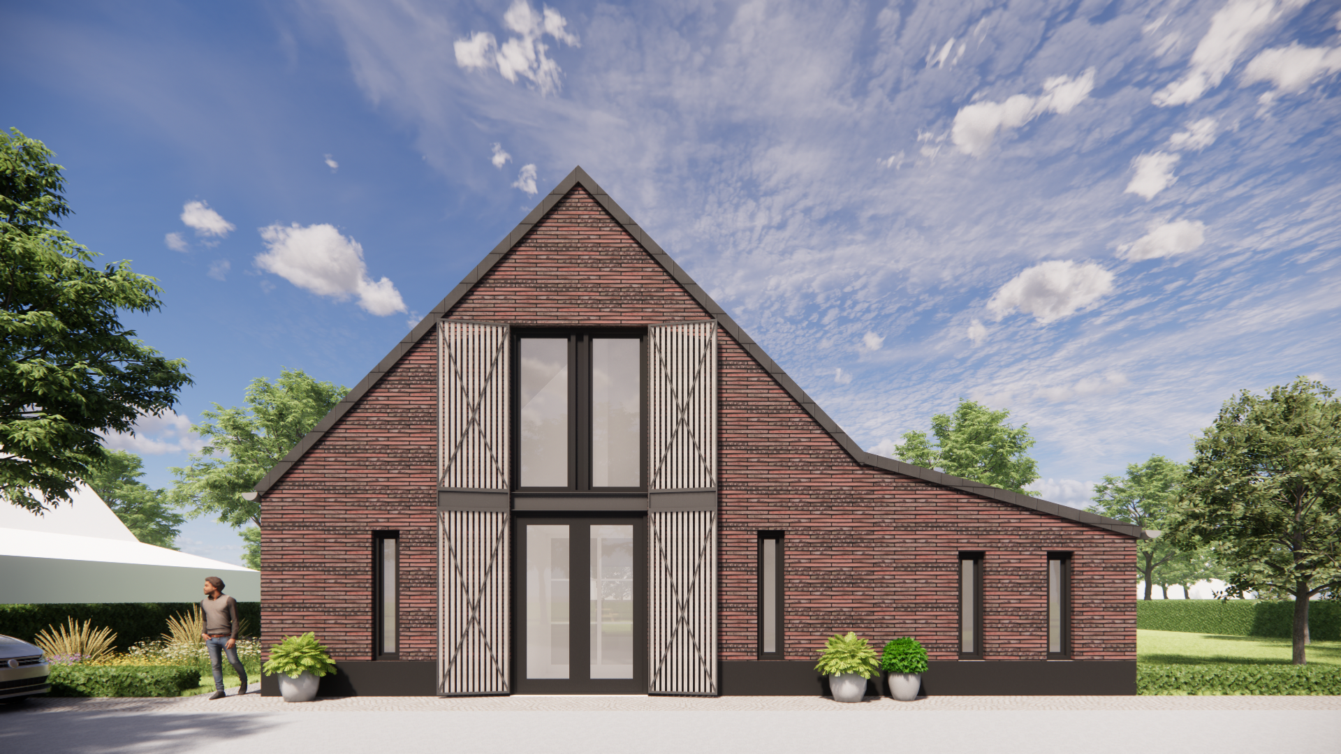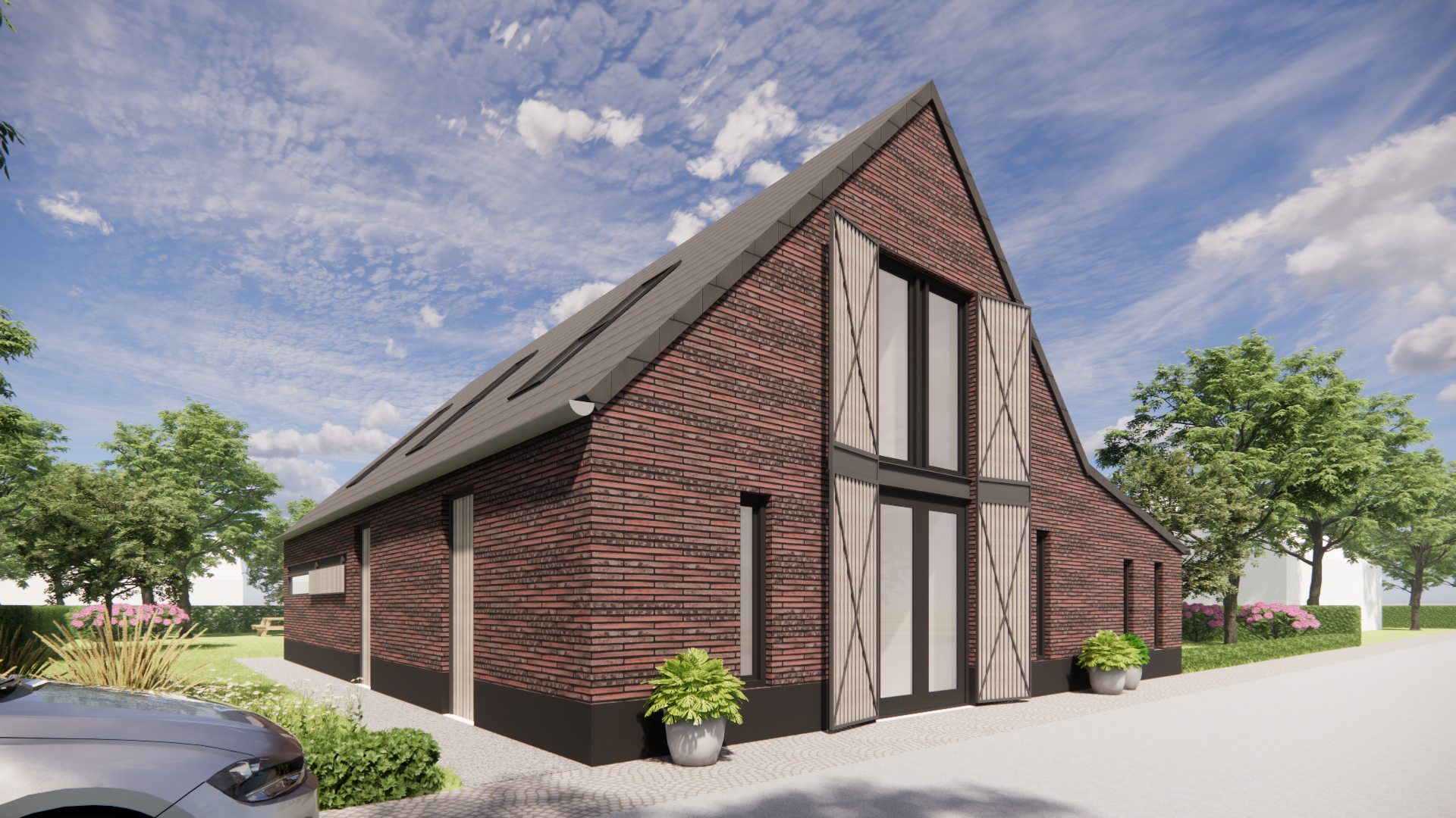 Deze nieuwbouw schuurwoning is vrijstaand en traditioneel gebouwd. Het krachtige volume wordt gevormd door metselwerk gevels en een helder zadeldak met vlakke dakpan. De industriële uitstraling komt terug in het stalen spant. Luiken zorgen voor ritme en warmte in het aanzicht.