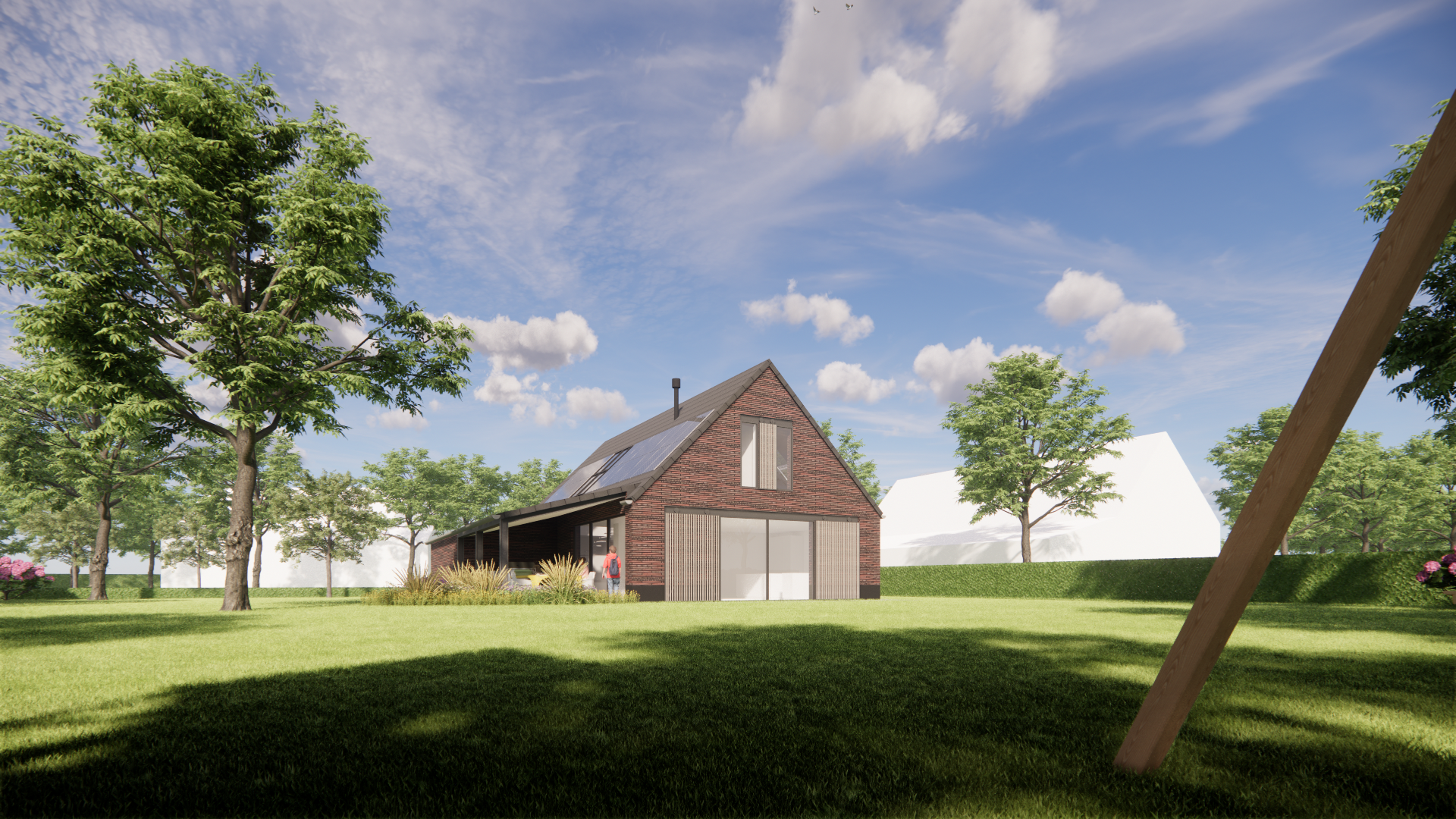 Vrijstaande schuurwoning met metselwerk gevels en zadeldak met vlakke dakpan