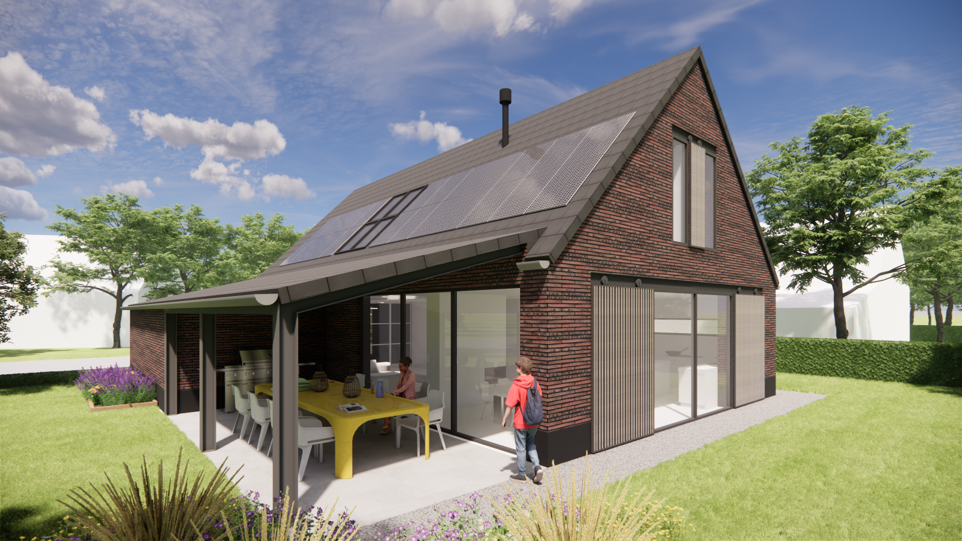 Binnen draait het om beleving. De living heeft een vide voor extra hoogte en daglicht. De trap staat in de living en vormt een rustig middelpunt. Rond het kookeiland ontstaat vanzelf een plek om samen te komen, met korte lijnen tussen koken en eten. De haard brengt sfeer en geborgenheid. Via de overkapping loopt het leven door naar buiten.