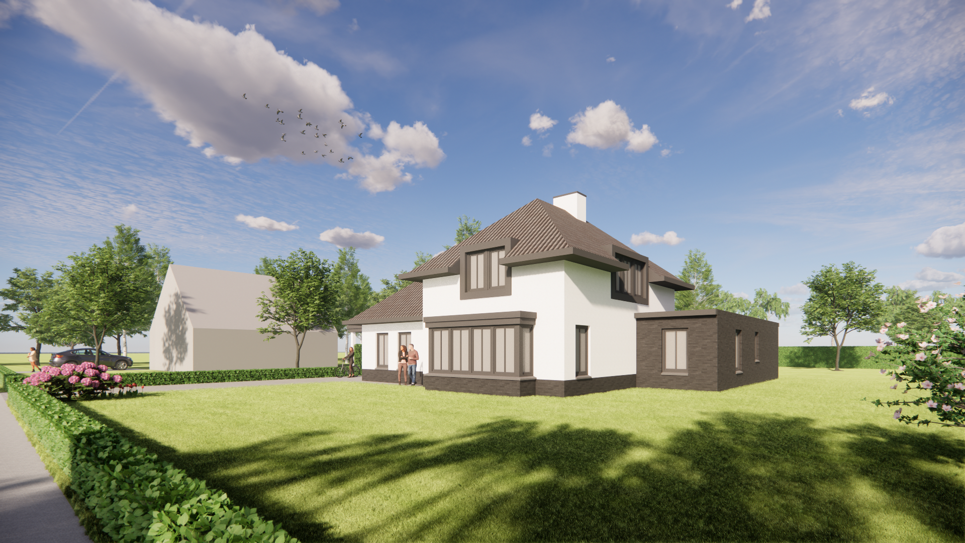 Deze vrijstaande woning valt direct op door zijn krachtige eenvoud. Het klassieke schilddak krijgt extra karakter door royale overstekken en een zorgvuldige detaillering. De combinatie van wit stucwerk met warme houten accenten geeft het geheel een eigentijdse en uitnodigende uitstraling. Door de positionering op de kavel ontstaat rondom een gevoel van rust, privacy en vrijheid.