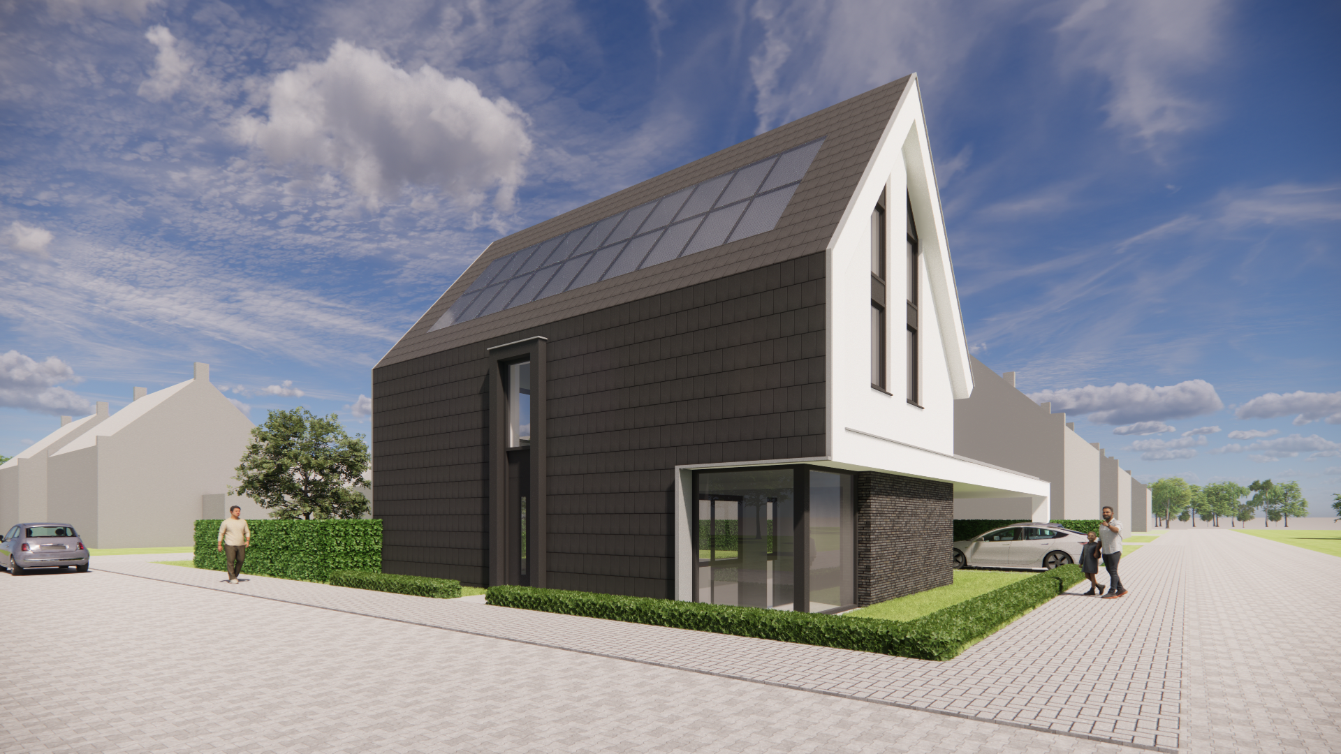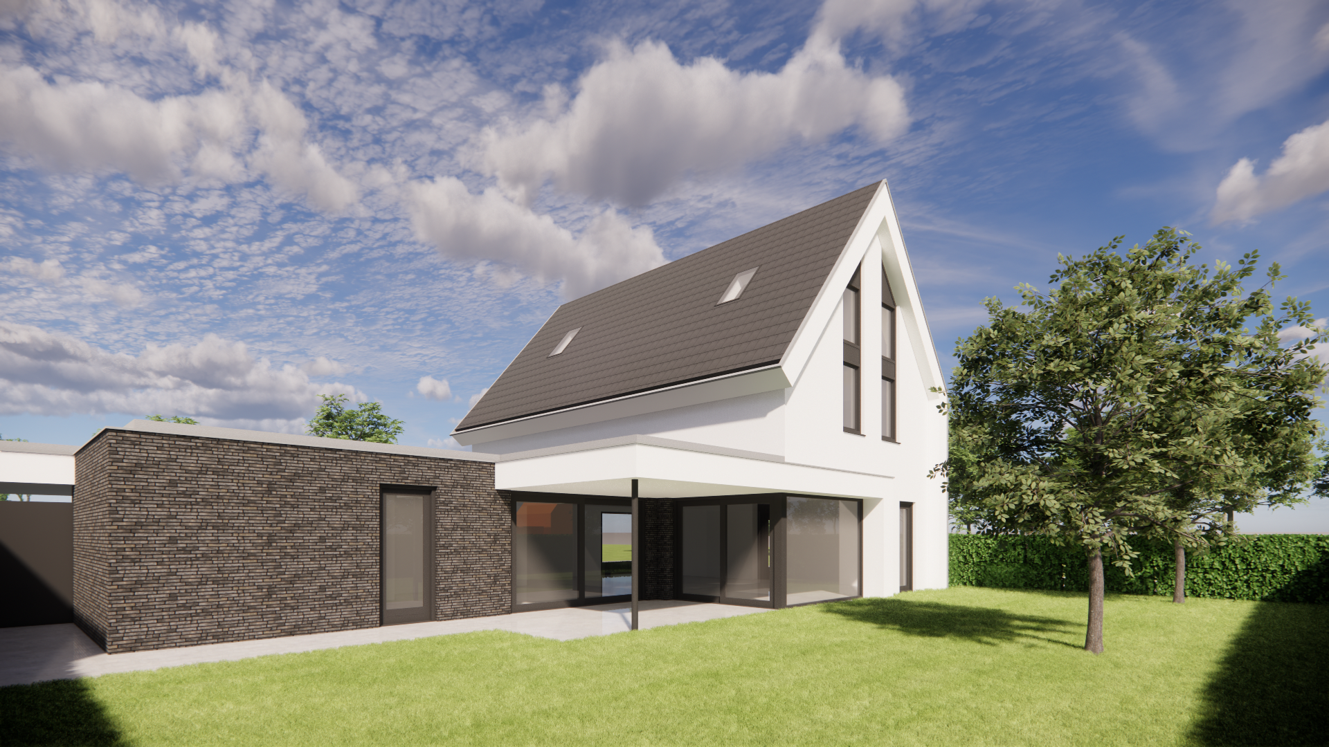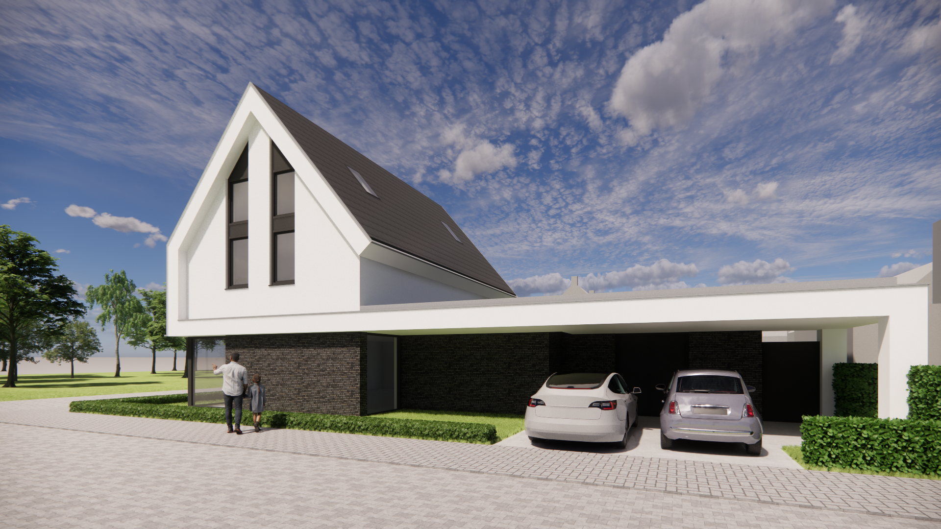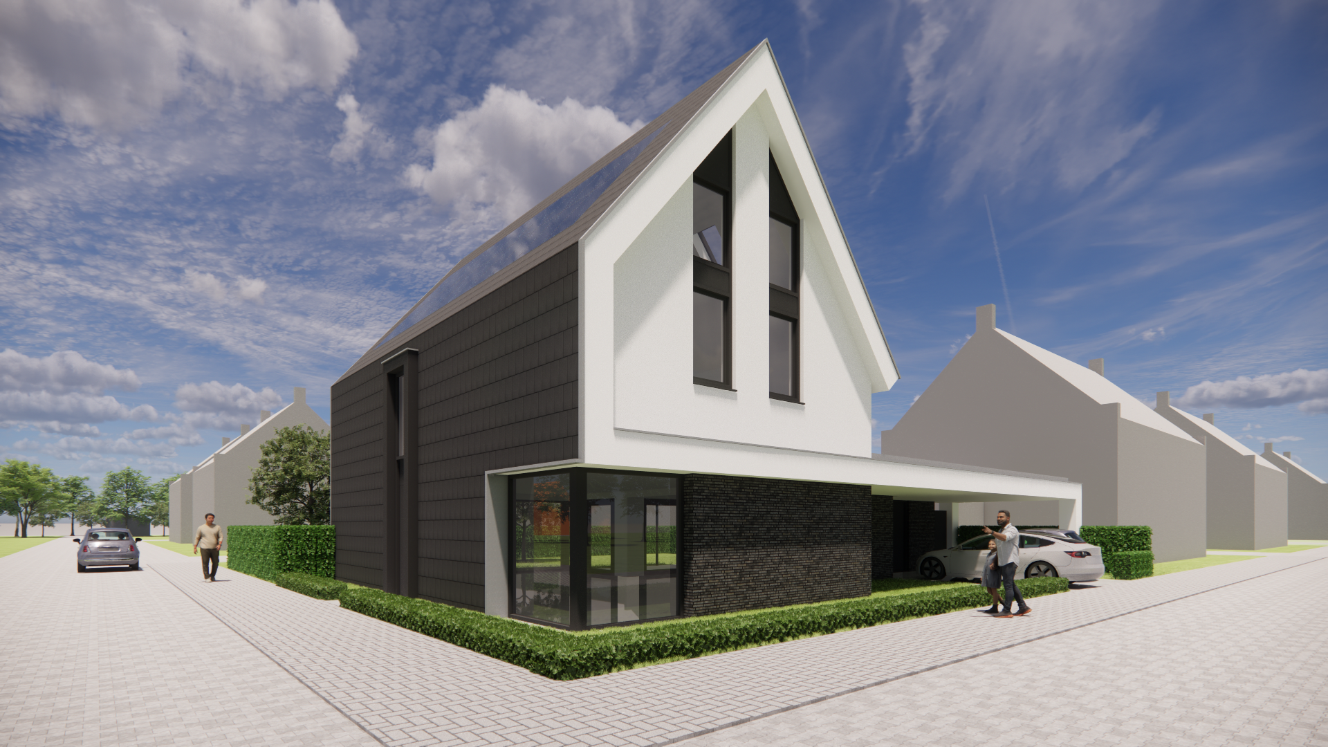 Deze moderne woning valt direct op door de combinatie van strakke lijnen en zachte materialen. De witgepleisterde gevels contrasteren fraai met de donkere vlakke dakpannen, terwijl de royale dakoverstekken het ontwerp een luchtige uitstraling geven. De risaliet aan de voorzijde voegt diepte en karakter toe aan het geheel, zonder de helderheid van het ontwerp te verliezen.
