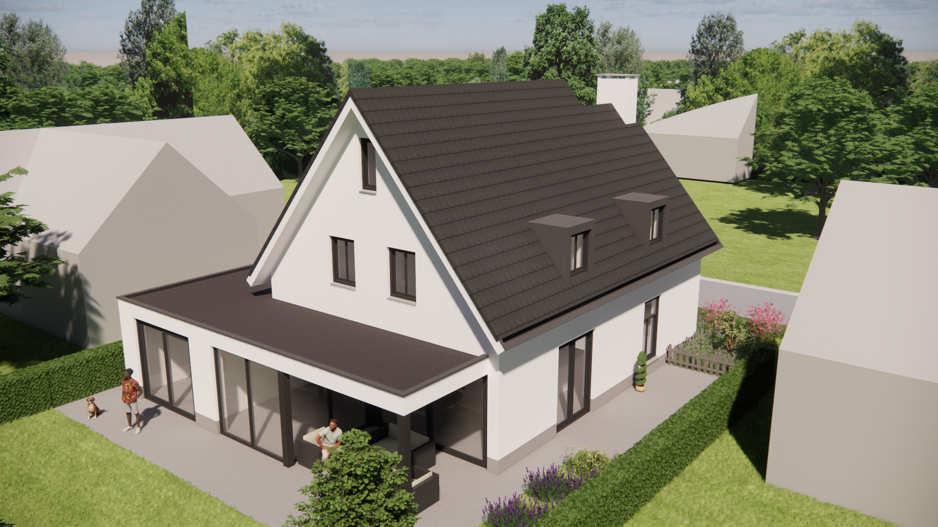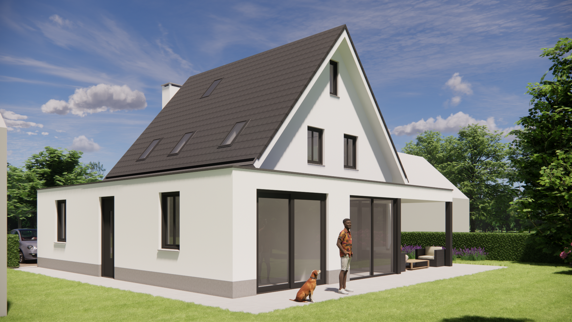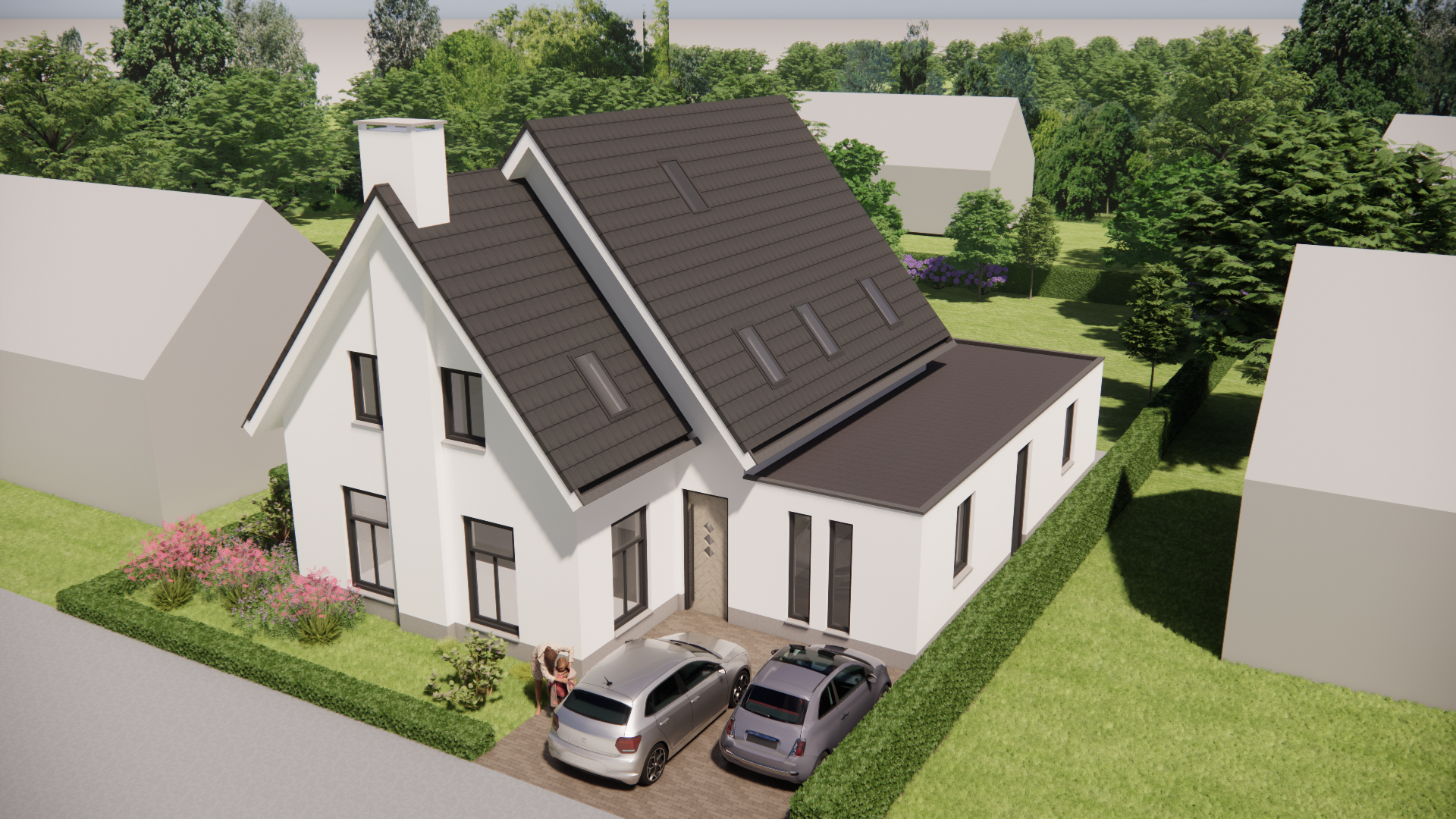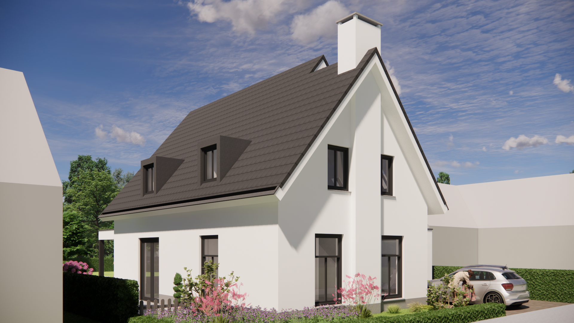 Deze vrijstaande woning combineert moderne vormgeving met een ingetogen materiaalpalet. De gevels zijn strak afgewerkt met wit pleisterwerk, afgezet tegen een donkere cementplint. Het traditionele zadeldak met vlakke dakpannen geeft het huis een vertrouwd silhouet, terwijl subtiele details zoals een verholen dakgoot, betimmerde goot en een klassieke schoorsteen zorgen voor een verfijnde uitstraling. De houten kozijnen dragen bij aan de warme sfeer die in en om de woning voelbaar is.