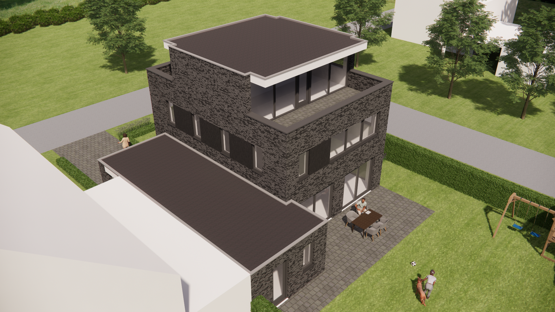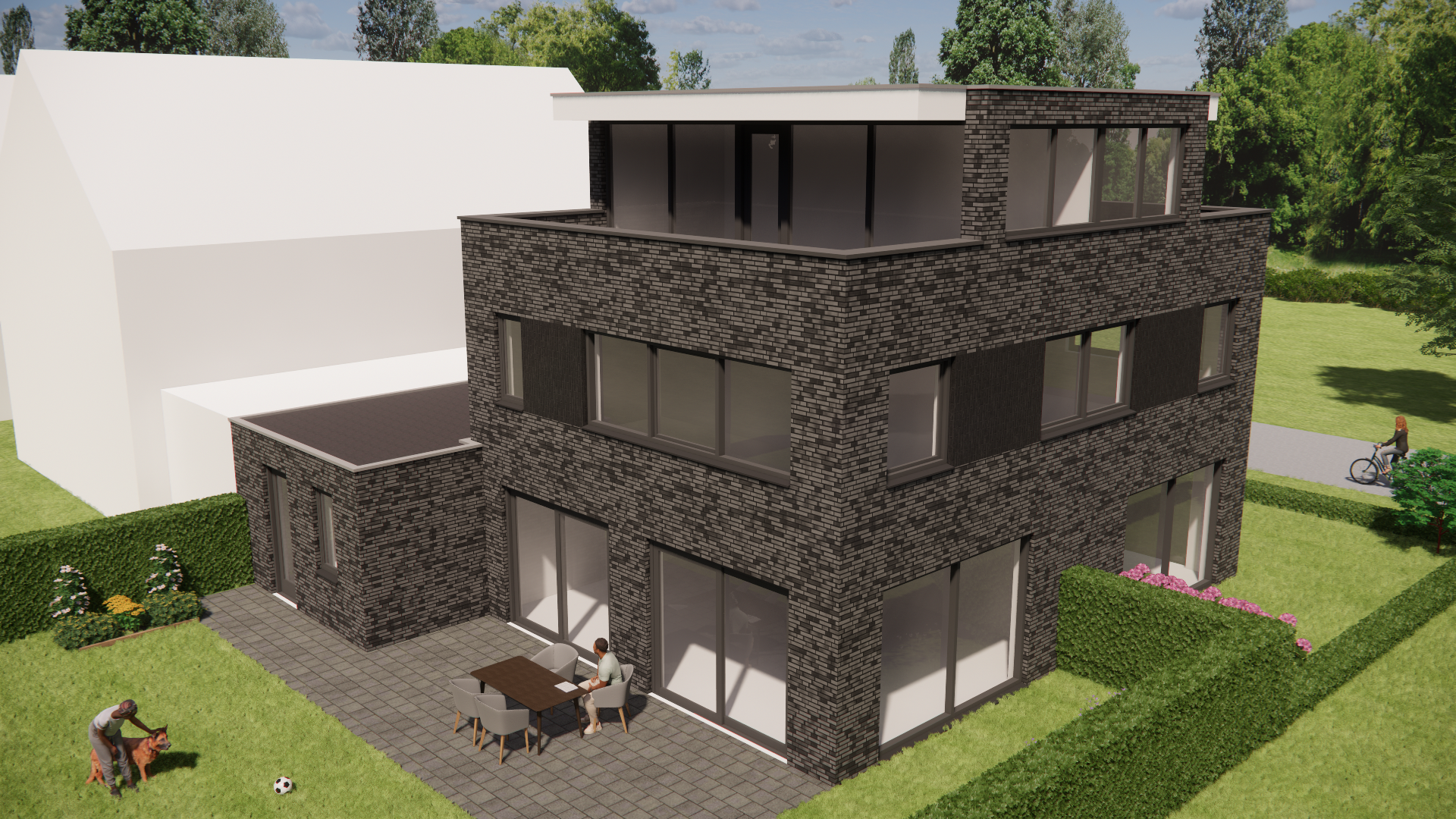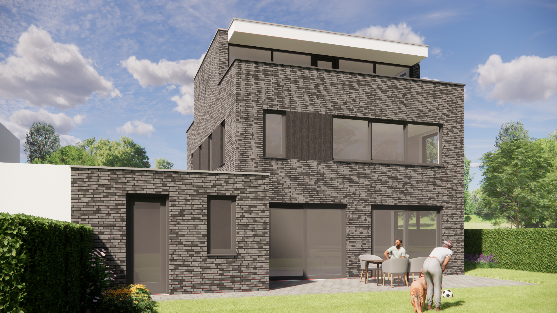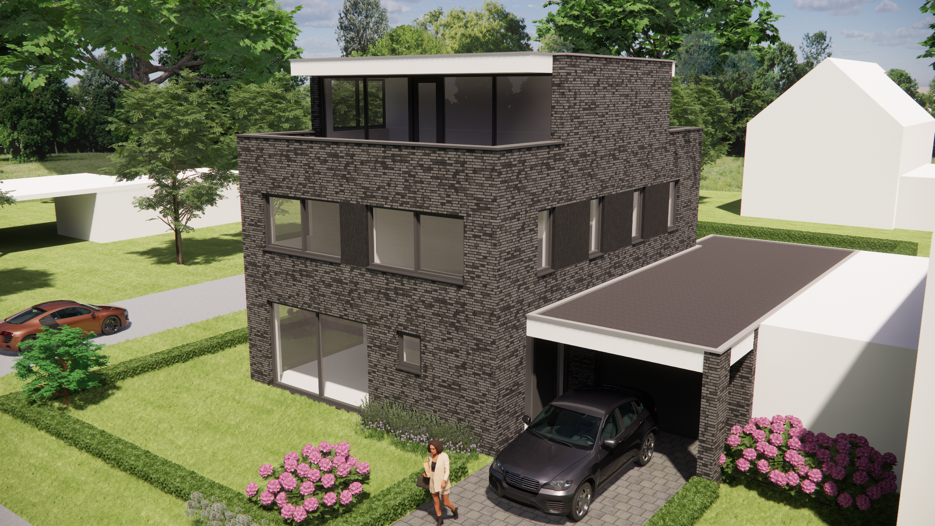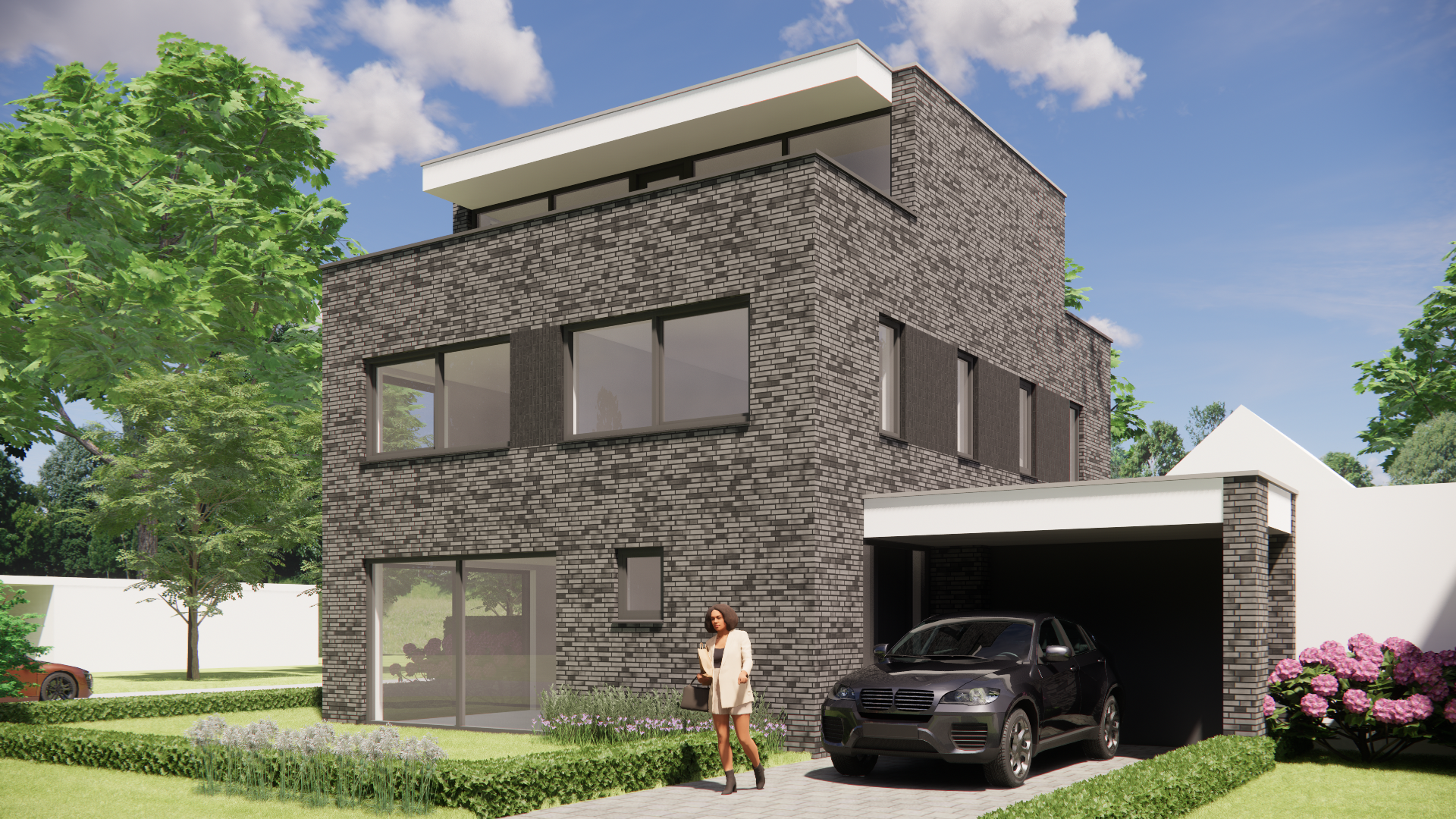 Kubistische vrijstaande woning met zwart en grijs metselwerk, plat dak en dak overstek
