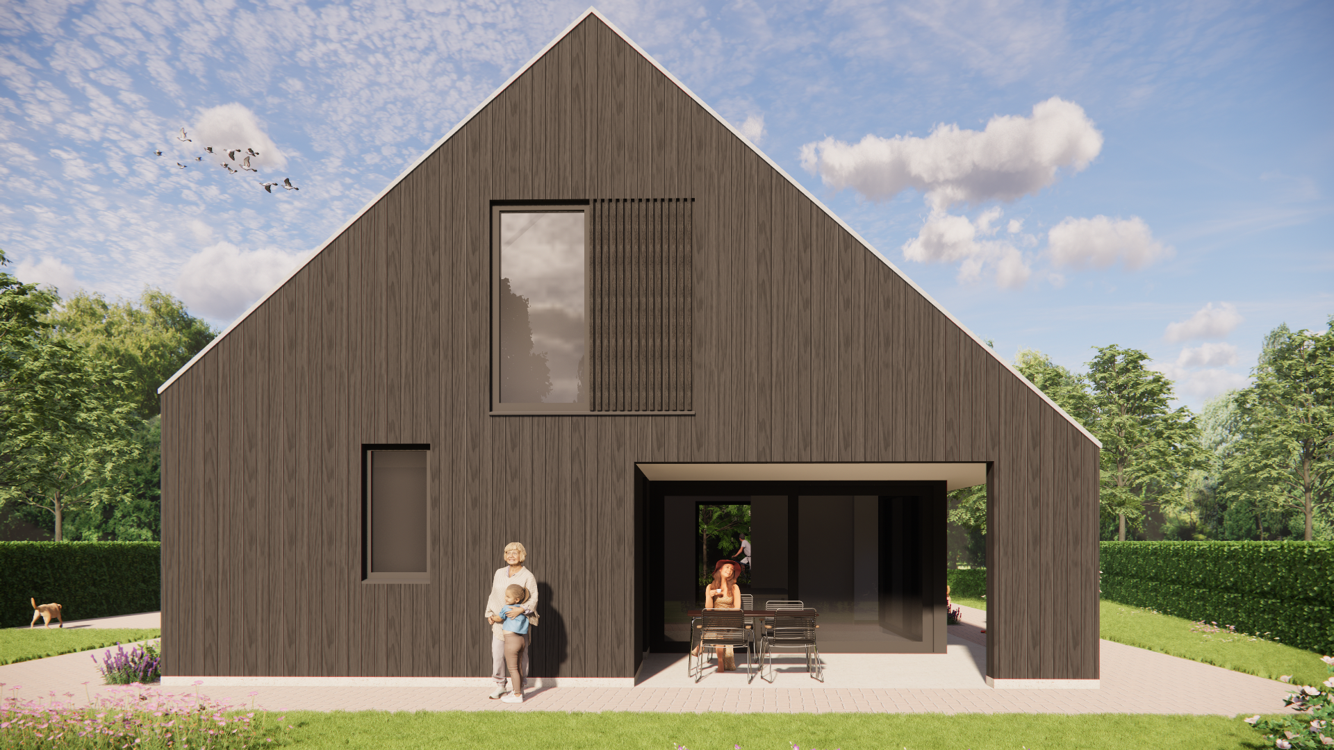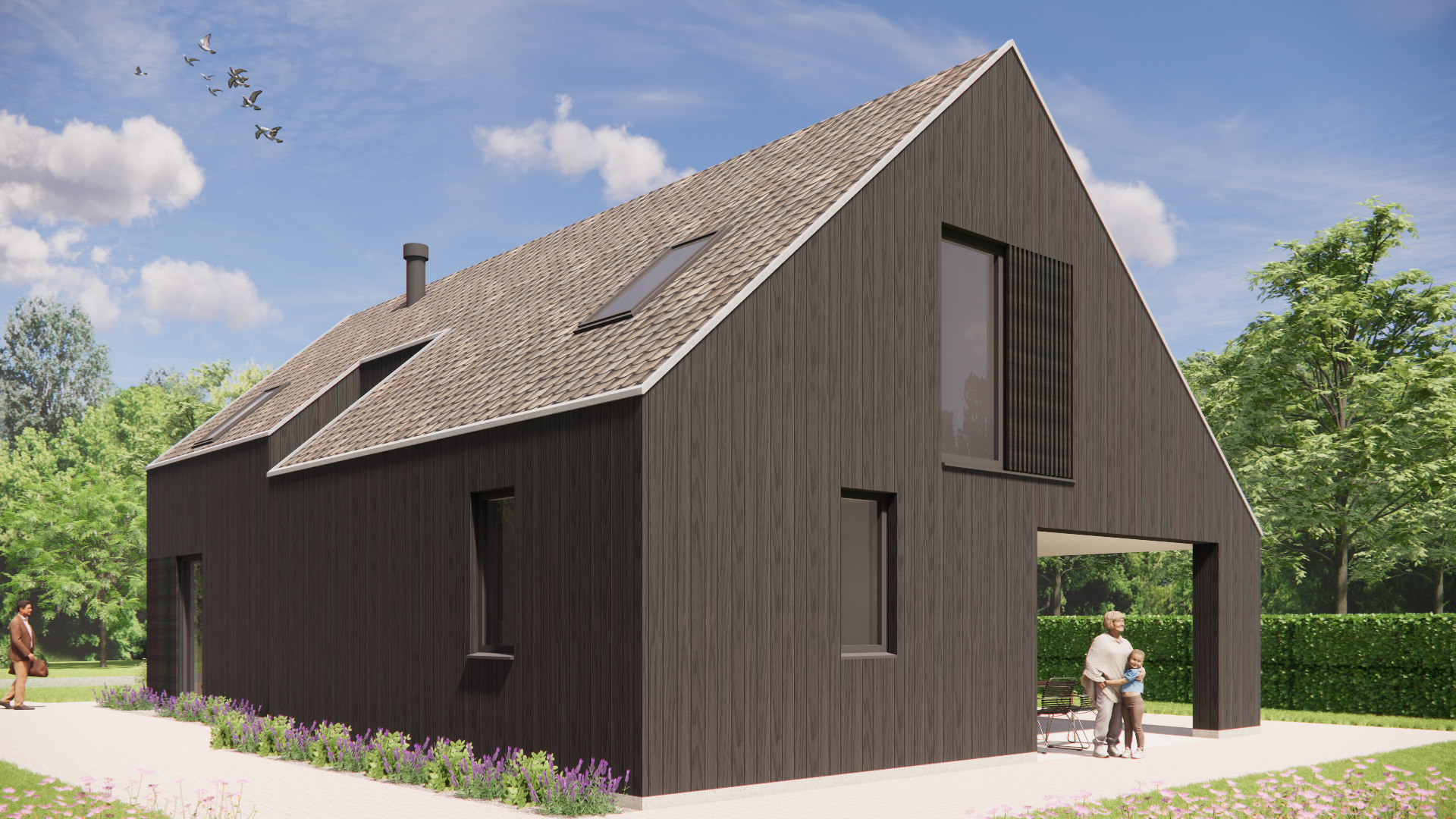 Deze landelijke schuurwoning straalt rust en helderheid uit. De natuurlijke houten gevels en het karakteristieke zadeldak met gegolfde dakpannen zorgen voor een vertrouwd en krachtig silhouet. De verholen dakgoot en buiten shutters versterken het ambachtelijke karakter en maken het geheel tot een harmonieus geheel. Het overdekte terras nodigt uit om het hele jaar door van het buitenleven te genieten.