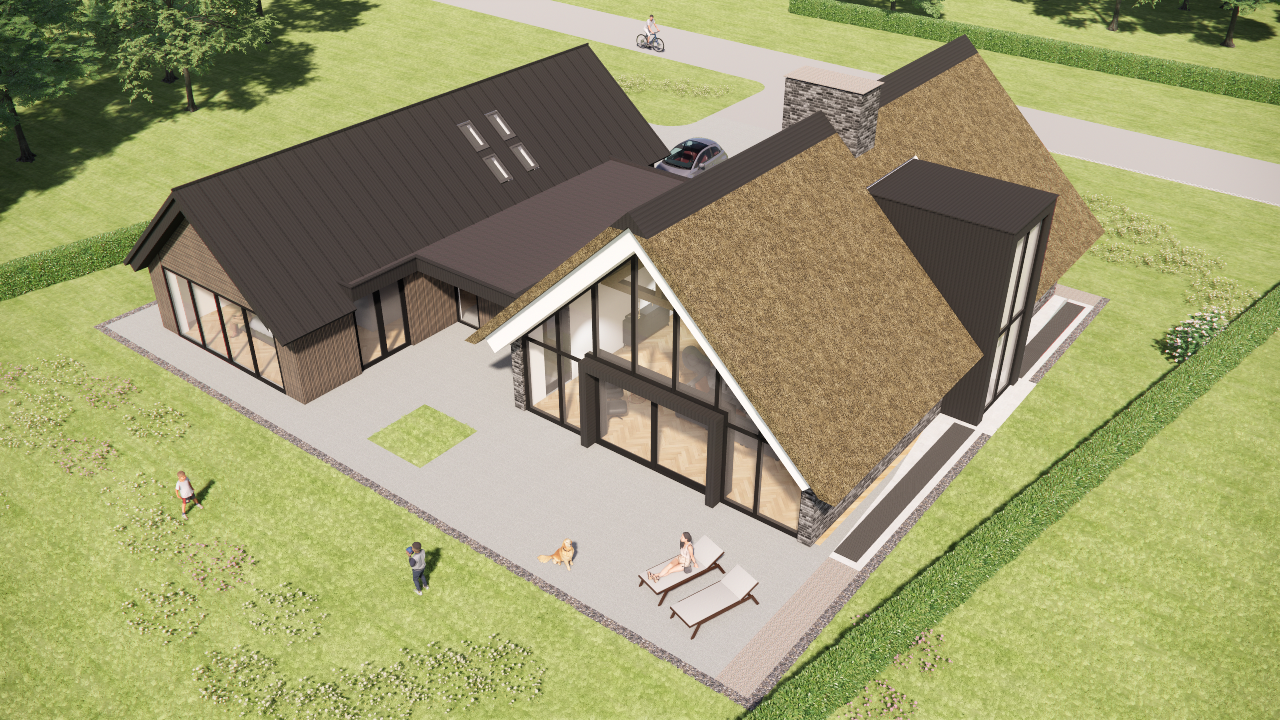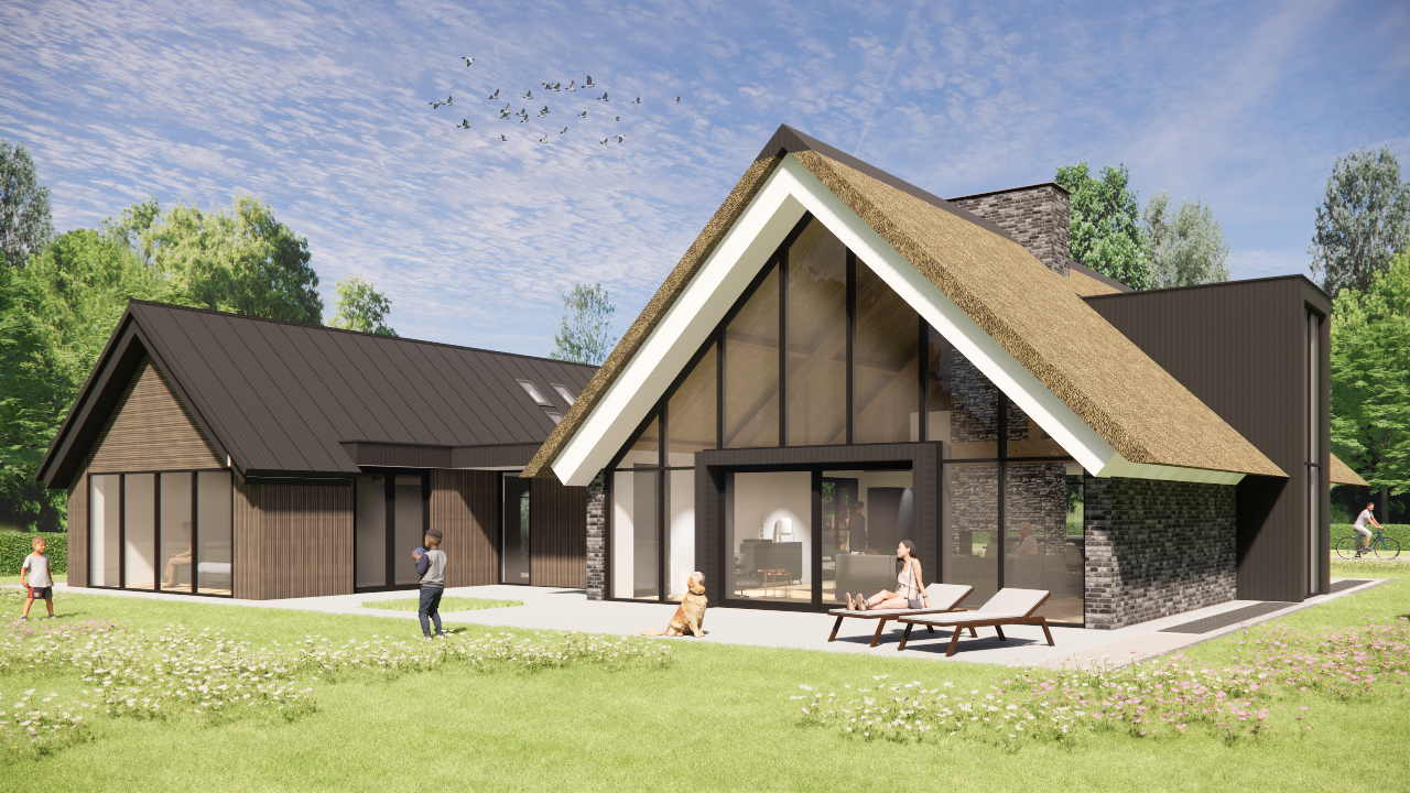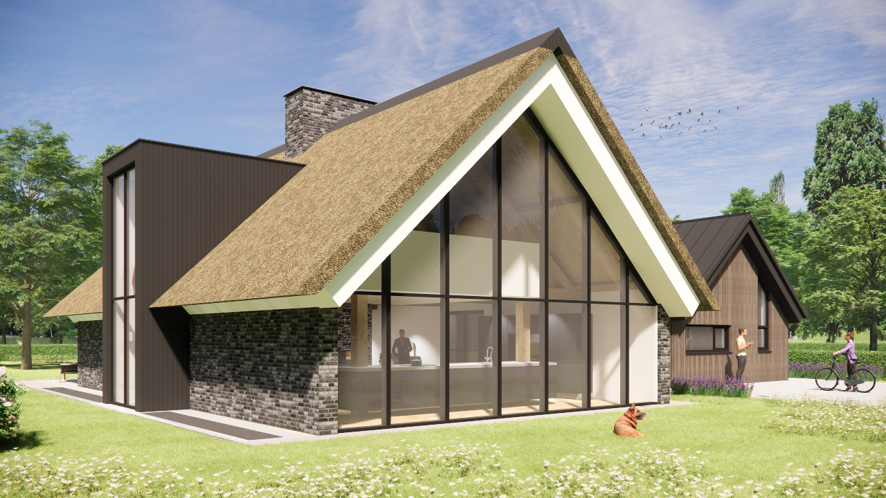 Landelijke villa met rieten zadeldak, houten accenten en risaliet