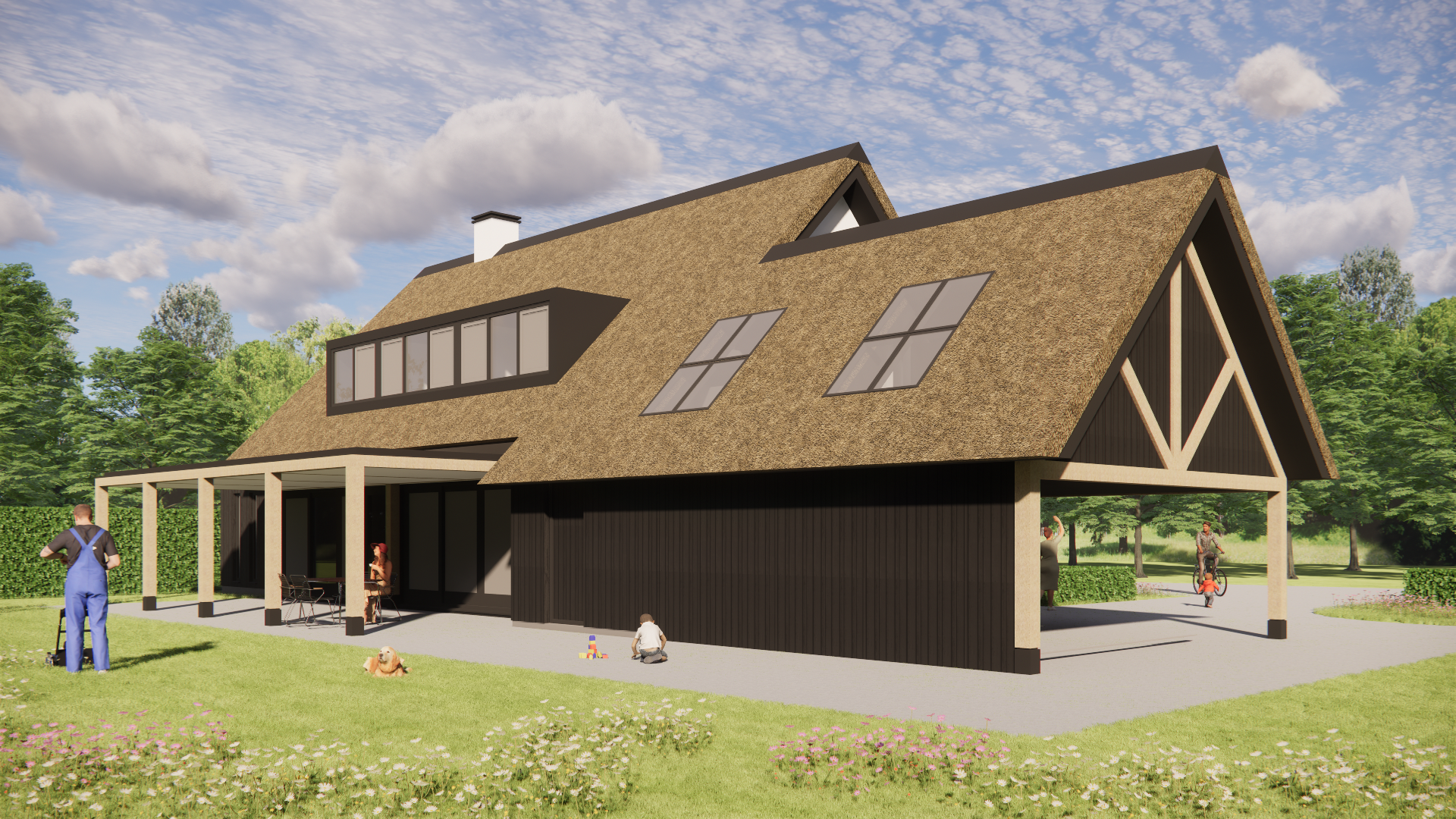 Landelijke woning met rieten kap, witte gevels en houten accenten