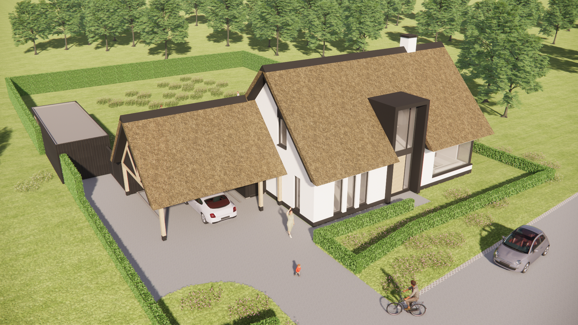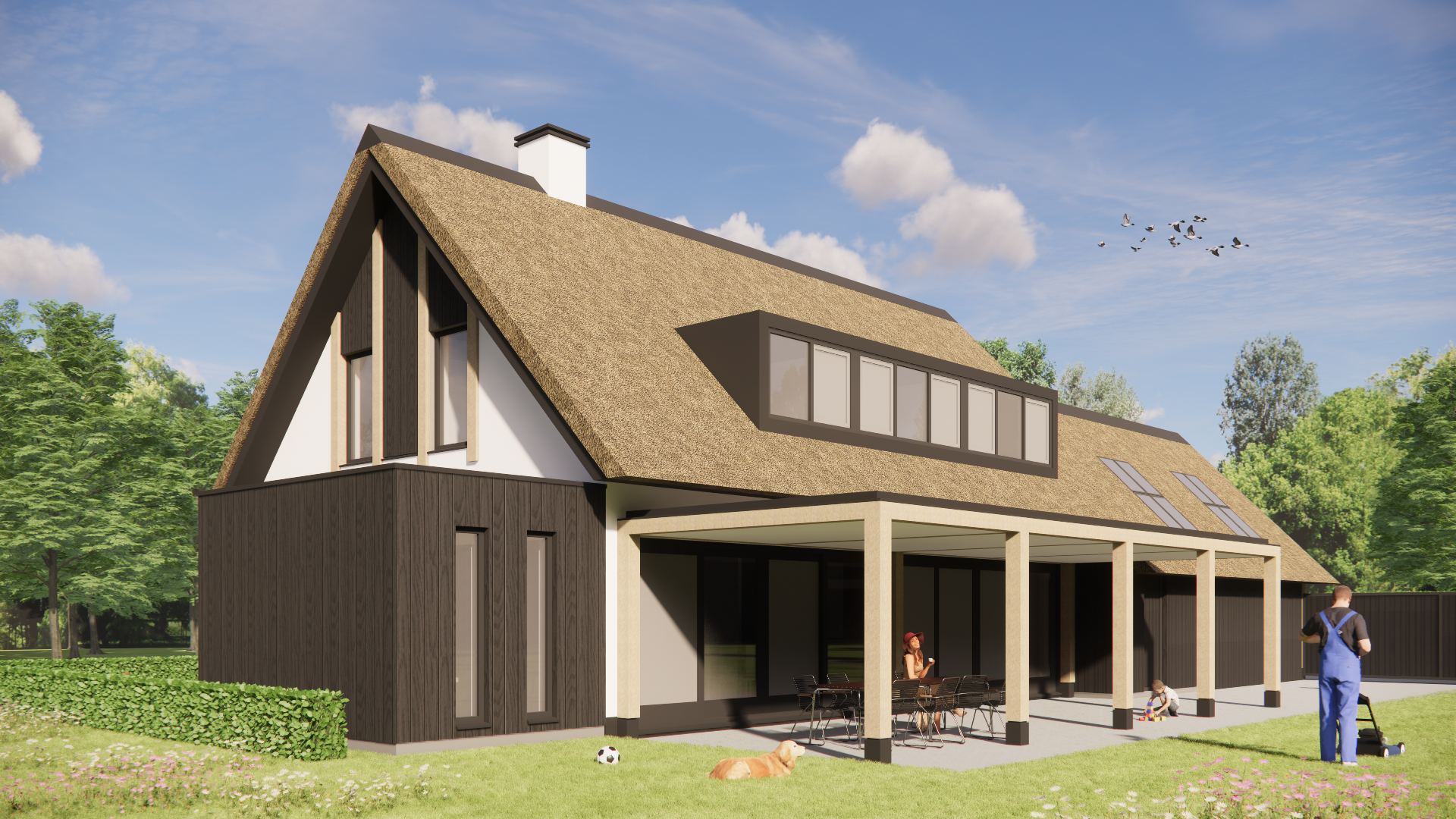 Deze woning combineert een heldere vormtaal met natuurlijke materialen. Het traditionele zadeldak is bekleed met riet, wat warmte en karakter toevoegt. Daaronder zorgen strakke witte gevels en houten details voor een eigentijdse uitstraling. De woning staat vrij op een ruim perceel, met volop ruimte rondom voor uitzicht, rust en privacy.