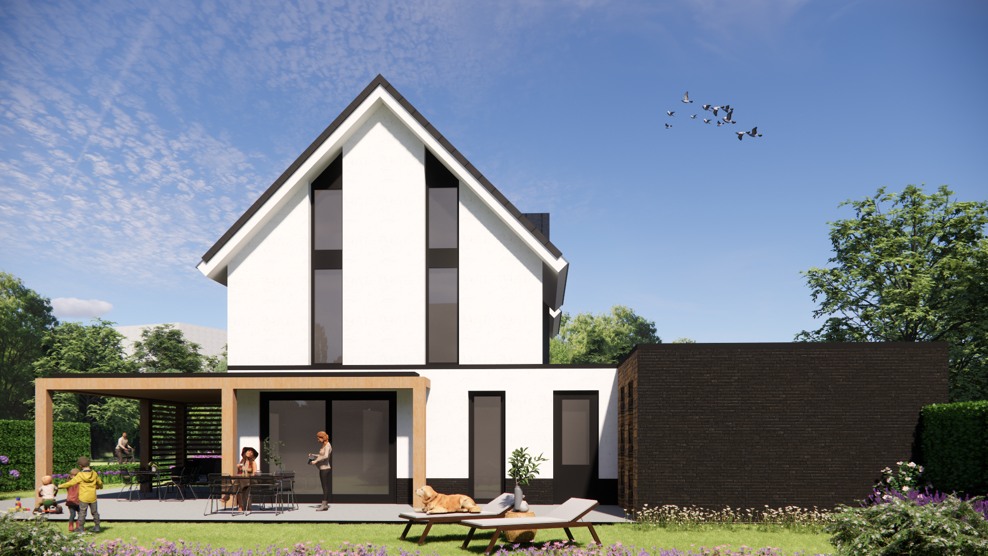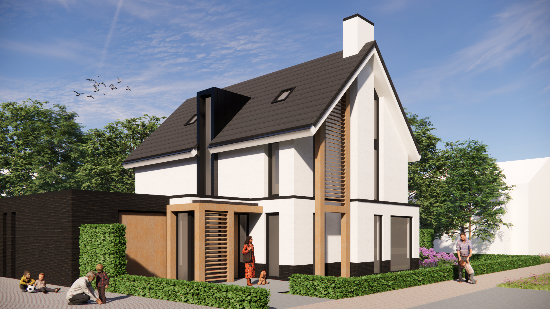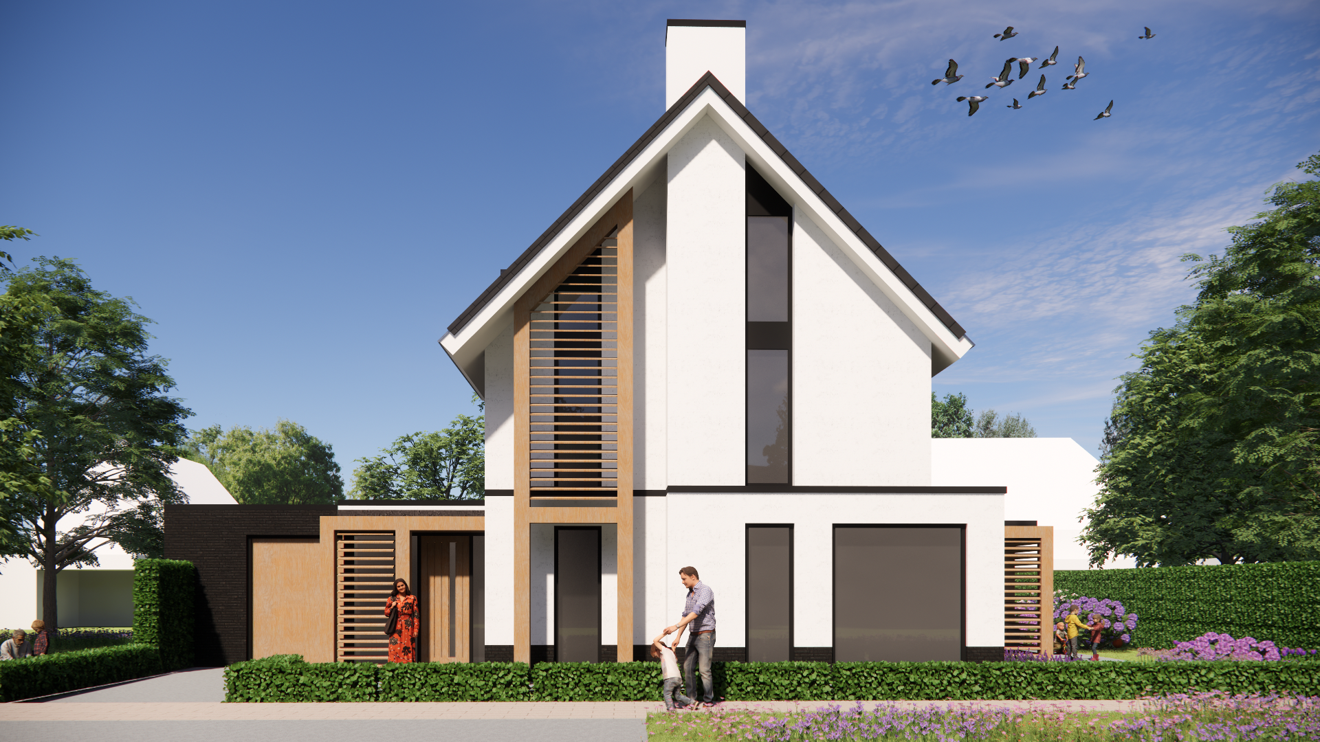 Deze eigentijdse woning straalt rust en helderheid uit. De combinatie van wit pleisterwerk, vlakke dakpannen en warme houten details zorgt voor een krachtig en evenwichtig beeld. Royale overstekken, een markante schoorsteen en houten buitenluiken geven de woning karakter en diepte. Dankzij de grote overkapping en de overdekte entree ontstaat er een natuurlijke overgang tussen binnen en buiten – comfortabel én uitnodigend.