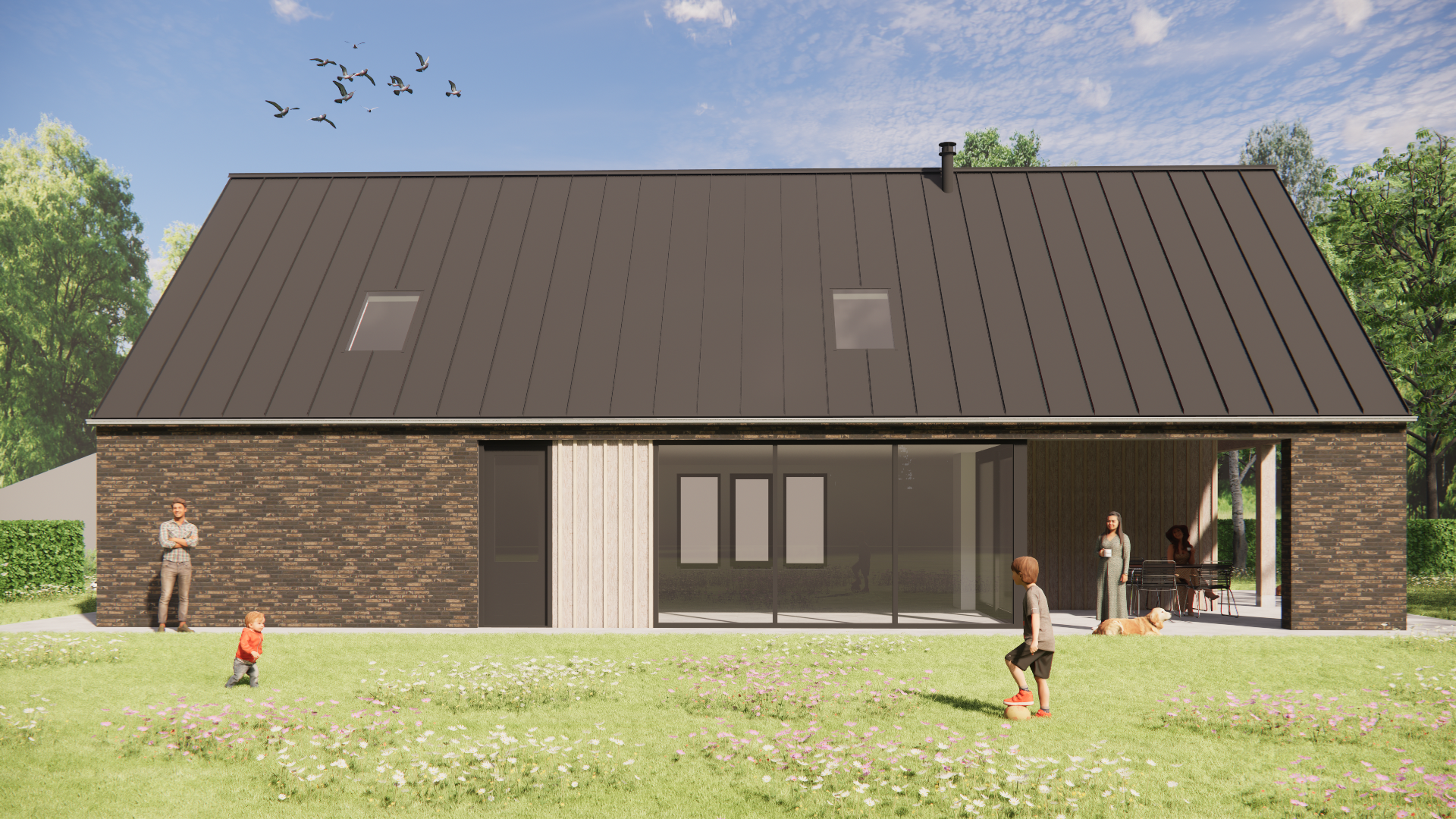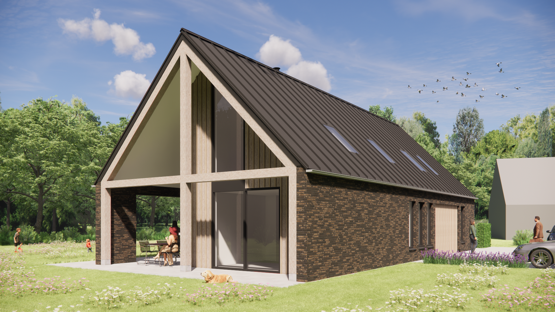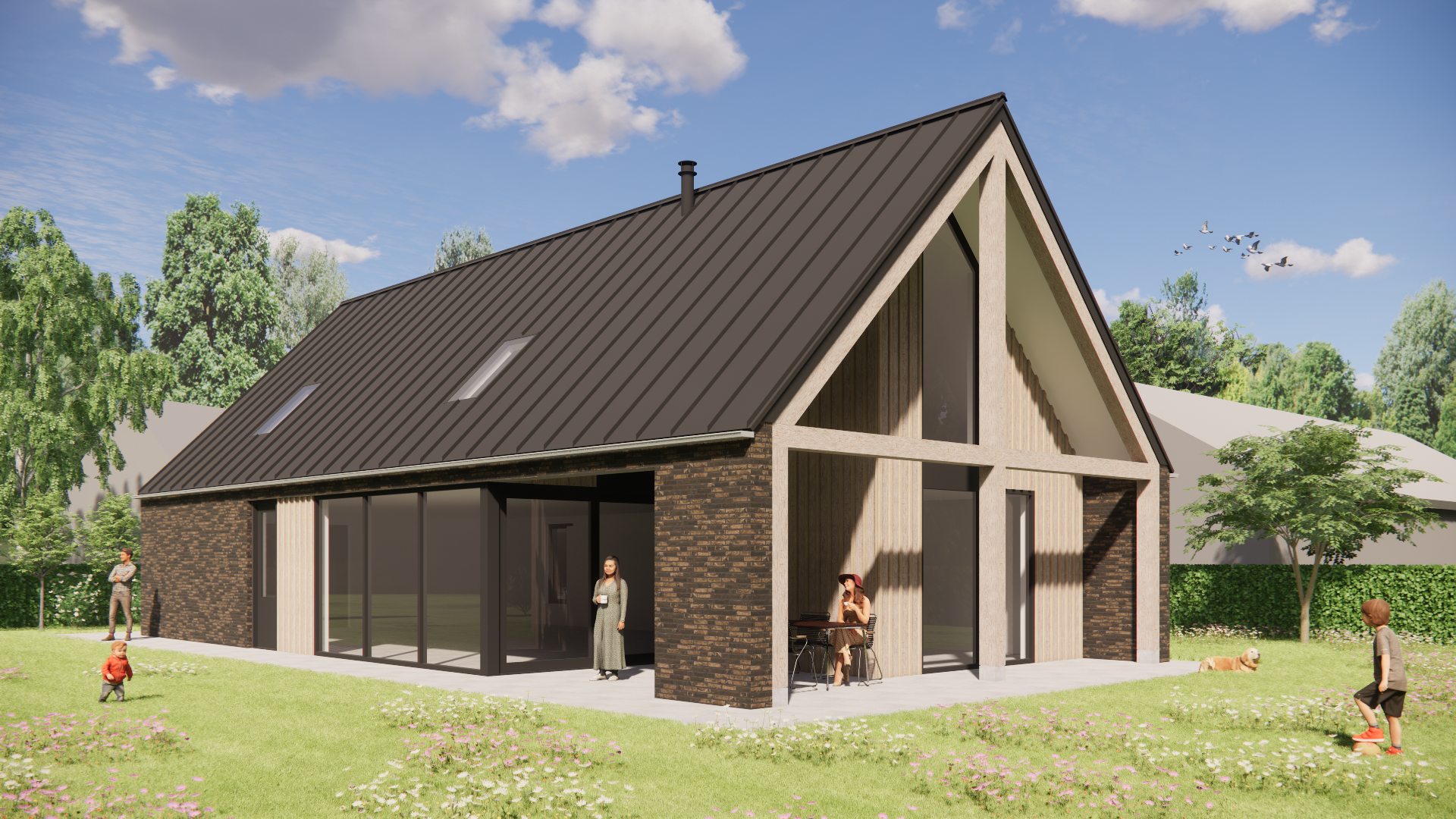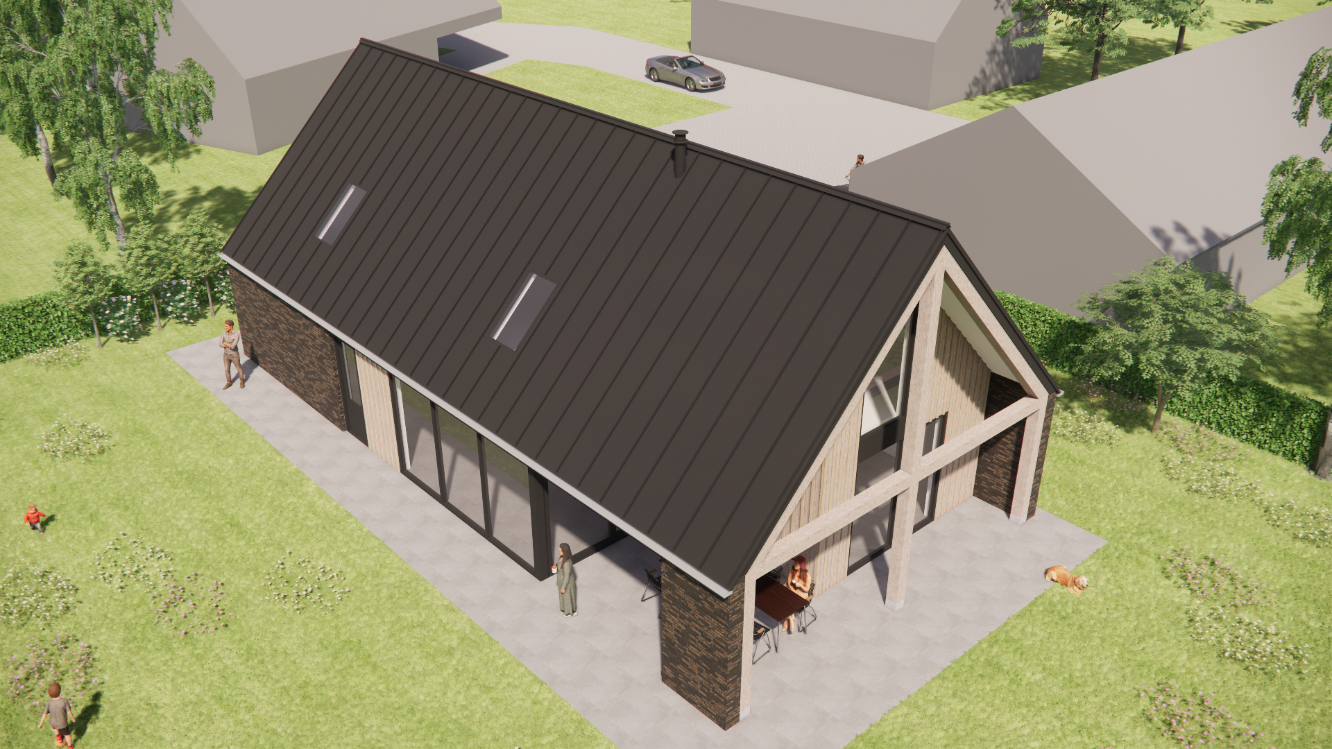 Schuurwoning met houten gevels, metalen zadeldak en overdekt terras