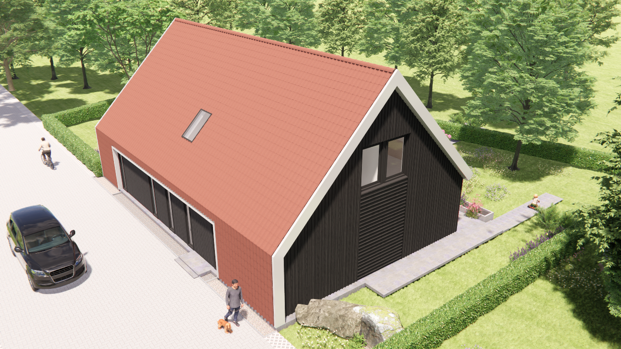 Deze schuurwoning combineert landelijke charme met een doordacht ontwerp. De warme houten gevels sluiten naadloos aan bij het ritme van het zadeldak met rode gegolfde dakpannen. Een opvallend detail is de betimmerde goot, die zorgt voor een verfijnde afwerking. Het ontwerp past perfect in zijn omgeving en straalt rust en eenvoud uit, zonder saai te worden.
