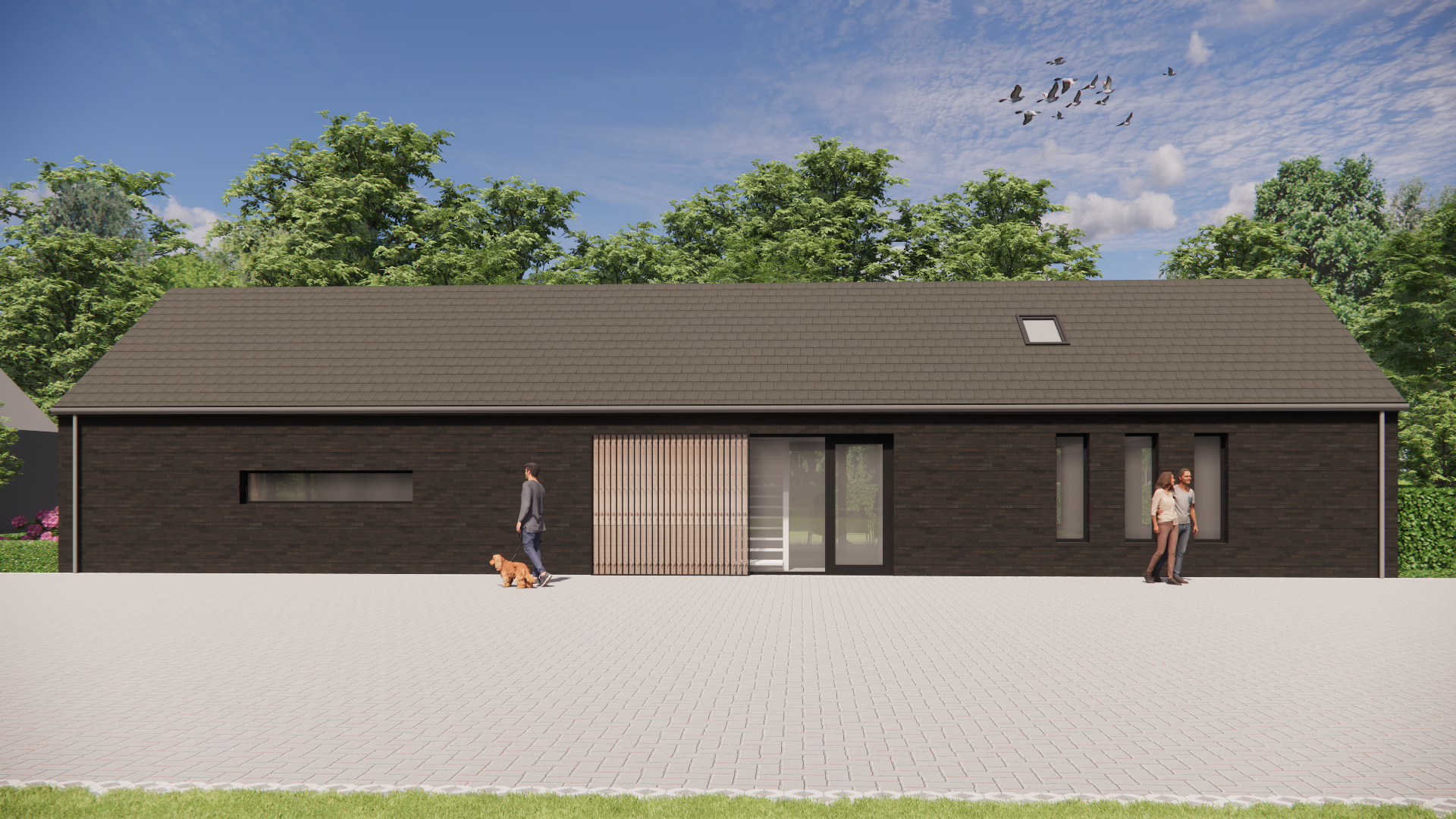 In een landelijke setting is deze levensloopbestendige schuurwoning gerealiseerd. Het traditionele zadeldak met vlakke dakpannen geeft het huis een heldere vorm, terwijl de houten balken en shutters voor warmte en karakter zorgen. De metselwerkgevel sluit naadloos aan op de natuurlijke omgeving en versterkt het robuuste, eerlijke karakter van het ontwerp.