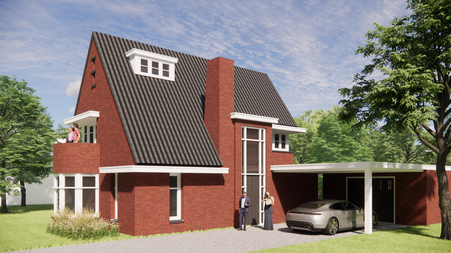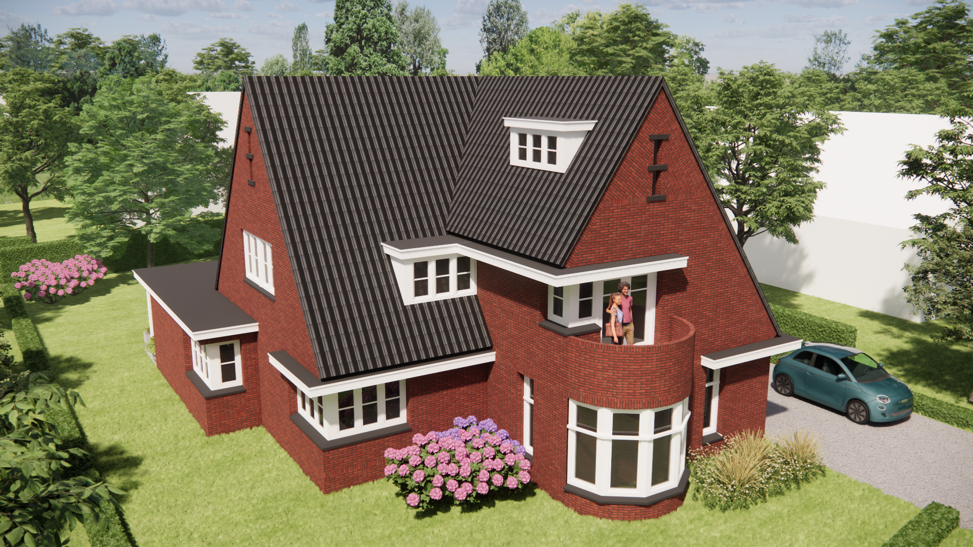 Deze nieuwbouw laat de charme van de jaren 30 terugkomen in een tijdloze vorm. Het metselwerk en het zadeldak met gegolfde dakpannen geven een rustig en herkenbaar silhouet. Subtiele details als de dakkapel, erker en risaliet versterken het karakter. De verholen en betimmerde goot, de schoorsteen en het hoekkozijn zorgen samen voor een verfijnde afwerking.