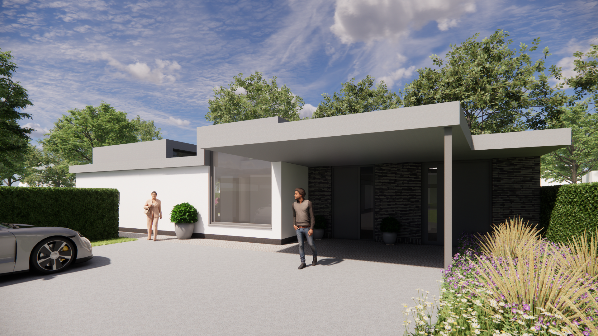 De overkapping met overdekt terras verlengt de leefruimte naar buiten. De overdekte entree zorgt voor een prettige, droge ontvangst en voegt een stijlvol detail toe aan het geheel.